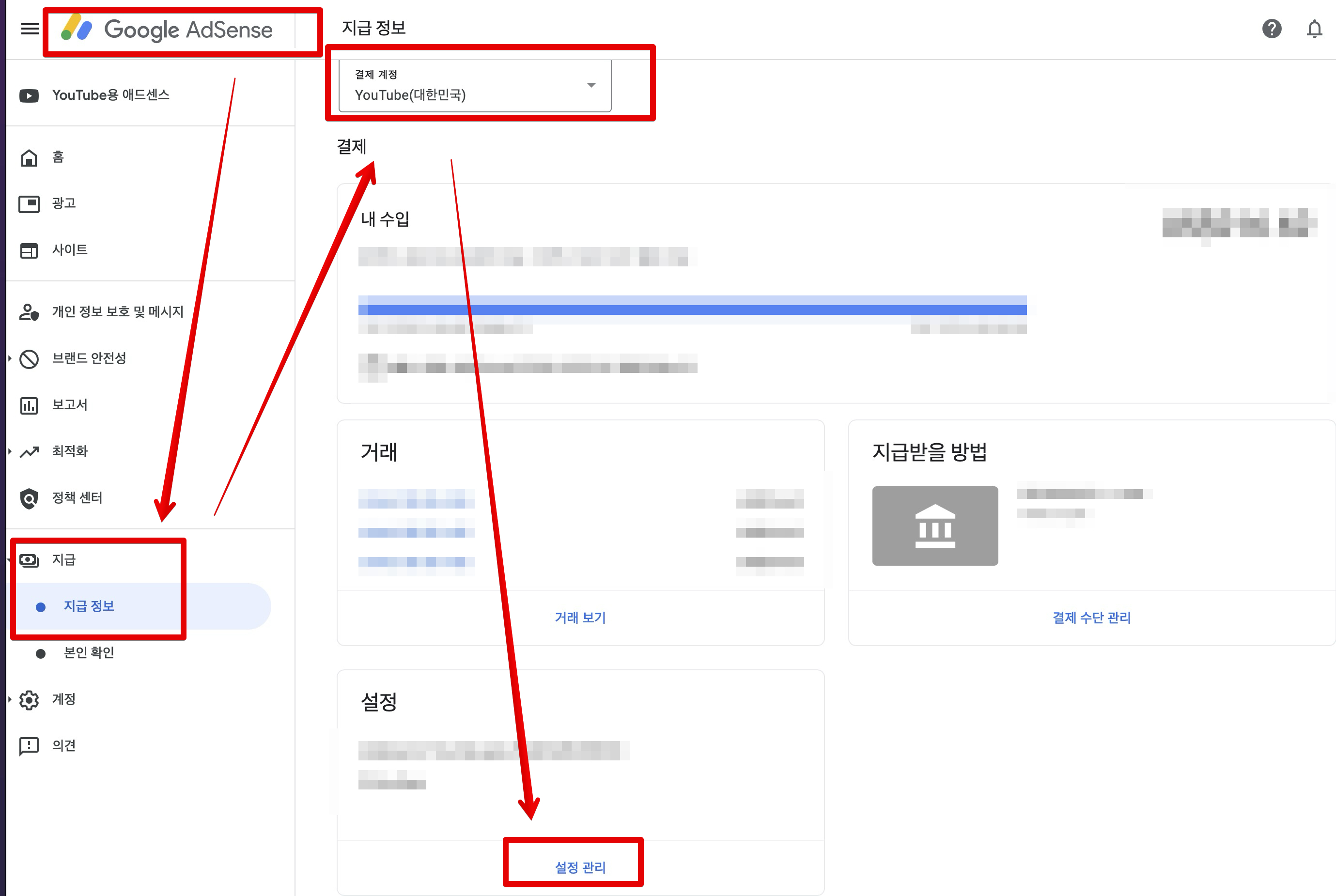 일단 제일 먼저 구글 애드센스 페이지로 들어갑니다. 이후 왼쪽 메뉴에서 [지급]을 찾고 [지급 정보]를 클릭합니다. 만약 저처럼 티스토리 블로그와 유튜브 등 양쪽에서 구글 애드센스를 이용해 수익창출을 하고 있으신분들이라면 상단에 결제 계정이 [구글 애드센스]와 [유튜브 대한민국]으로 구분돼 있을텐데요. 제가 직접 확인해보니까 지급 정보는 한 번 입력하게되면 양쪽에 모두 적용되었어서 결제 계정을 변경하지 않고 진행해도 무방할 것 같습니다.