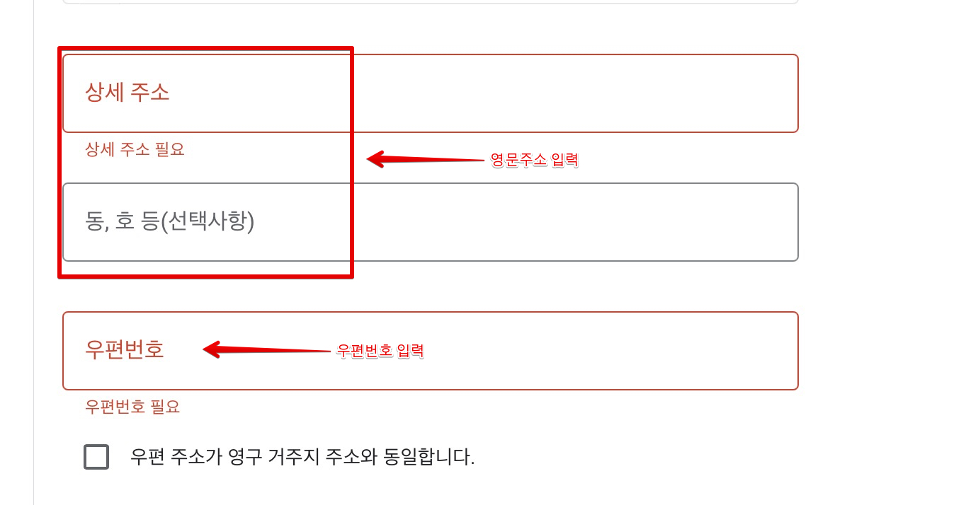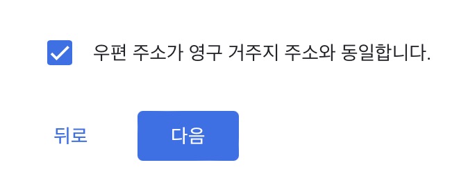 그리고 아래쪽에 우편 주소가 영구 거주지 주소와 동일합니다에 체크하면 주소지와 거주지를 똑같게끔 자동 입력됩니다.