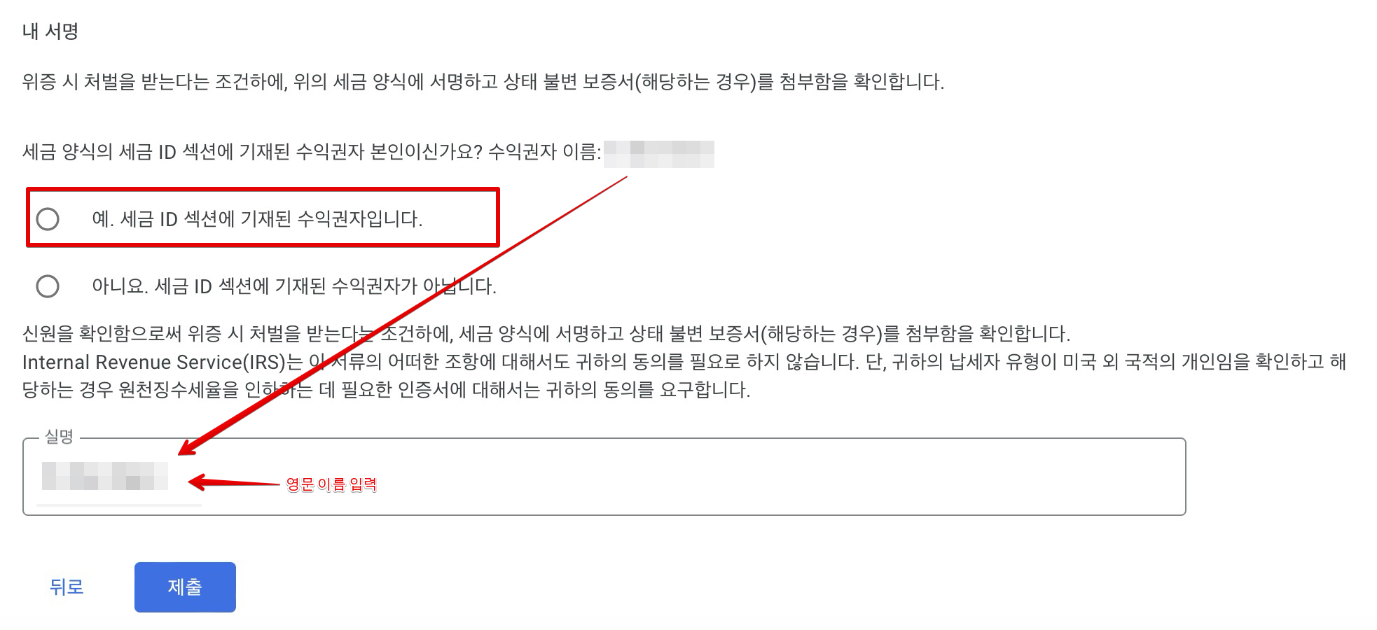 마지막으로 체크한 후 서명해주면 됩니다. 서명은 수익권자 이름에 있는 영문 이름을 그대로 입력하는게 가장 편합니다.