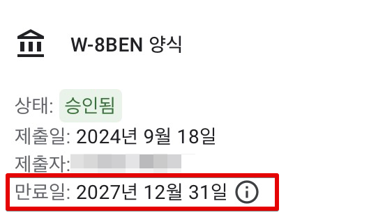 이제 미국쪽에 있는 내용에서 만료일을 확인해줍니다. 만료일은 2024년 12월 31일이라고 합니다. 더 늦기전에 갱신해주도록 합니다. 오른쪽에 있는 [새 양식 제출]을 클릭합니다.