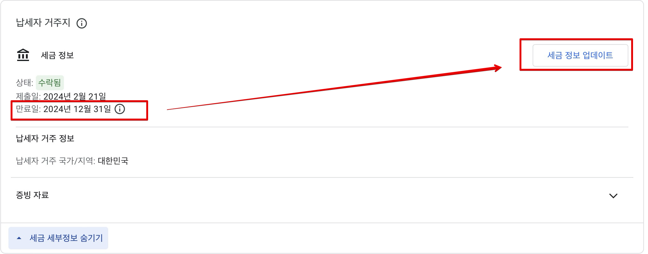 여기에서부터는 납세자 거주지 갱신이 필요한 분들에게 해당하는 사항입니다. 만약 만료일이 코앞이라면 [세금 정보 업데이트]를 진행합니다.