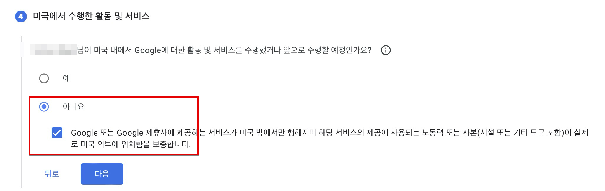 미국에서 수행한 활동 및 서비스에도 [아니요] 입력하세요.