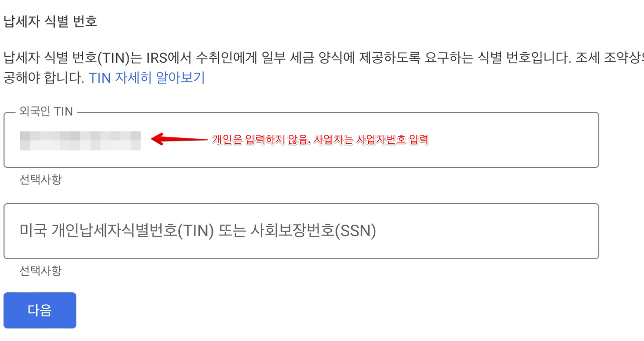 - 외국인 TIN : 개인은 입력하지 않음. 사업자일 경우 사업자번호 입력