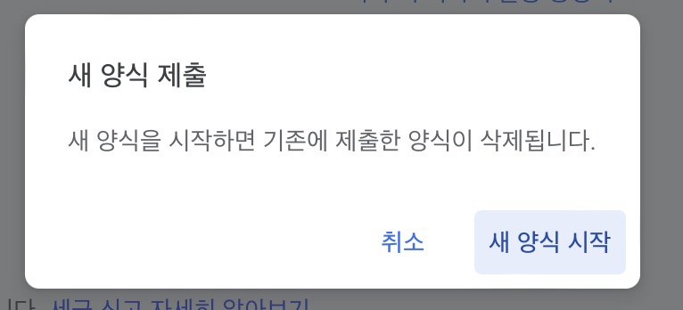 새로운 양식 제출의 경우, 기존 양식이 삭제된다고 합니다. 그대로 진행합니다. [새 양식 시작]을 누르세요.