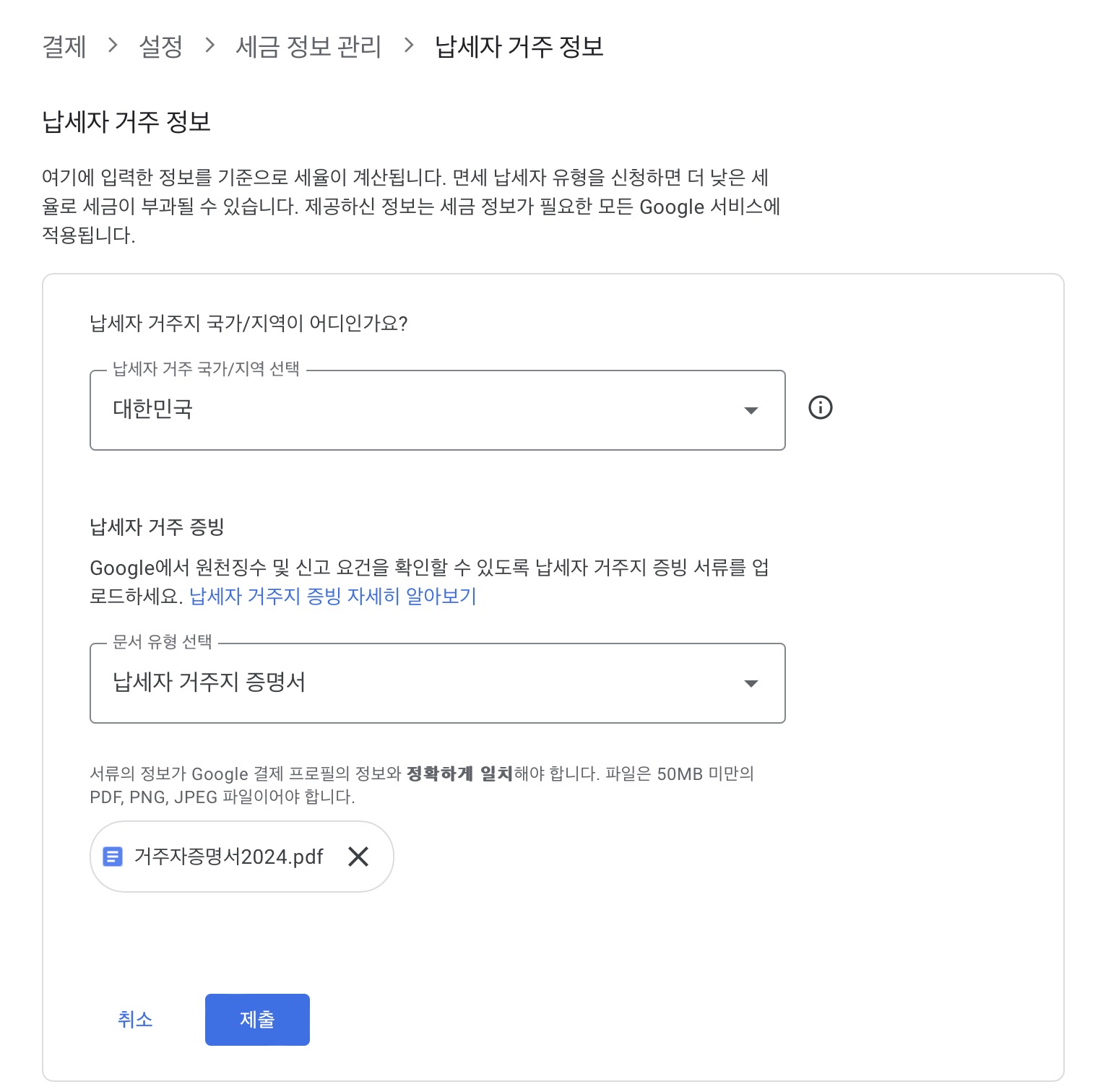 여기에 납세자 거주지 증명서를 첨부해서 올려서 승인받아야하는데요. 납세자 거주지 증명서 첨부 방법은 아래 글을 참고해주세요.