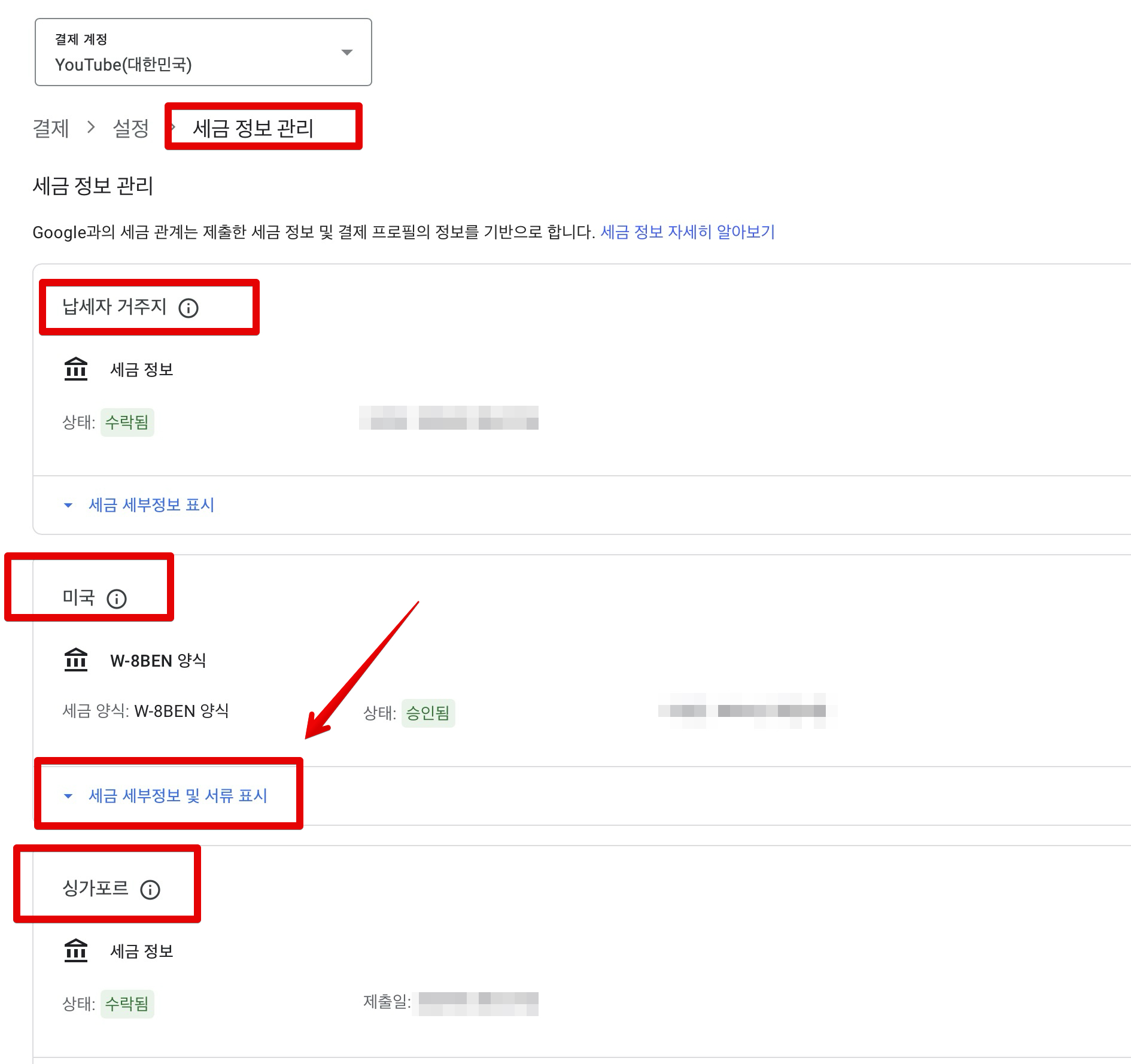 위와 같은 화면이 나타납니다. [세금 정보 관리]란이 맞는지 확인하고 [납세자 거주지] 등록과 [미국] [싱가포르] 등의 정보를 확인해주세요.