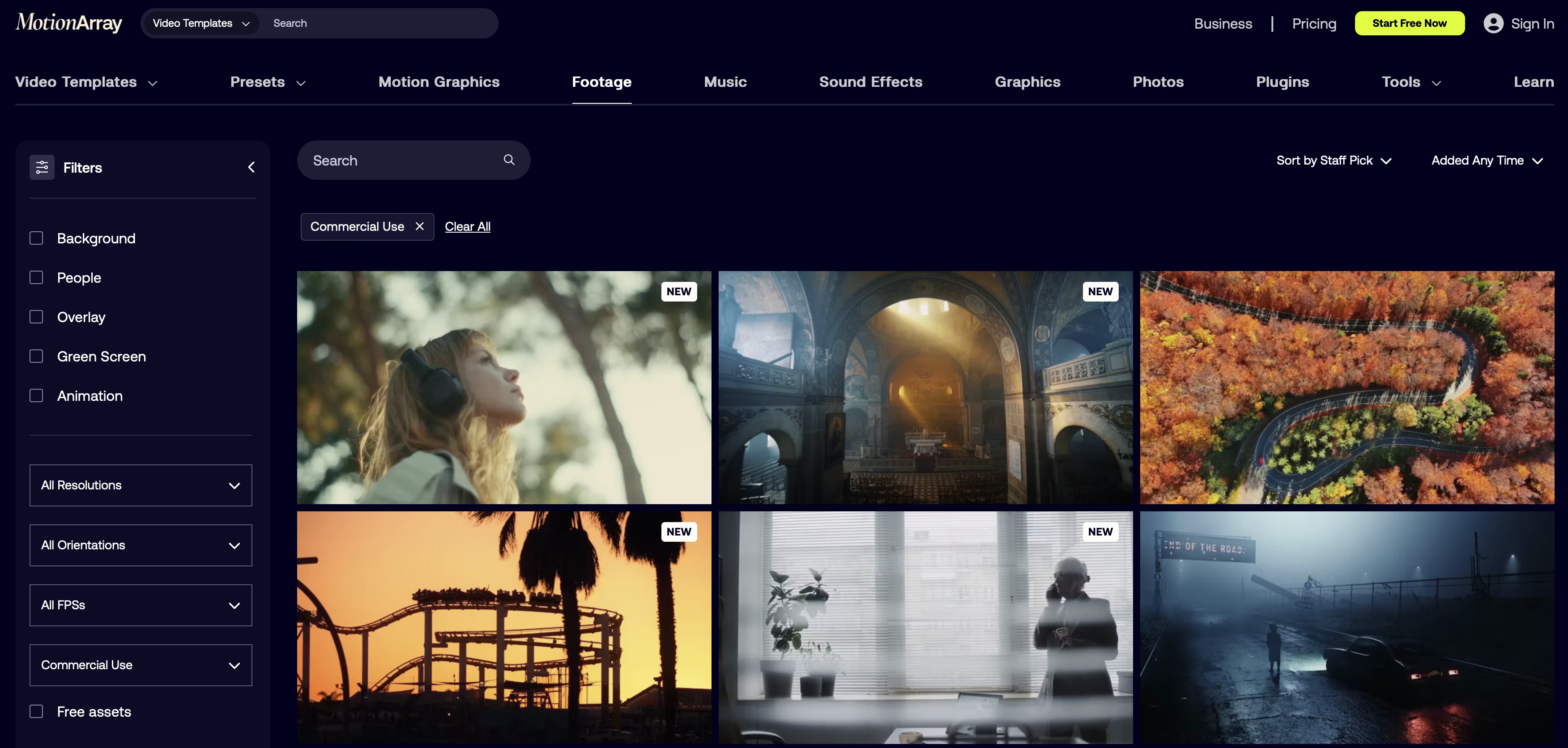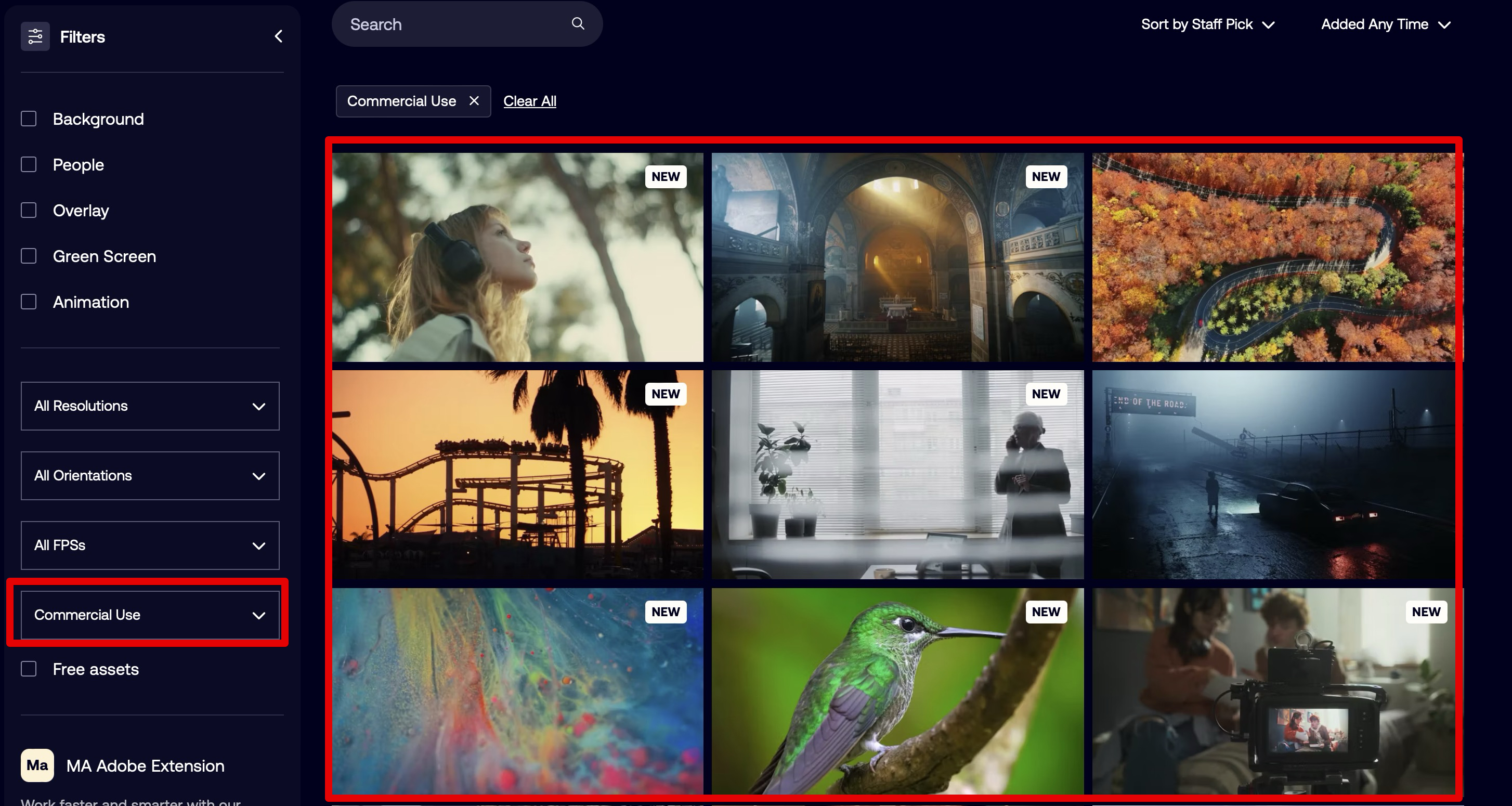 그런 다음 상업적으로도 이용이 가능한 영상만을 골라내기 위해서 [Commercial Use]를 선택합니다. 아래쪽에 있는 [Editorial Use]를 선택한 후 여기에 해당하는 영상을 상업적으로 이용하면 저작권에 위배되게 됩니다. 저작권 관련된 자세한 사항은 아래에서 구체적으로 설명하려고 하는데 굉장히 중요한 부분이므로 꼭 읽어봐주시길 바랍니다.