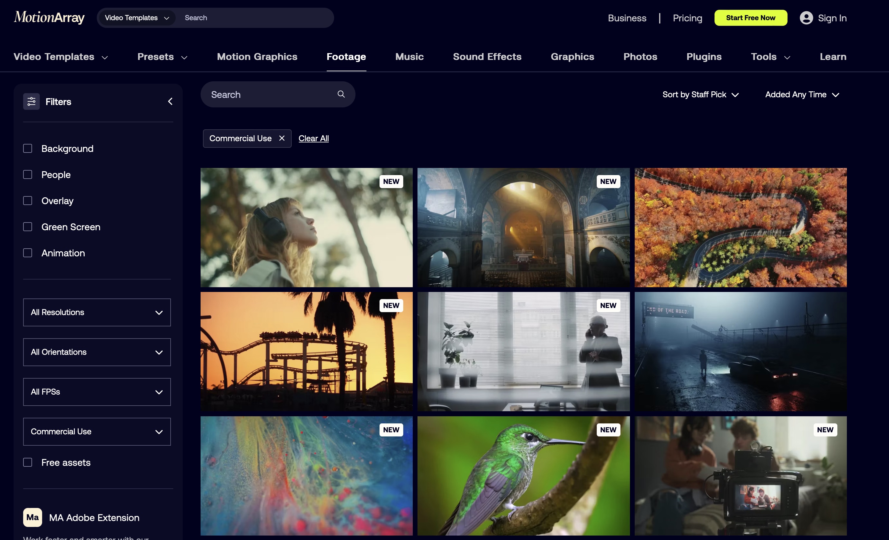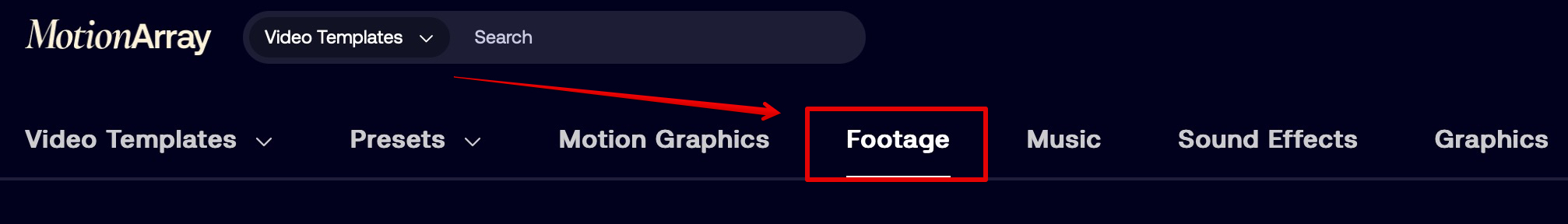 모션어레이에는 다양한 영상 푸티지들이 준비돼 있고 양과 종류 모두 충분한 수준으로 갖춰져 있습니다. 원하는 영상을 찾기가 쉽습니다.그런데 푸티지 메뉴에는 유료 영상과 무료 영상이 모두 혼재되어 나타나고 있습니다. 일단 우리는 무료로 쓸 수 있는 영상을 찾아야하므로 왼쪽 메뉴로 갑니다.