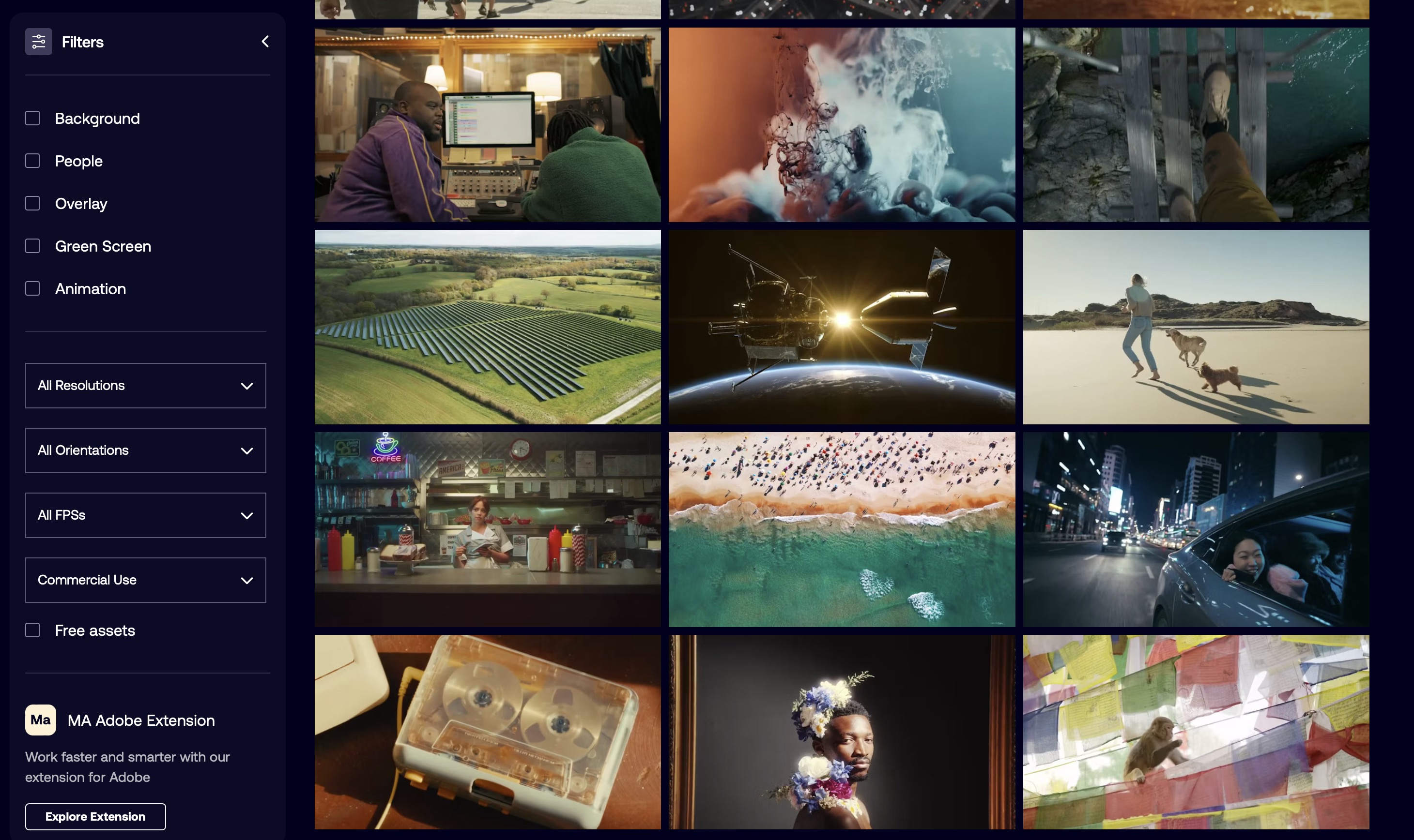 아래쪽에 있는 [Free assets]을 체크해주세요. 무료로 쓸 수 있는 스톡 영상을 필터링하는 방법입니다.
