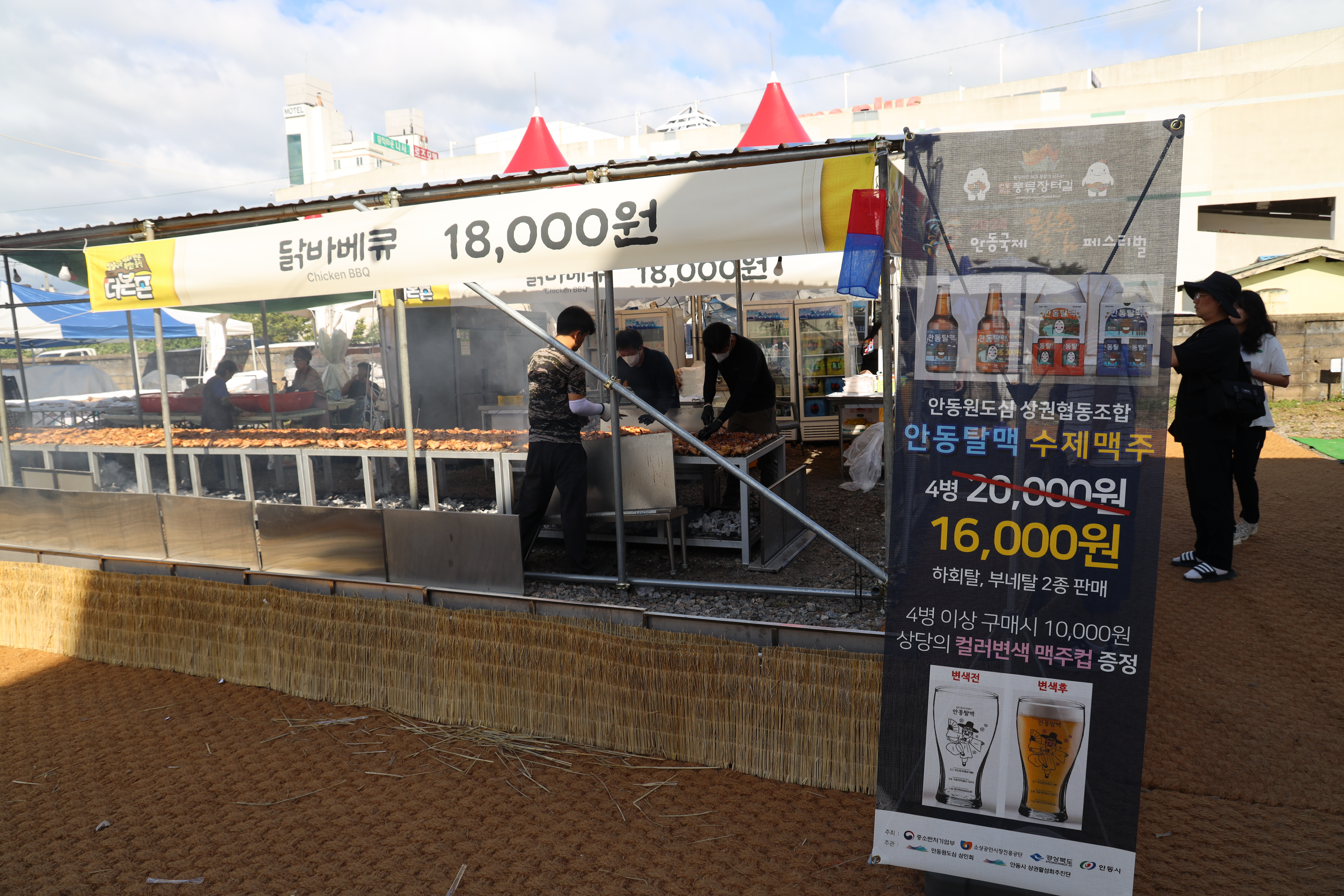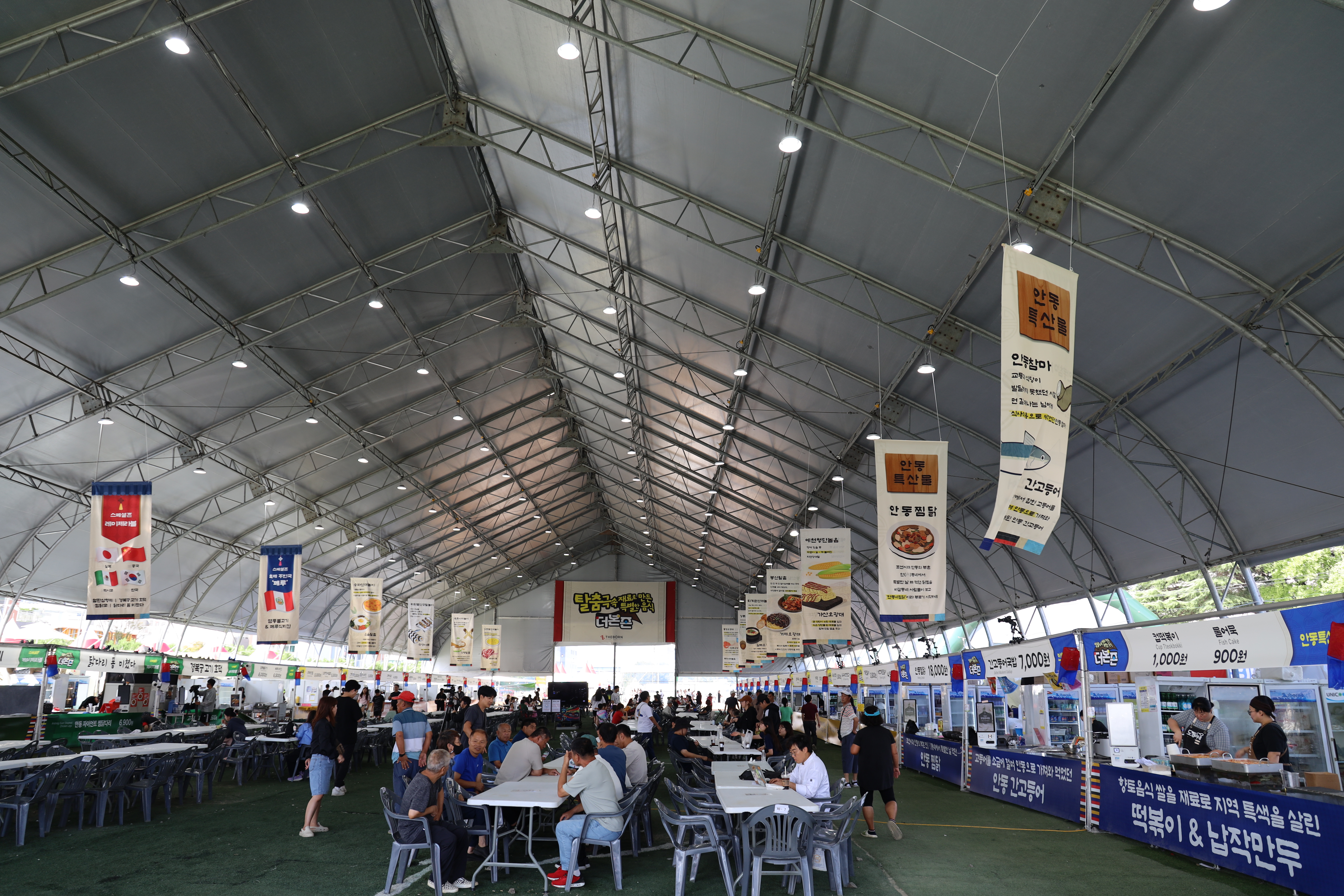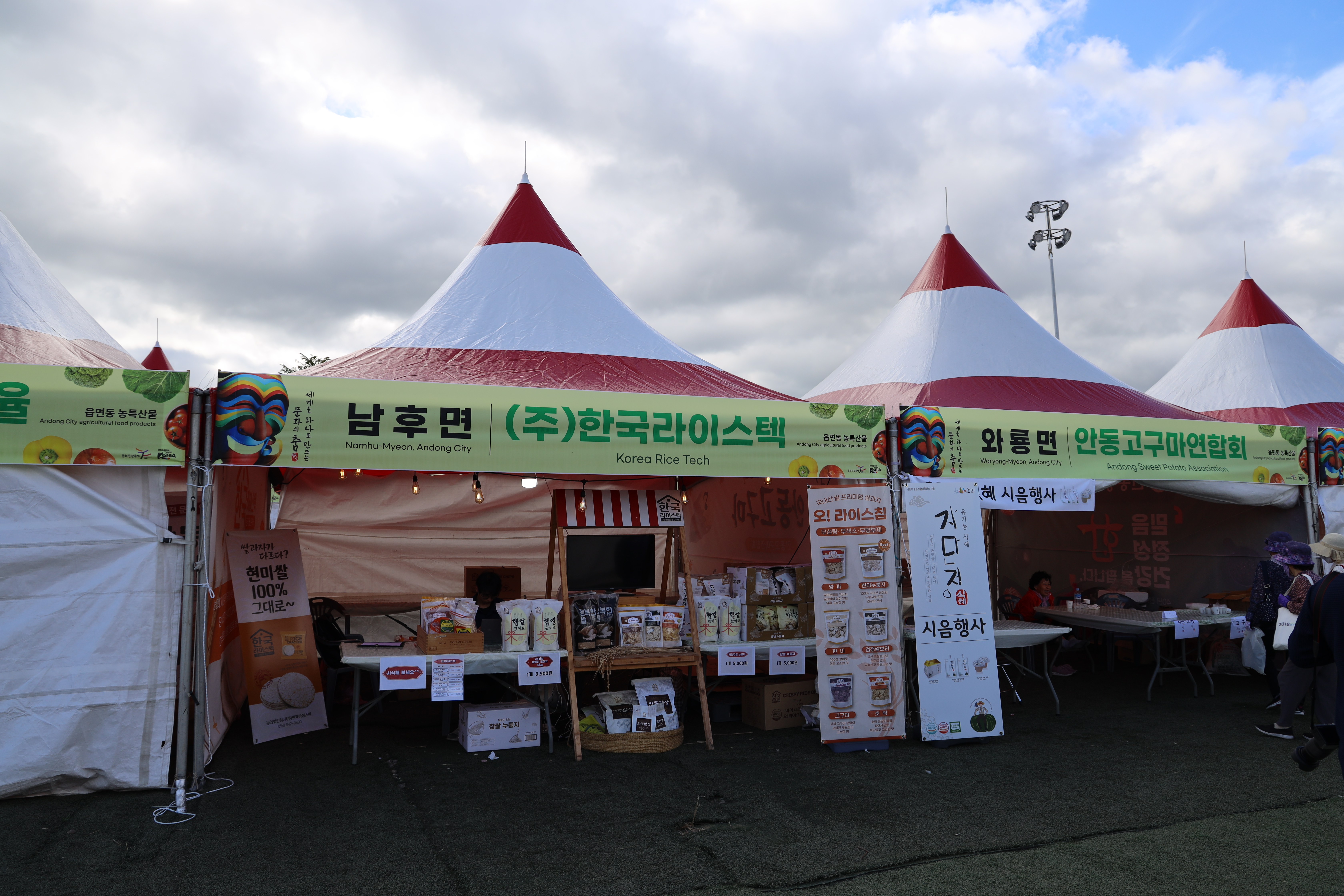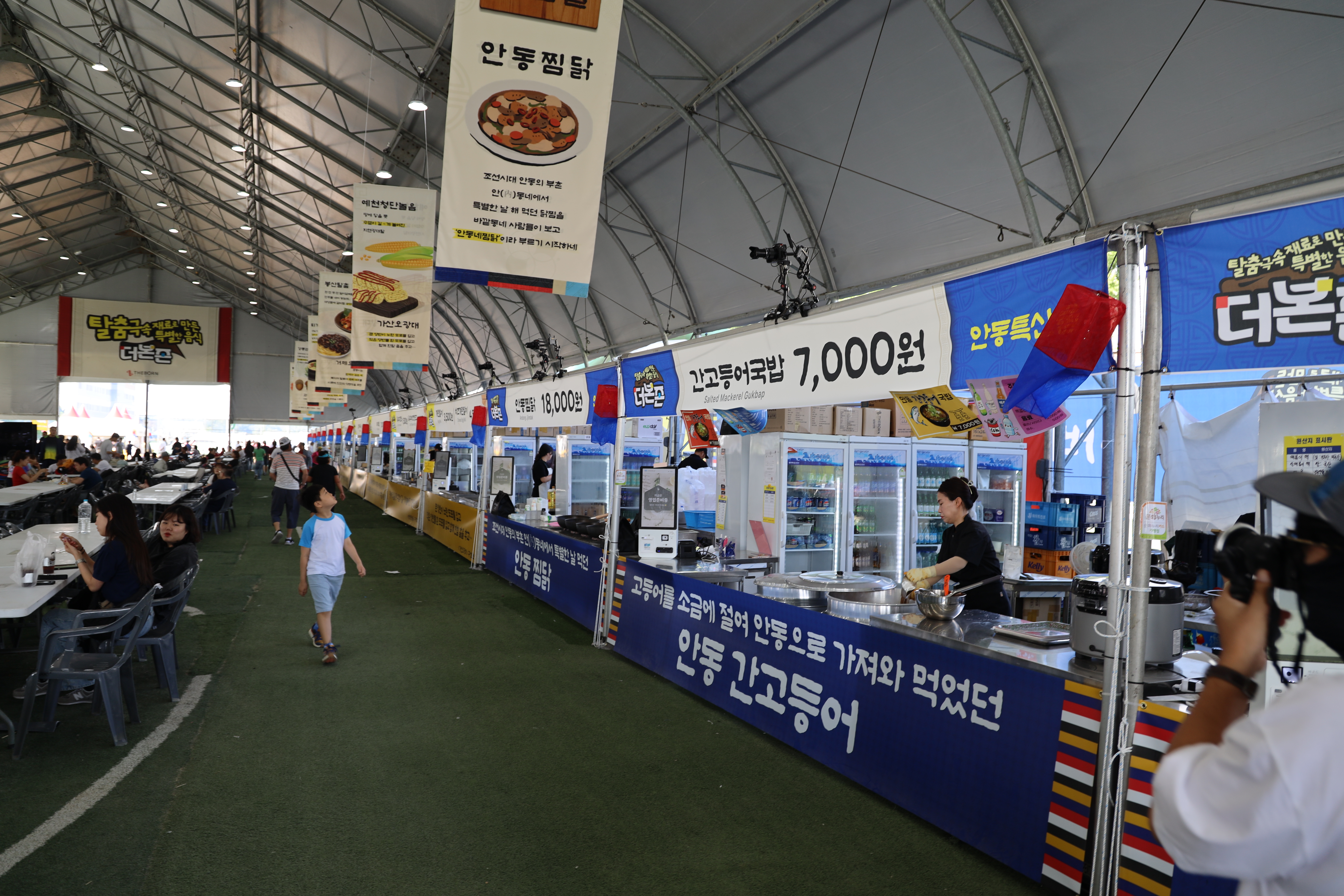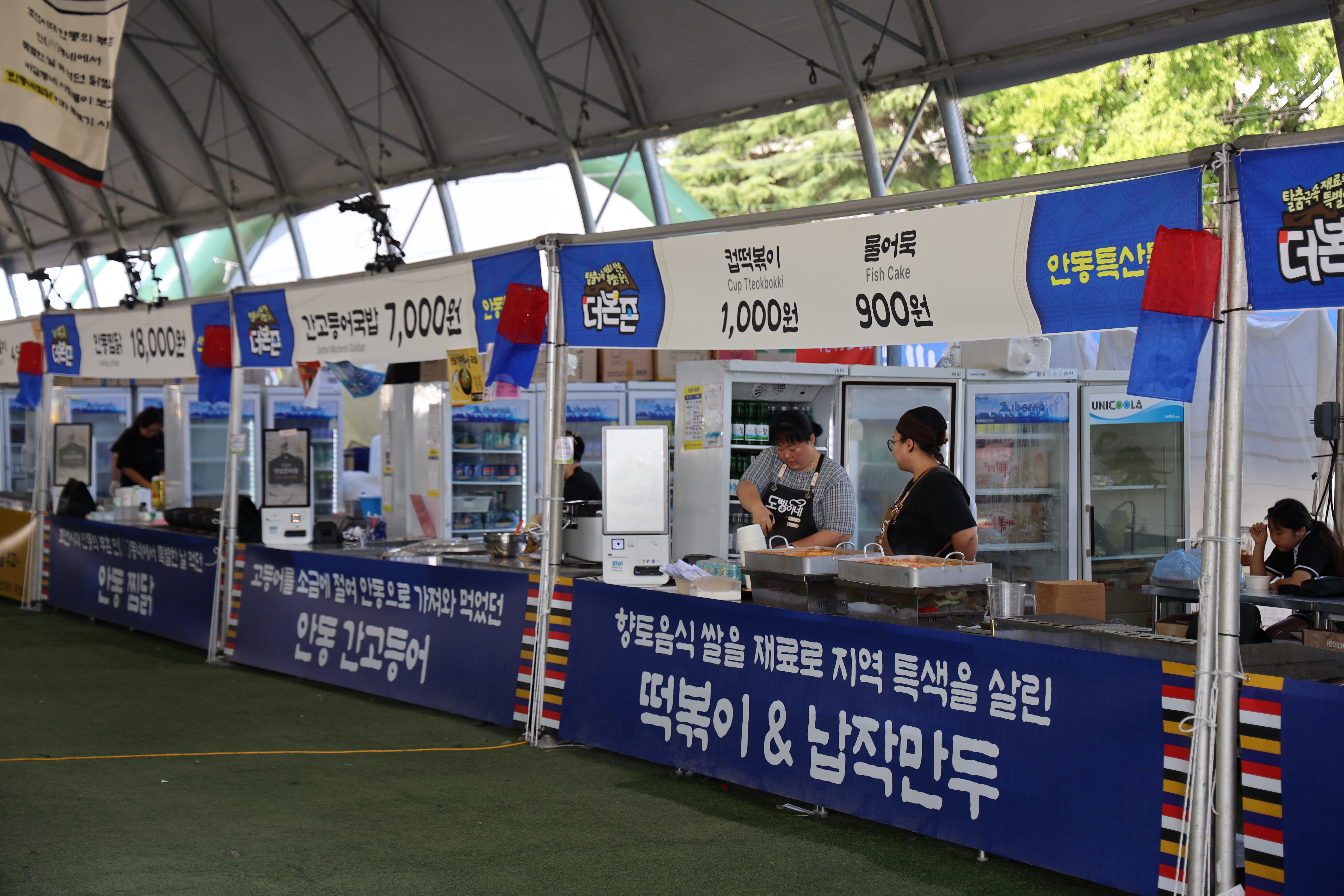 이번 2024 안동국제탈춤페스티벌에서 가장 주목할만한 부분이 바로 먹거리존의 변화였습니다. 기존에는 먹거리존이 전형적인 축제장 먹거리존처럼 부스들로 돼 있고 부스 안에서 자리잡고 먹는 방식이었던데다가 야외에 가격이 공개된 메뉴판이 다소 부실하고해서 여러가지로 아쉬운 부분이 있었다면, 올해부터는 각 음식별로 부스가 들어서게 되면서 골라먹는 재미가 있고 다양한 음식들을 다채롭게 즐겨볼 수 있어서 참 좋았습니다.