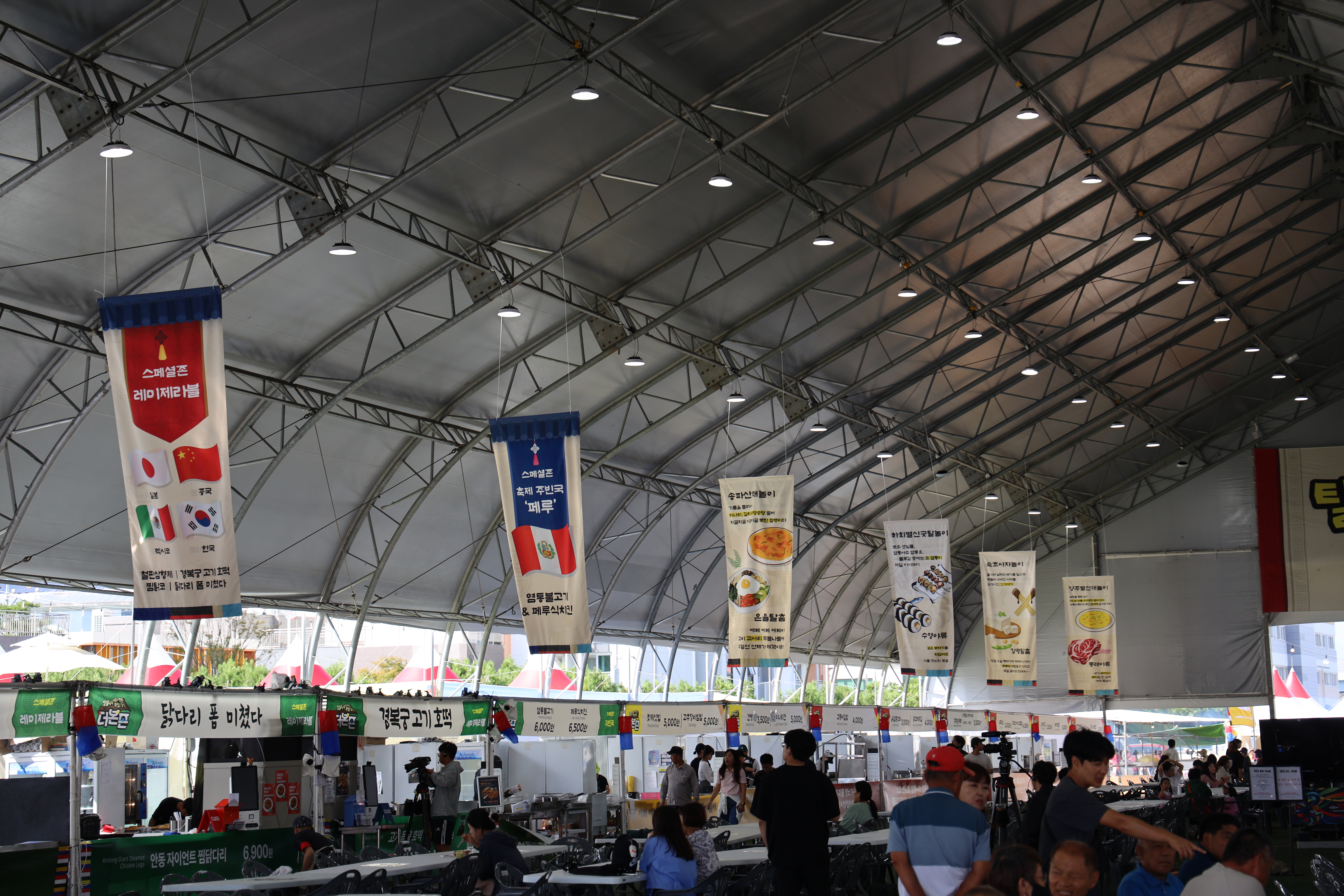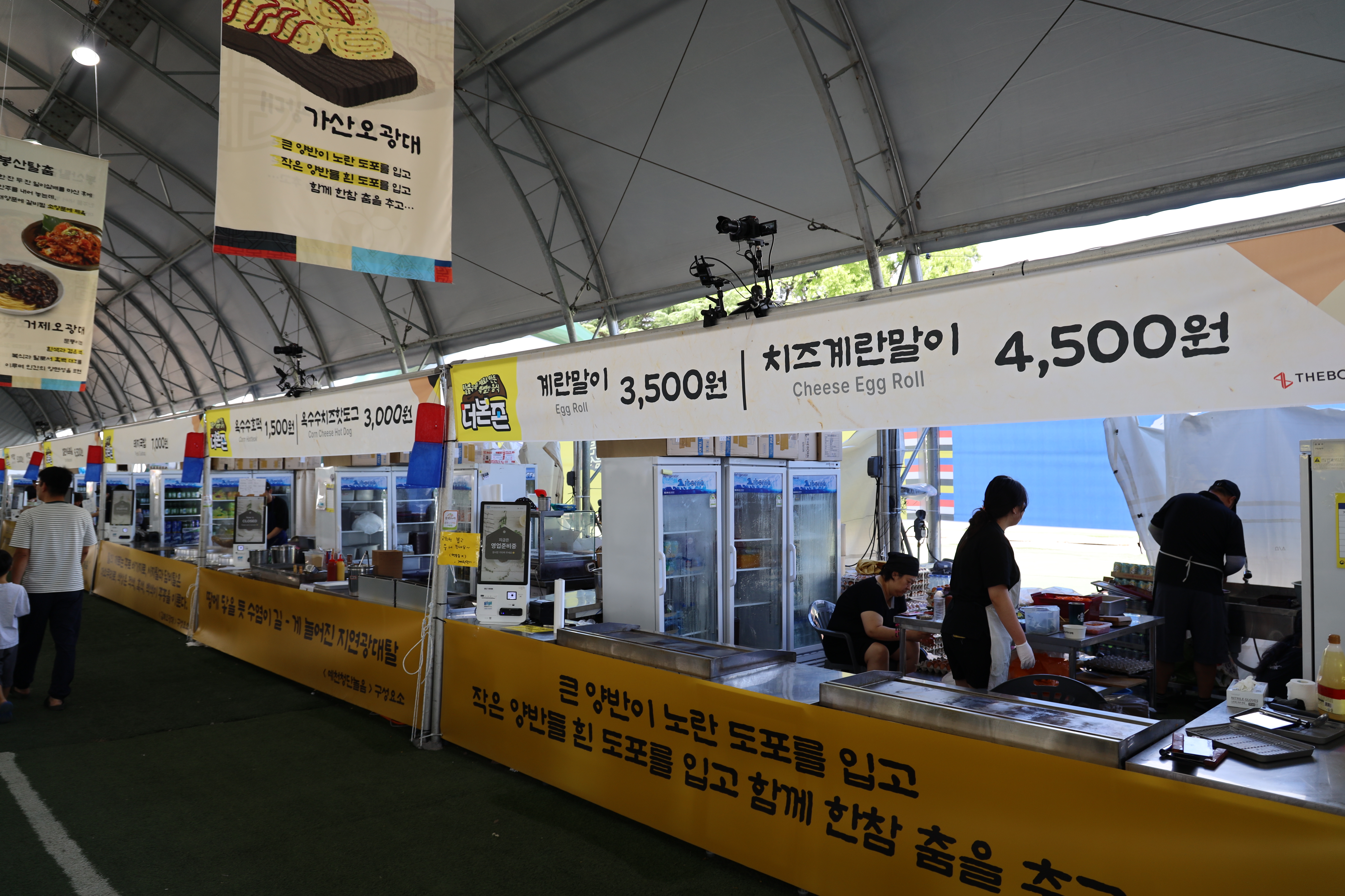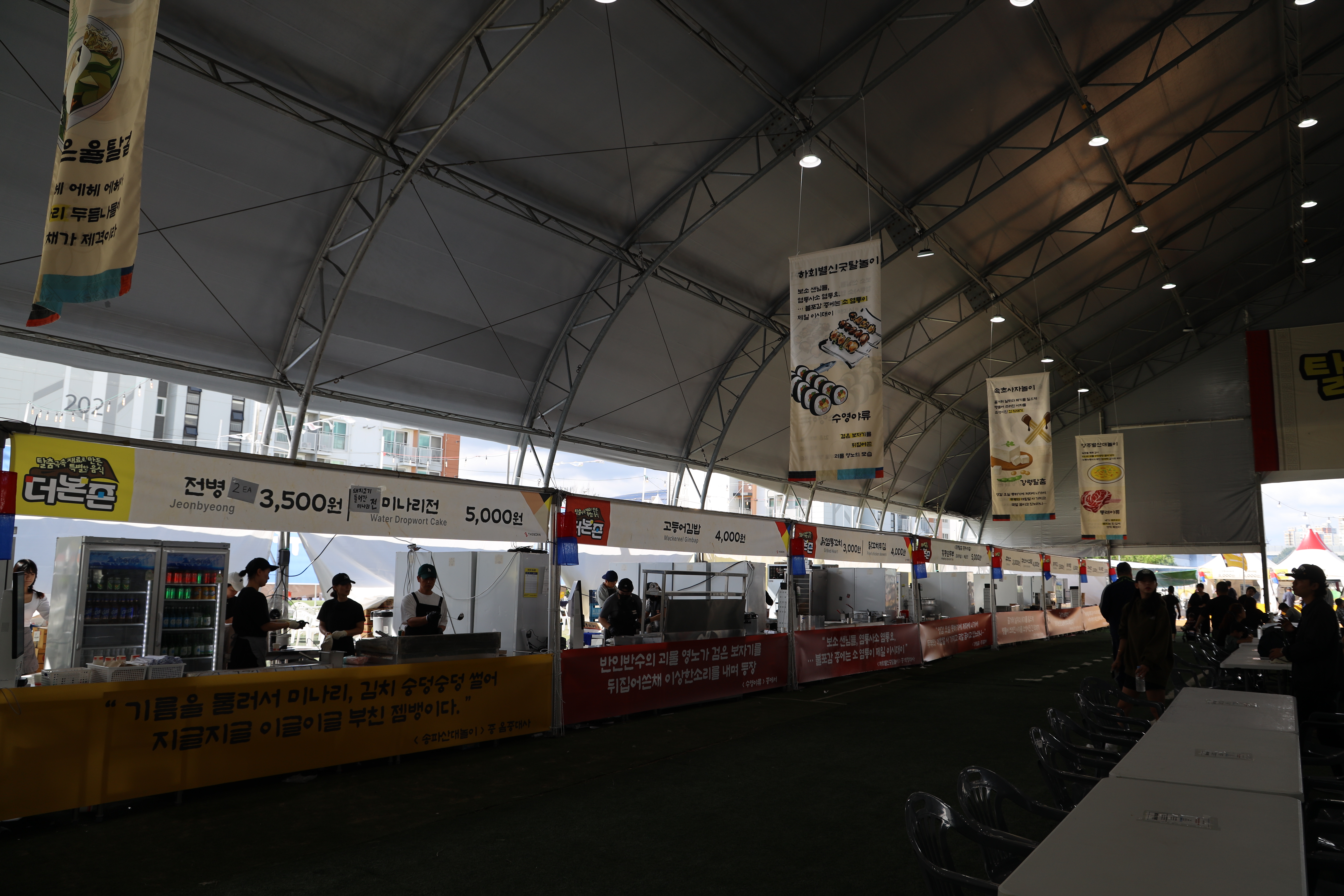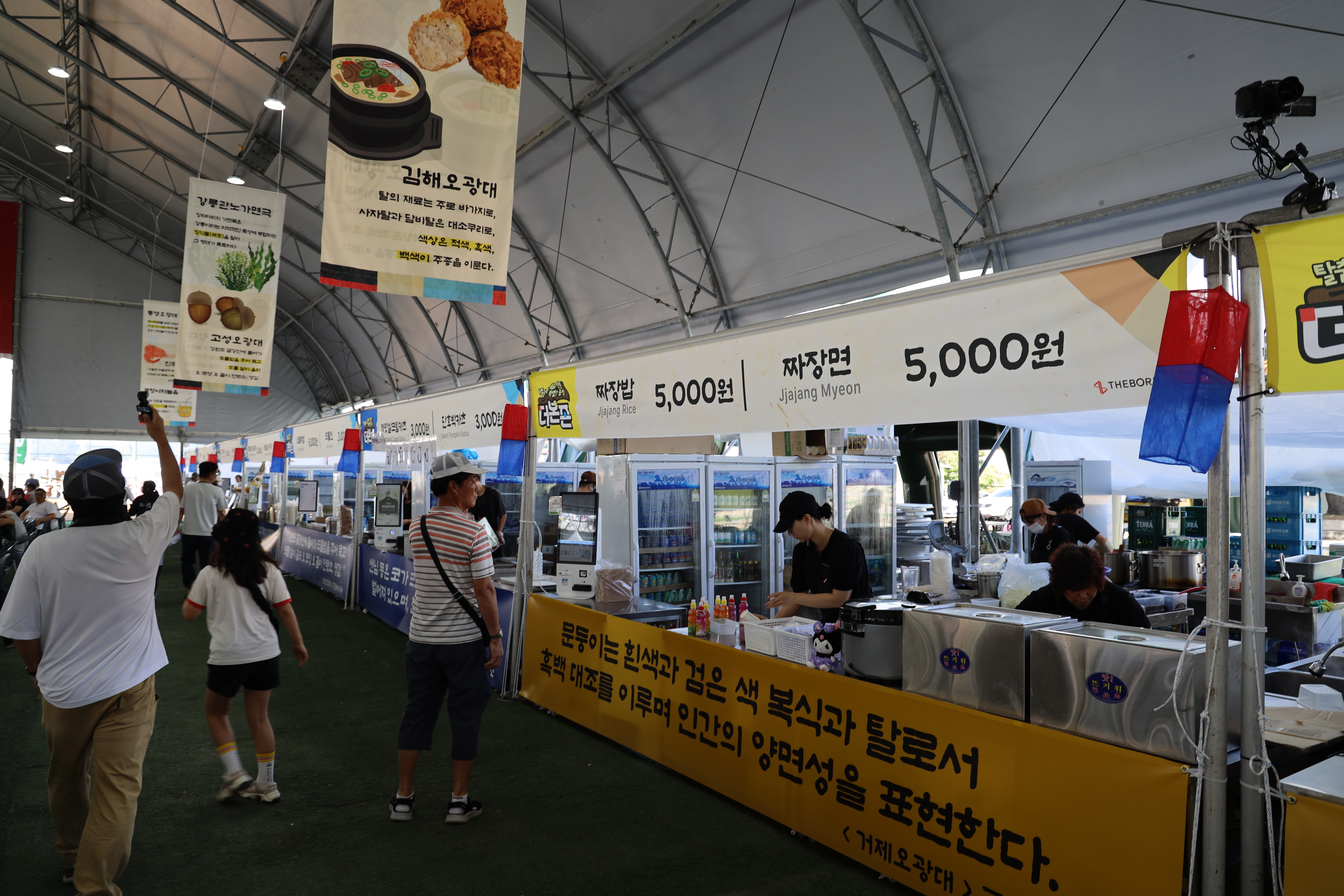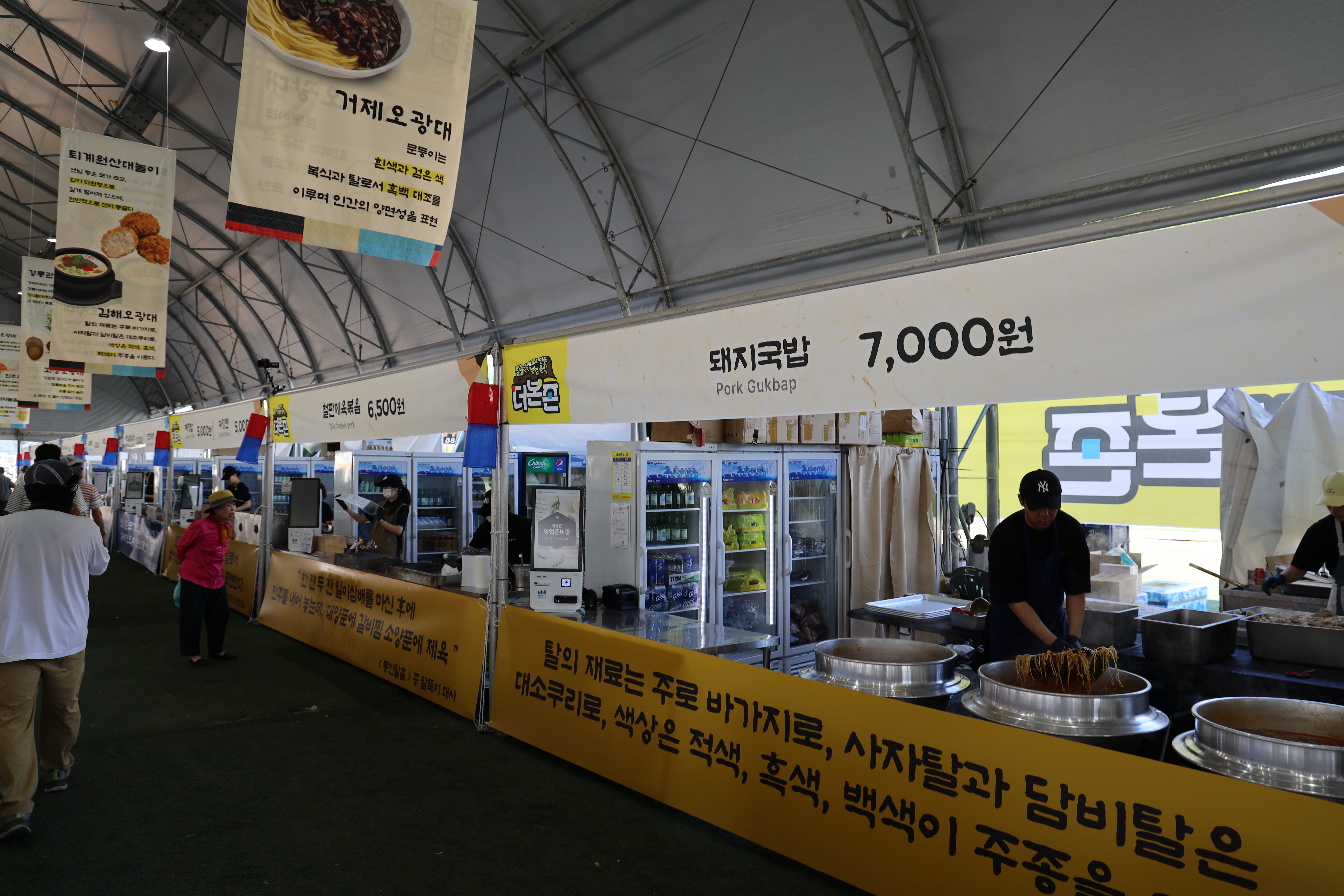 이번 2024 안동국제탈춤페스티벌에서 가장 주목할만한 부분이 바로 먹거리존의 변화였습니다. 기존에는 먹거리존이 전형적인 축제장 먹거리존처럼 부스들로 돼 있고 부스 안에서 자리잡고 먹는 방식이었던데다가 야외에 가격이 공개된 메뉴판이 다소 부실하고해서 여러가지로 아쉬운 부분이 있었다면, 올해부터는 각 음식별로 부스가 들어서게 되면서 골라먹는 재미가 있고 다양한 음식들을 다채롭게 즐겨볼 수 있어서 참 좋았습니다.