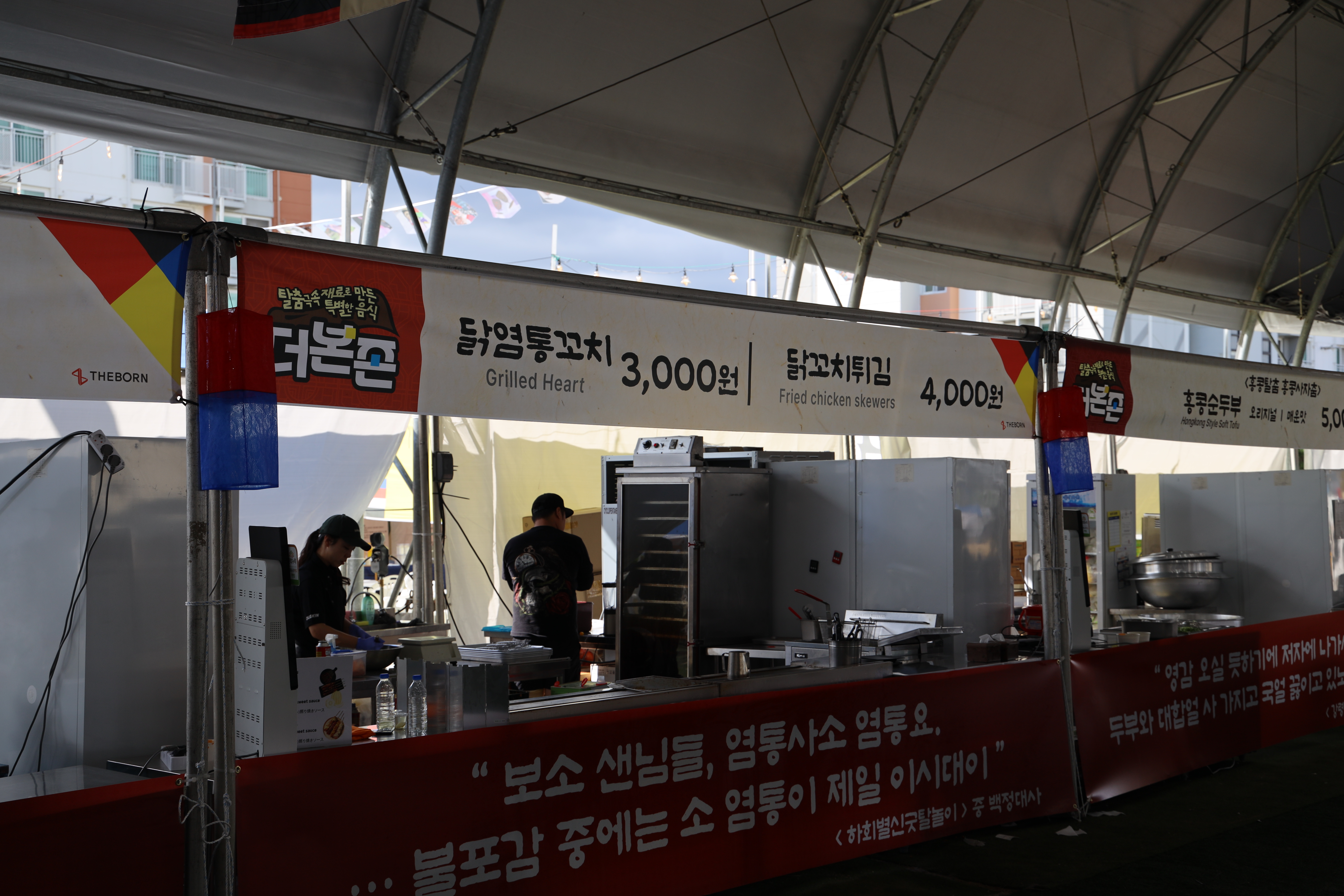 더본존 바베큐 존으로 가봅니다. 여기는 아쉽게도 약간 자리가 안쪽에 배치되어 있어서 여기를 못보고 지나치는 분들도 많다고 들었습니다. 안쪽까지 들어가야만 볼 수 있는 곳인데 닭바베큐, 고등어바베큐 등 백종원표 먹거리의 축제장 먹거리를 실감케 하는 코스입니다.