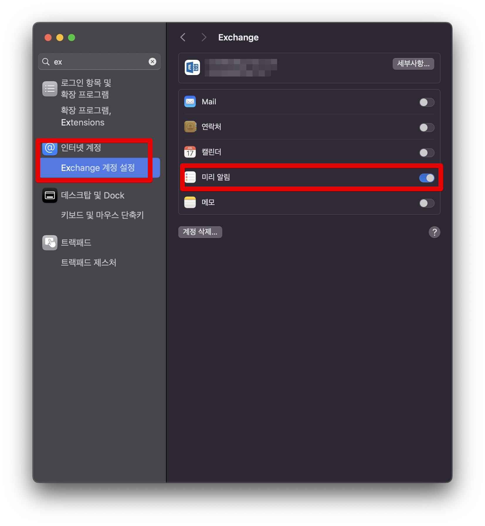 문제 상황 3 : 아이폰 미리알림에서는 연동이 되는데 맥북의 미리알림 Exchange에서는 안됨