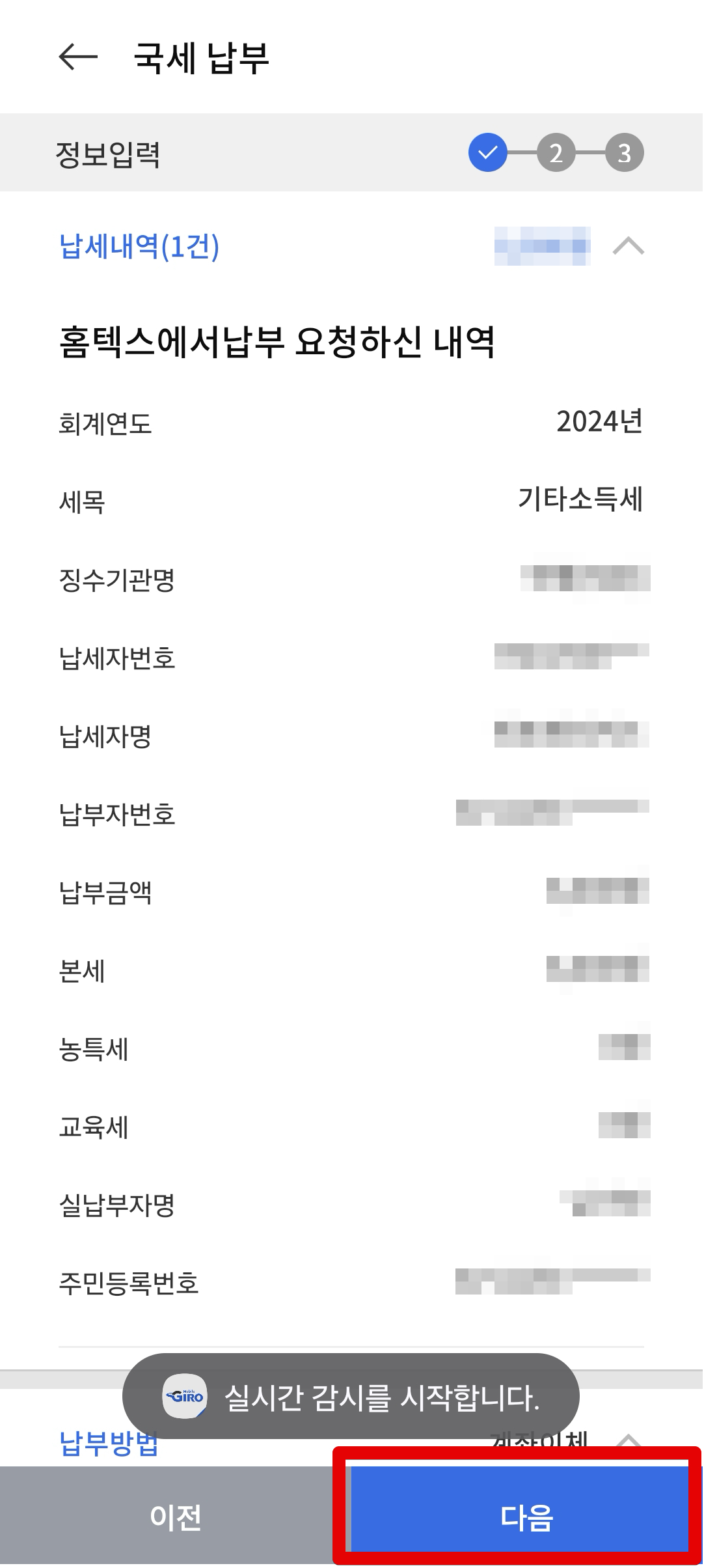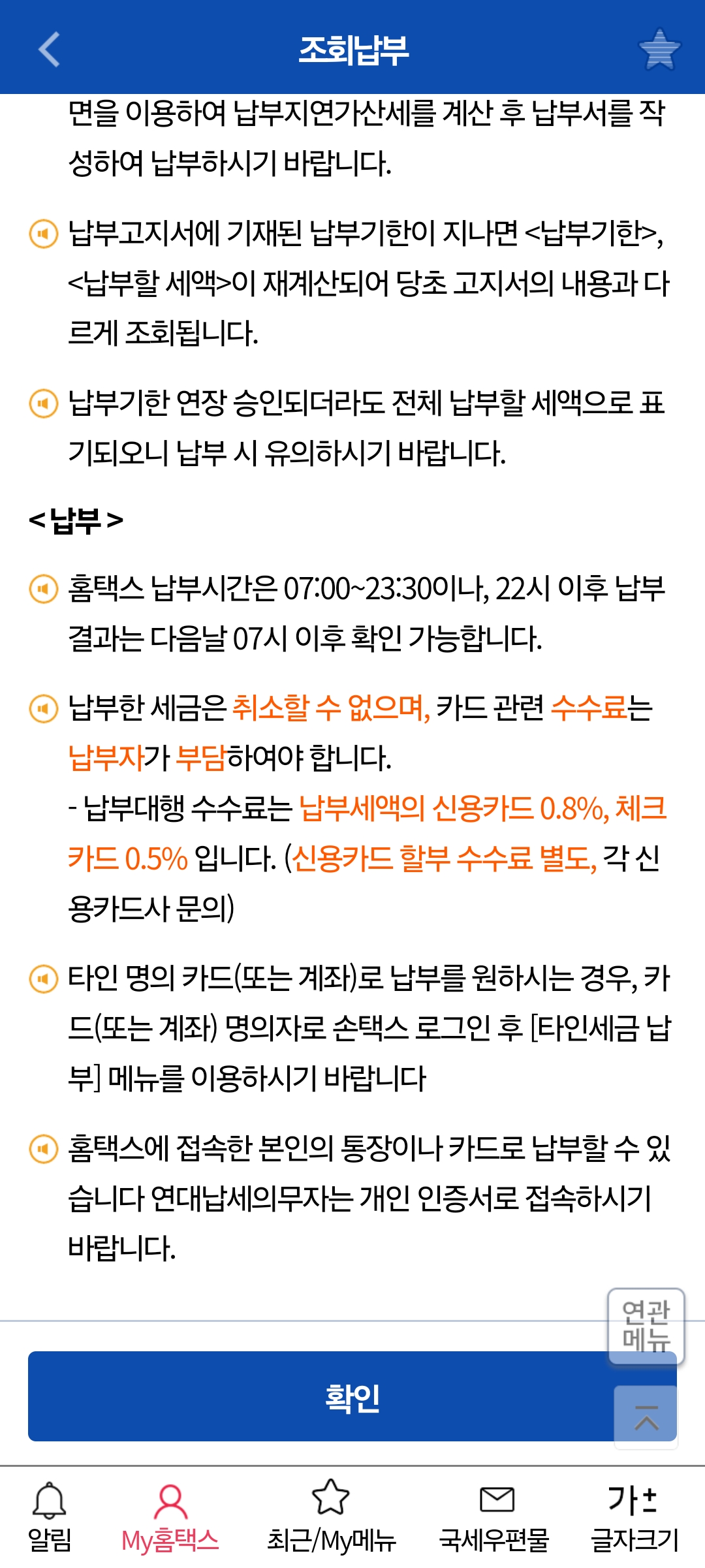 그러면 안내문이 나타나는데 국세의 경우 카드로 납부할 경우 납부대행 수수료가 붙습니다. 신용카드는 0.8%, 체크카드는 0.5%입니다. 저는 국세와 지방세 모두를 납부할 때 무조건 계좌이체로만 납부하고 있습니다. 수수료를 절약하기 위함입니다.