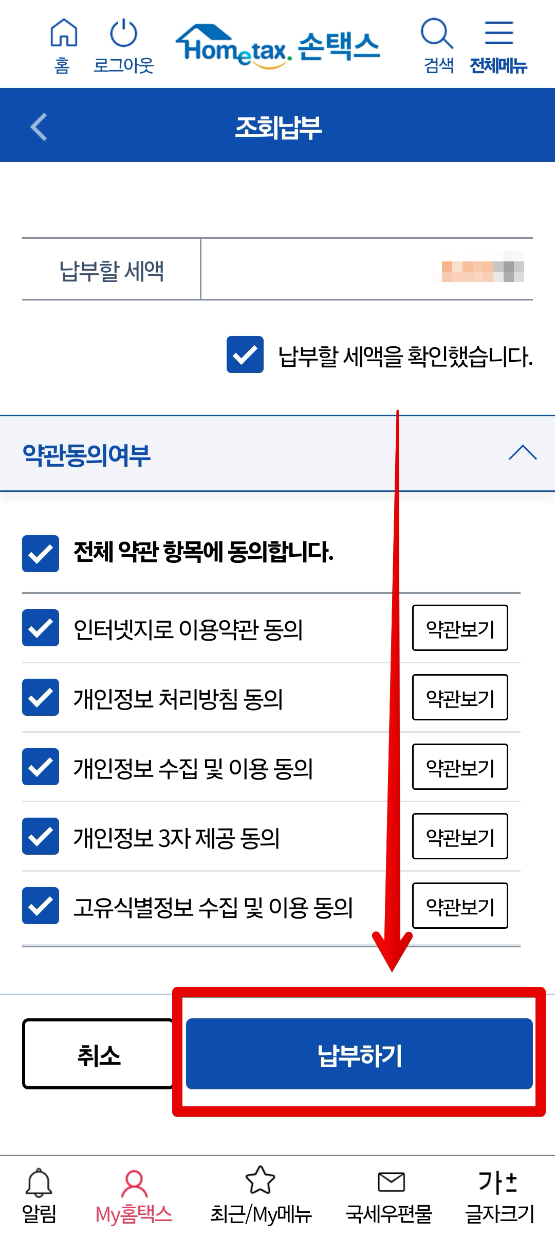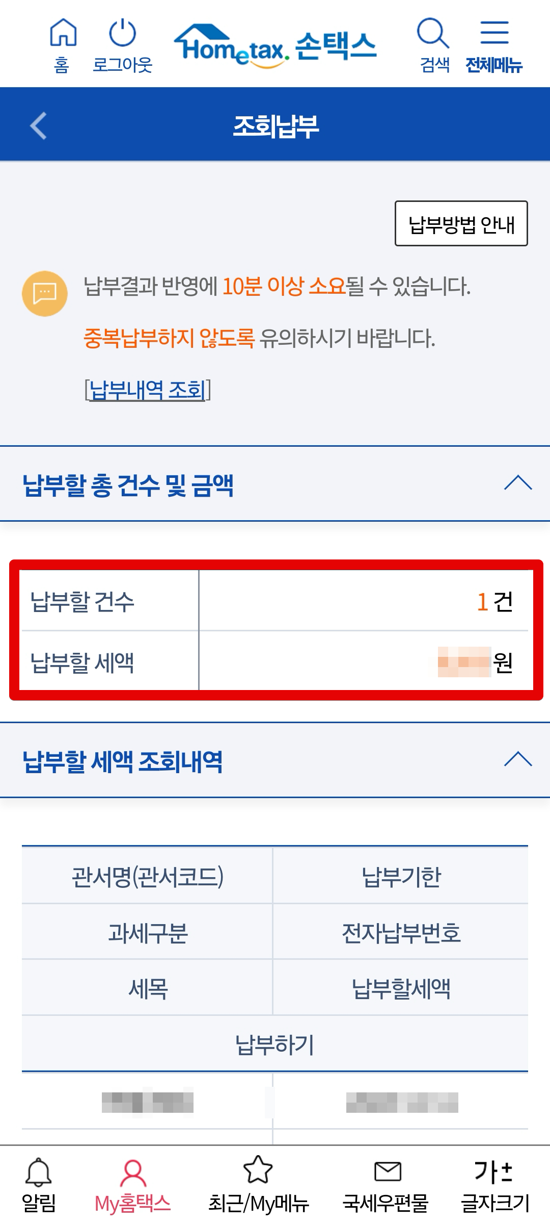 이후 안내문을 읽어본 후 [확인]을 클릭하면 납부해야할 건수와 세액이 표시됩니다. 건수와 세액 확인 후 스크롤을 아래로 내립니다.