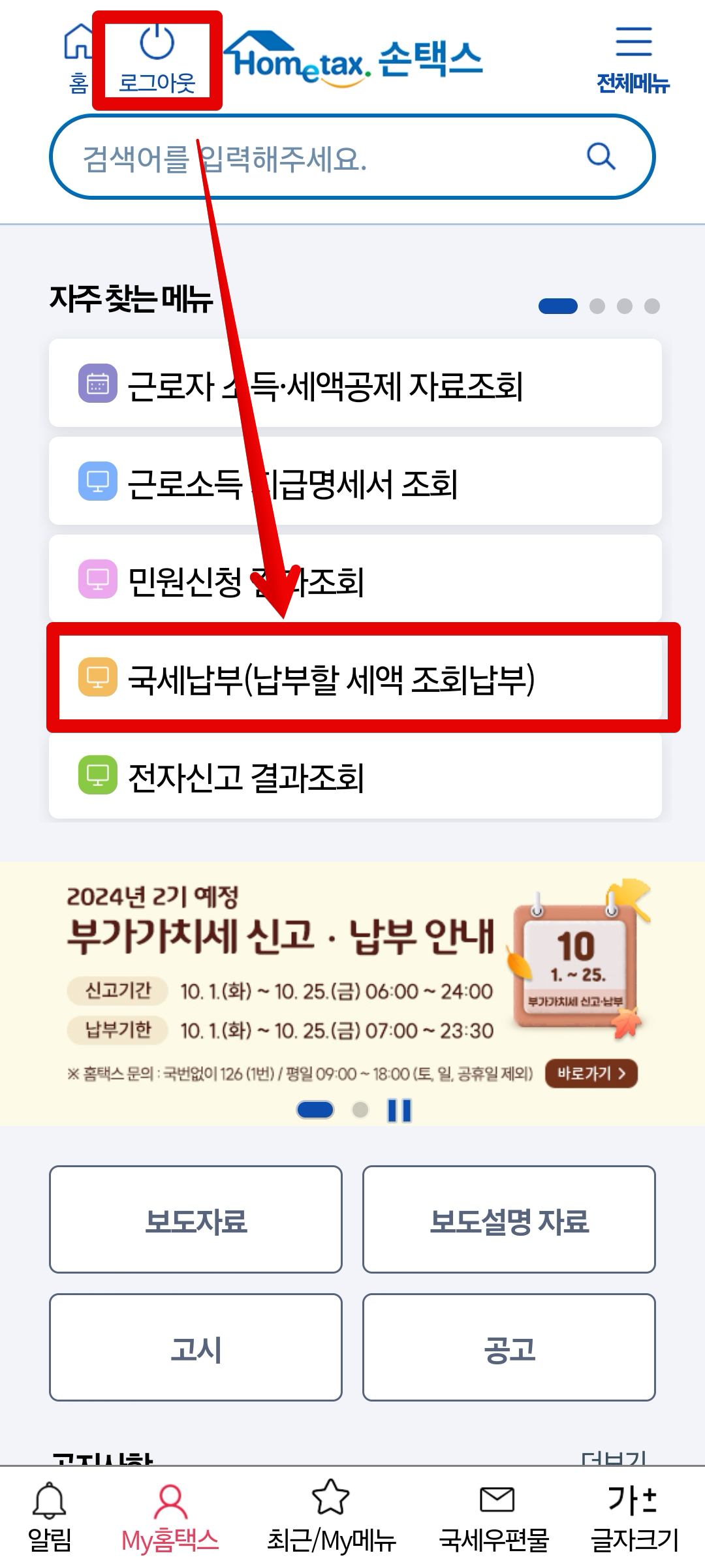 제일 먼저 국세청 손택스 앱에 접속 후 [로그인]을 진행합니다. 이후 국세청 손택스 앱 첫화면에서 [국세납부(납부할 세액 조회납부)]를 선택합니다. 납부할 세액 조회가 되려면 먼저 국세청 홈페이지에서 국세 세금 신고가 되어 있어야만 조회가 가능합니다.