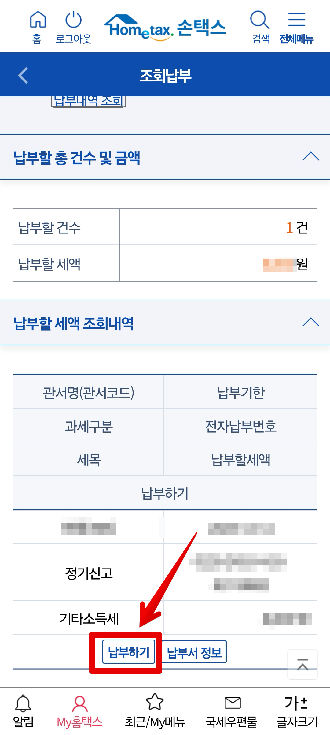아래쪽에 있는 [납부하기] 버튼을 클릭하여 납부를 진행합니다. 이렇게하면 편리하게 맥북+스마트폰 조합으로도 국세청 세금신고 업무 거의 대부분을 처리할 수 있습니다.