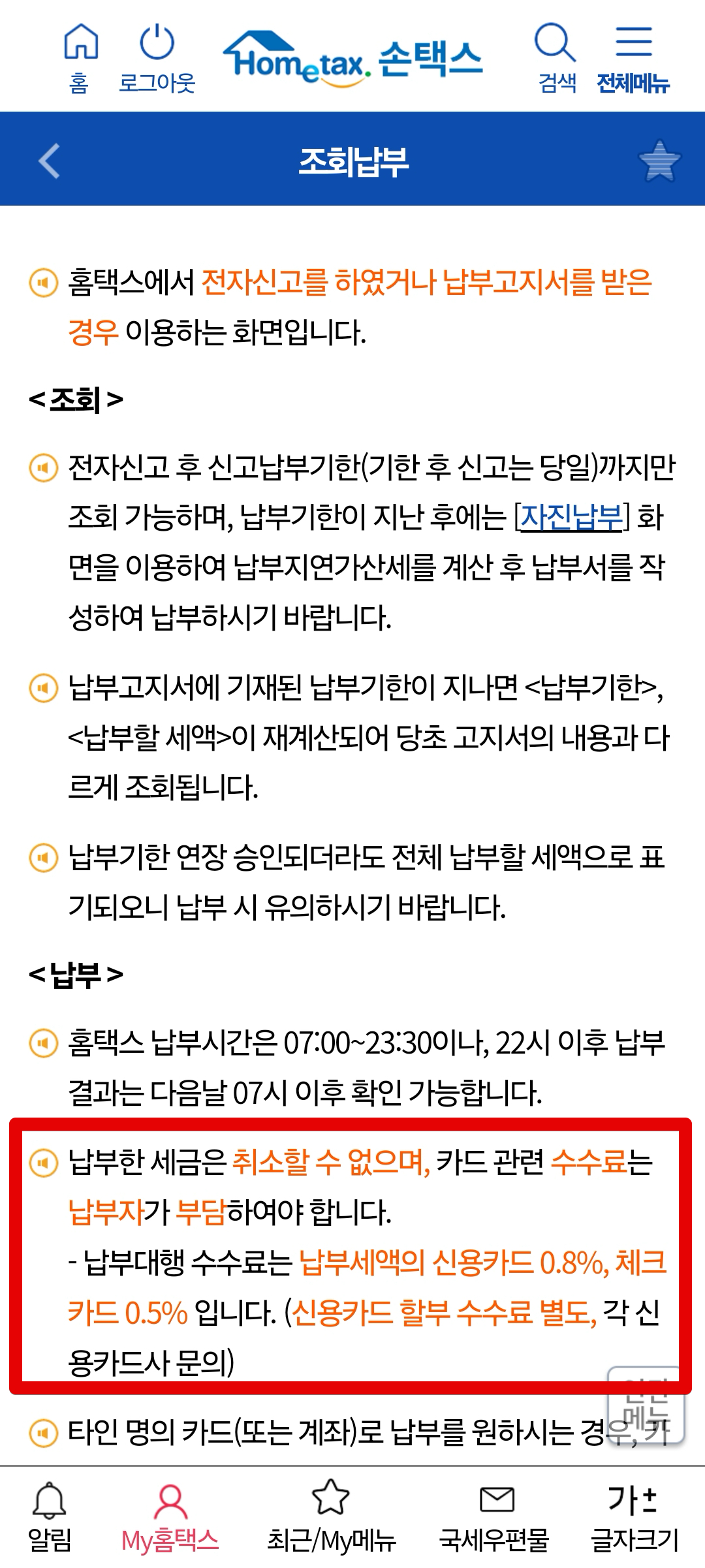 그러면 안내문이 나타나는데 국세의 경우 카드로 납부할 경우 납부대행 수수료가 붙습니다. 신용카드는 0.8%, 체크카드는 0.5%입니다. 저는 국세와 지방세 모두를 납부할 때 무조건 계좌이체로만 납부하고 있습니다. 수수료를 절약하기 위함입니다.