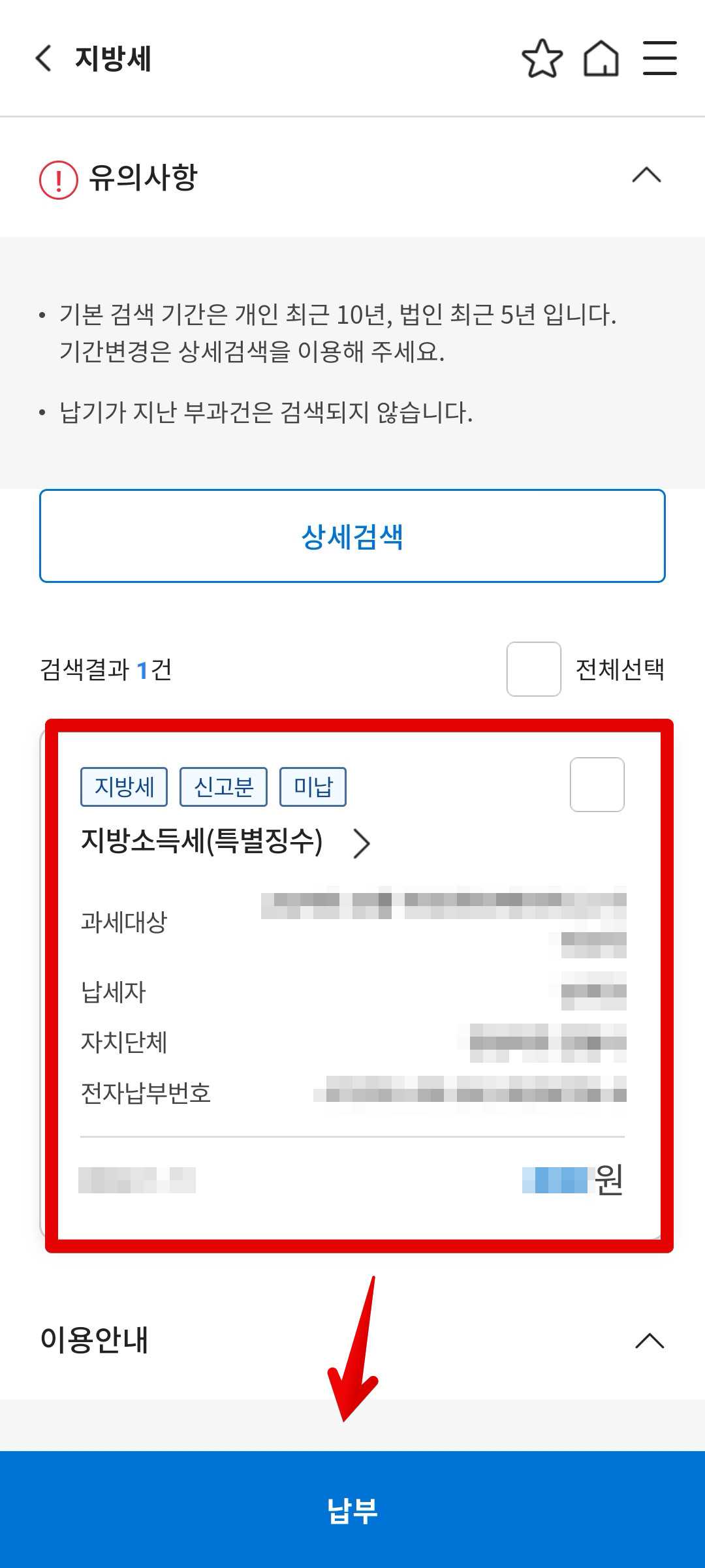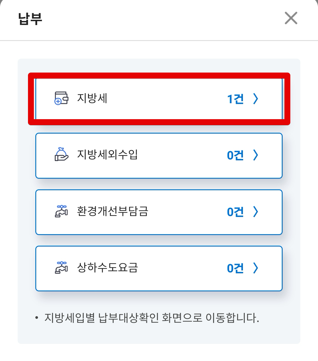 이때 만약 납부해야할 지방세 목록이 뜨지 않는다면, 국세청 홈페이지를 통해 지방세 납부 진행이 되지 않은 상황입니다. 그래서 먼저 국세청 홈페이지에서 지방세 납부 신청을 한 후 스마트폰 위택스 앱에서 다시 납부 진행해야합니다.