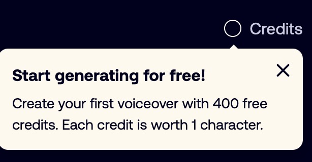 모션어레이의 AI보이스오버의 경우, 현재 베타 기능으로서 무료로 400 크레딧을 받을 수 있습니다. 400개의 무료 크레딧으로 첫 번째 음성 을 만들어서 테스트해보세요.1 크레딧은 1개 글자입니다. 따라서 약 400자의 음성 보이스오버를 AI 생성으로 무료로 만들어볼 수 있습니다.
