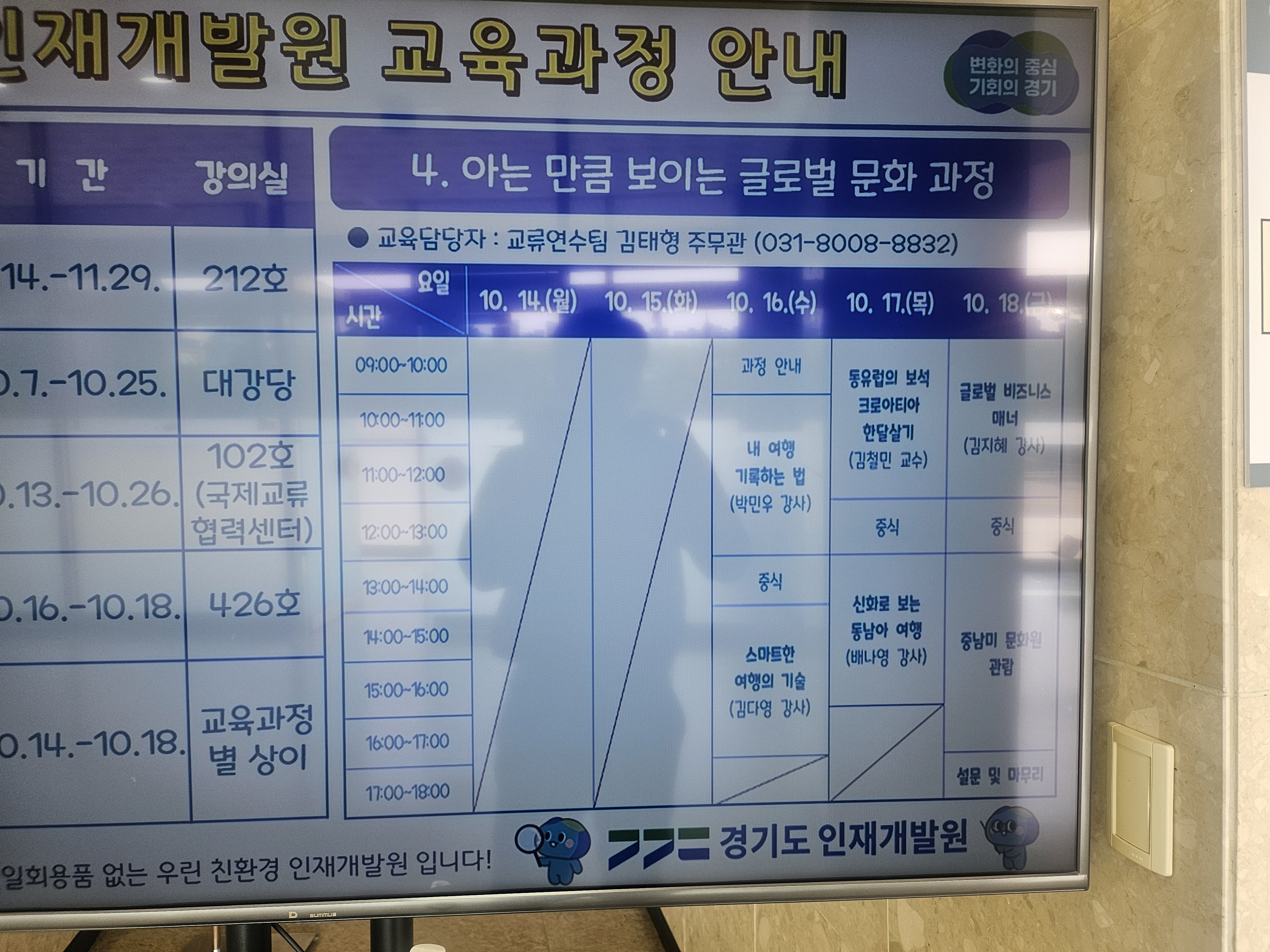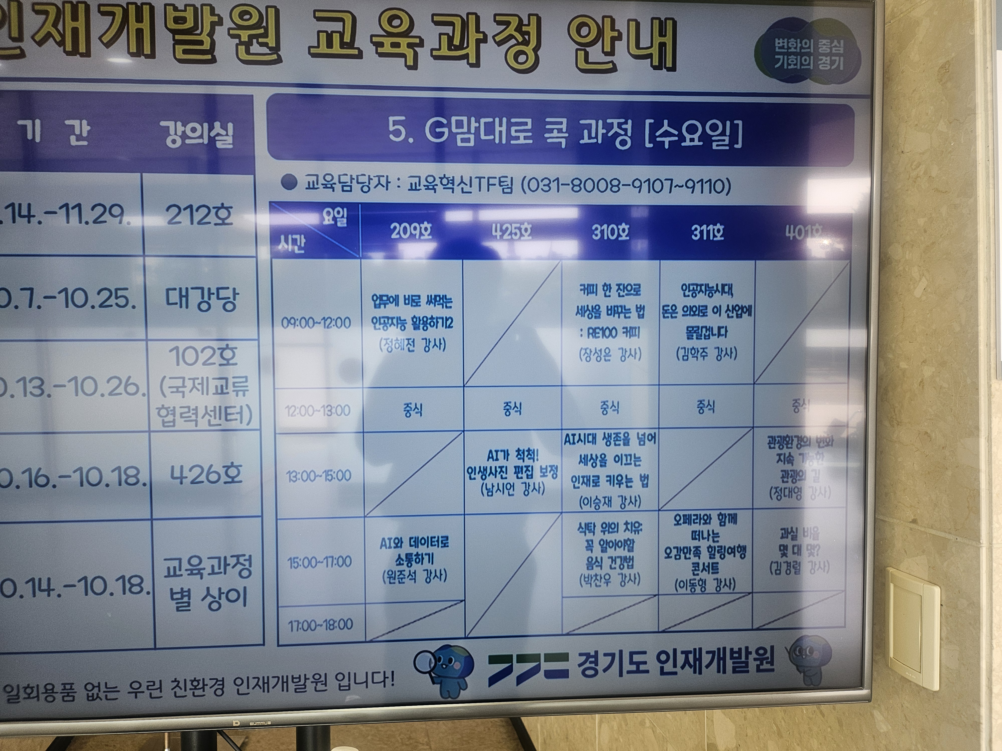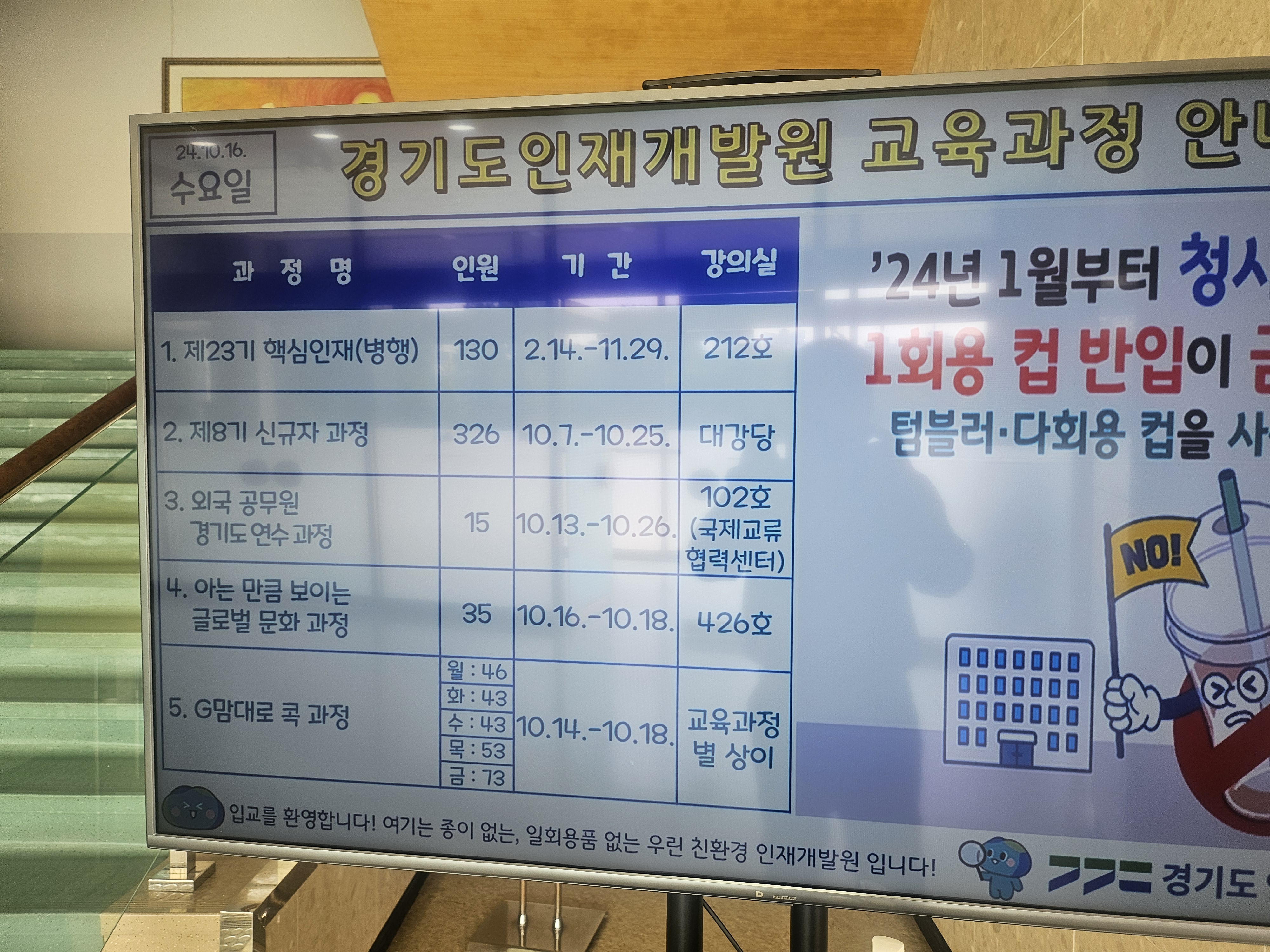 경기도 인재개발원 1층에 있는 모니터를 이용해 당일날 열리는 교육과정 등 전체를 확인할 수 있었습니다.