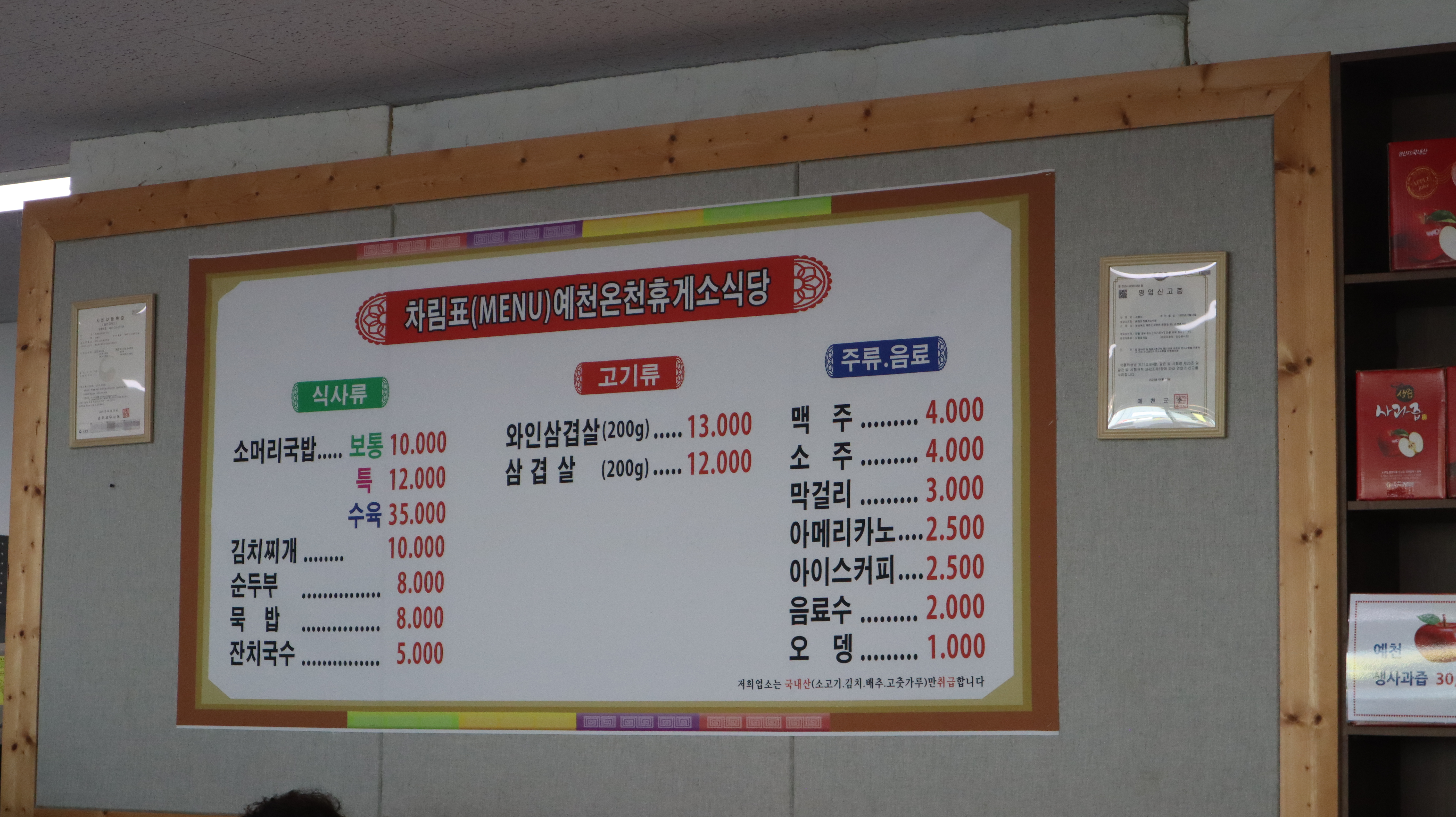 식당 밖에서 메뉴판 차림표를 미리 확인할 수 있습니다. 소머리국밥은 보통과 특이 있고 수육 판매하며 김치찌개와 순두부, 묵밥, 잔치국수가 있습니다. 고기류도 있으며 주류와 음료도 판매합니다. 더불어서 예천군 특산품도 판매하니 예천온천 이용하시는분들은 한 번 둘러보시면 좋습니다.