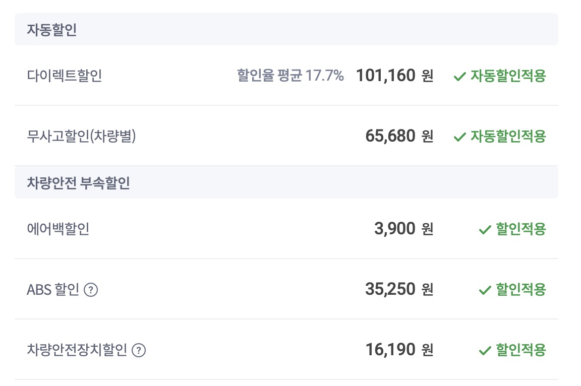 할인 내역을 보면 다이렉트 할인과 무사고할인, ABS 할인 등이 조금 커 보이고요.