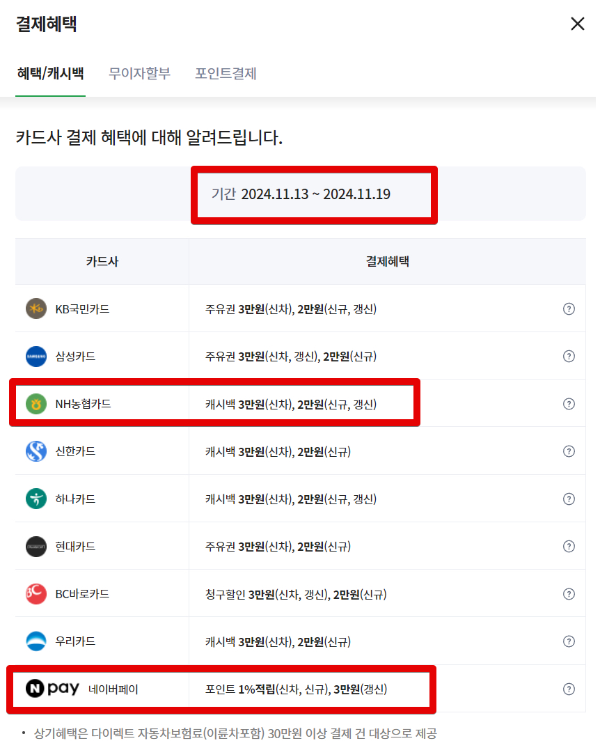 여기에서 카드할인 이벤트 기간에 자동차보험 갱신할 경우, 거의 모든 카드사가 2만원을 청구할인하거나 캐시백 합니다. 만약 네이버페이로 결제할 경우에는 갱신만해도 3만원을 캐시백합니다. 여기까지 오면 자동차보험료는 44만원 → 42만원 or 41만원으로 떨어집니다.