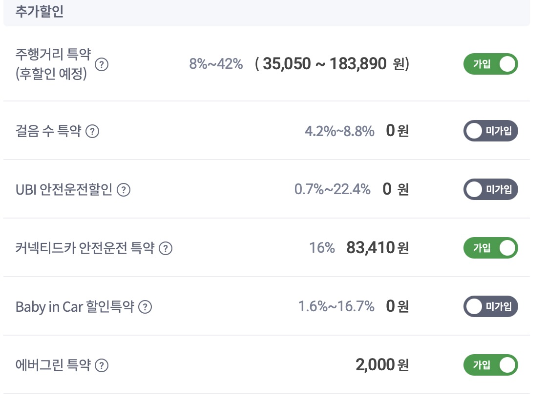 주행거리 특약을 빼고서라도 커넥티드카 안전운전특약이 16%를 할인해주기 때문에 위에 있었던 기본 커넥티드카 할인이랑 엮으면 꽤 큰 금액이 할인됩니다. 걸음수 특약도 있는데 이건 많이 걸으시는분들은 가입하면 도움 될 것 같더라고요.