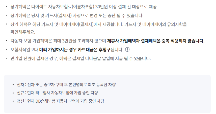 이제 본격적으로 후기 이야기해볼게요. 저같은 경우에는 매년 12월에 자동차보험을 갱신하곤 하는데, 올해는 11월에 갱신하게 되었습니다. 왜냐하면 이렇게 갱신하게되면 네이버페이 3만원을 준다는 이벤트가 있었어요. 이렇게하면 네이버페이 3만원을 받을 수 있게 되고, 여기까지 하게 되면 자동차보험료는 44만원이 아니라 41만원으로 내려가게 되는 효과가 있긴 합니다.