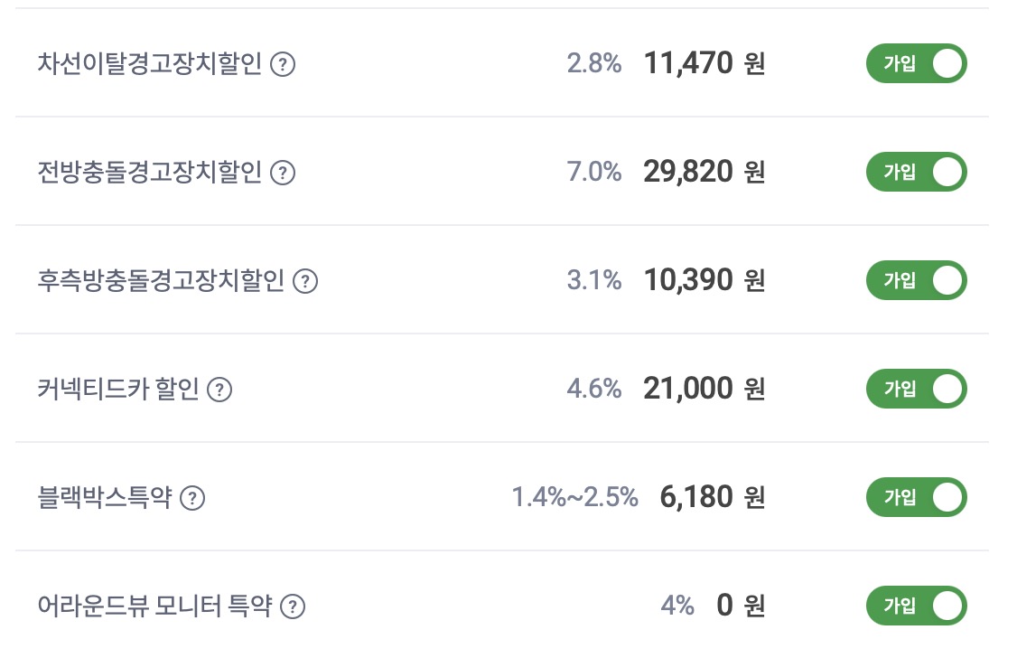 무슨무슨 장치들이 많아가지고 여기에서 많이 할인 받을 수 있는데 특히 커넥티드카 할인이 좋습니다. 여기에 더해서 어라운드뷰 모니터 특약도 4% 할인 반영되면 됩니다. 지금은 아직 가입전이라 0원으로 나오네요.