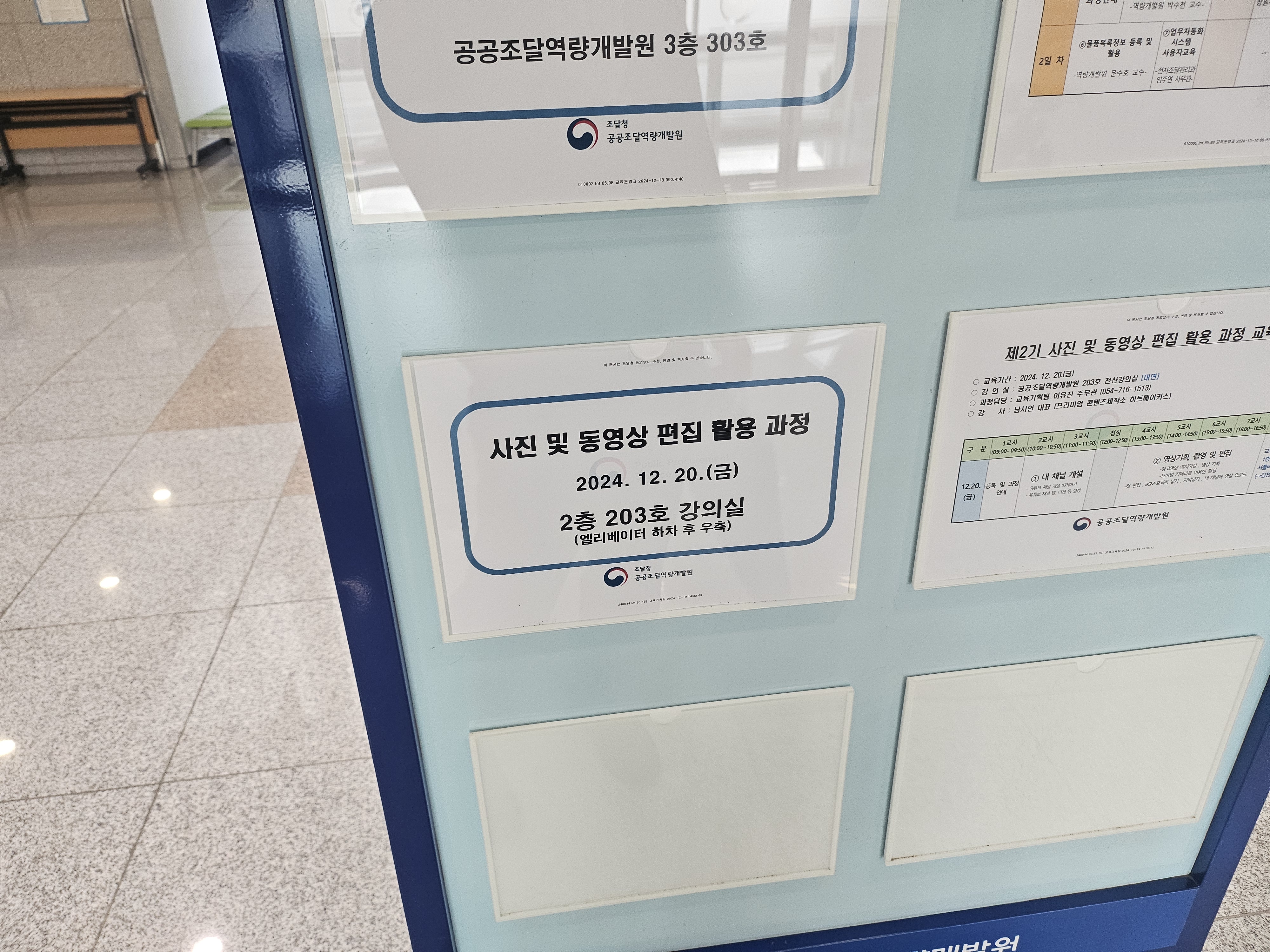 연말 시즌이라서 공공조달역량개발원 로비에도 예쁜 트리가 있더라고요. 올해도 참 감사한 일이 많은 한 해 였는데... 그 중에서 공공조달역량개발원에서 훌륭하신분들과 함께 공부해보고 동영상 만들어보는 시간도 포함됩니다.