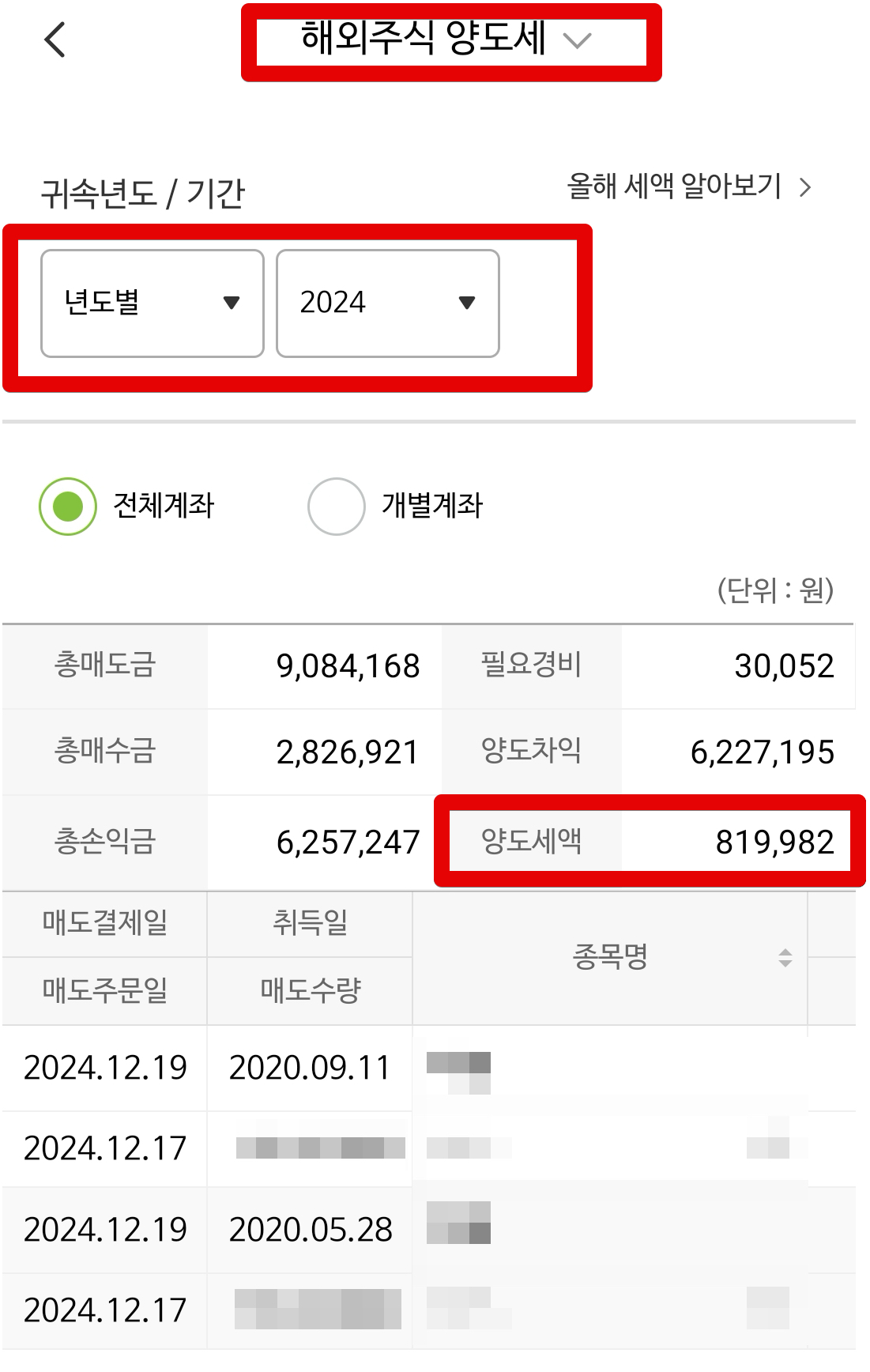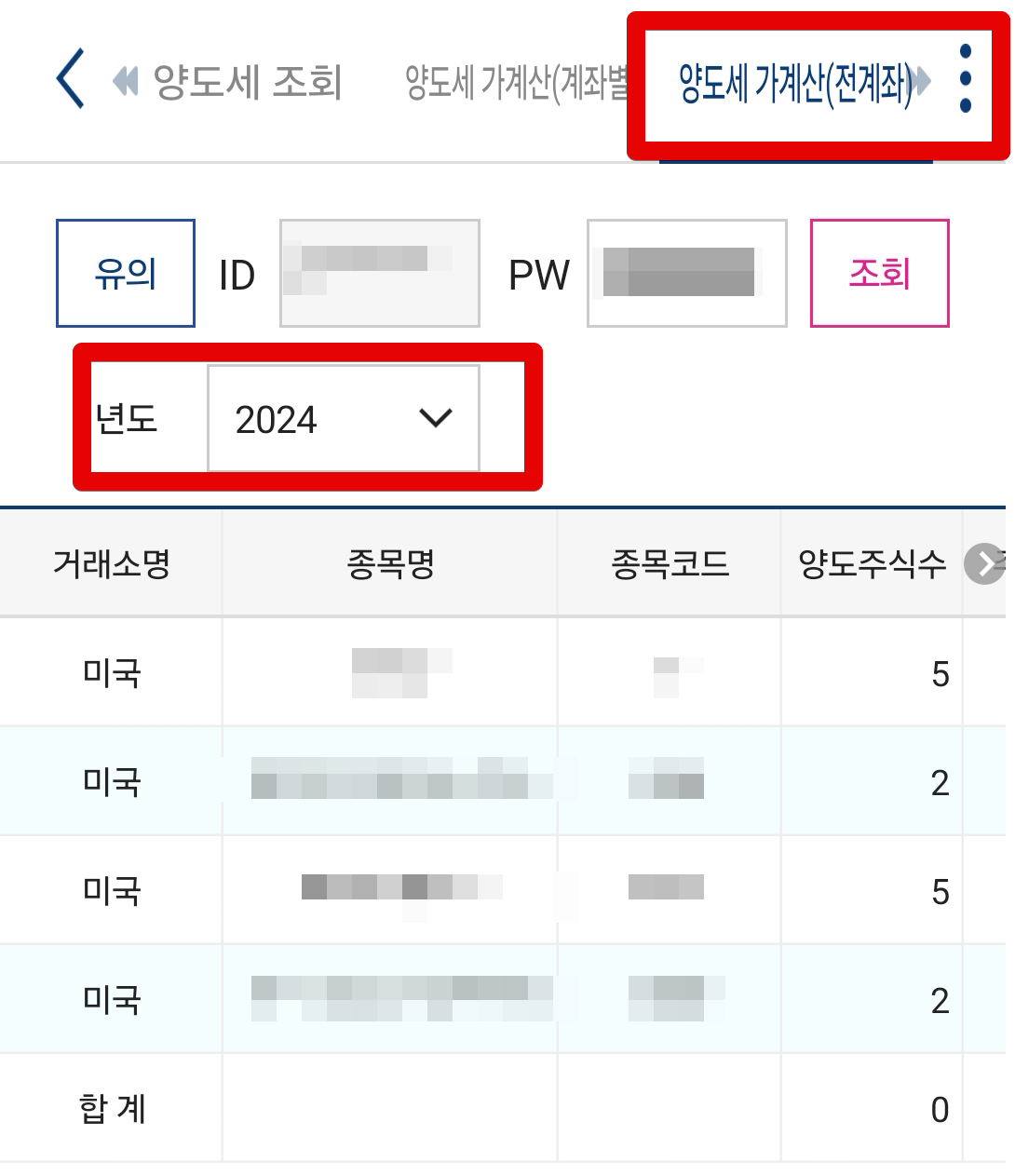 키움증권에서 양도세 가계산을 해볼 수 있습니다. 키움증권 메뉴에서 [양도세 가계산(전계좌)]를 선택하고 2024년을 선택하면 2024년분 양도세를 확인할 수 있습니다.
