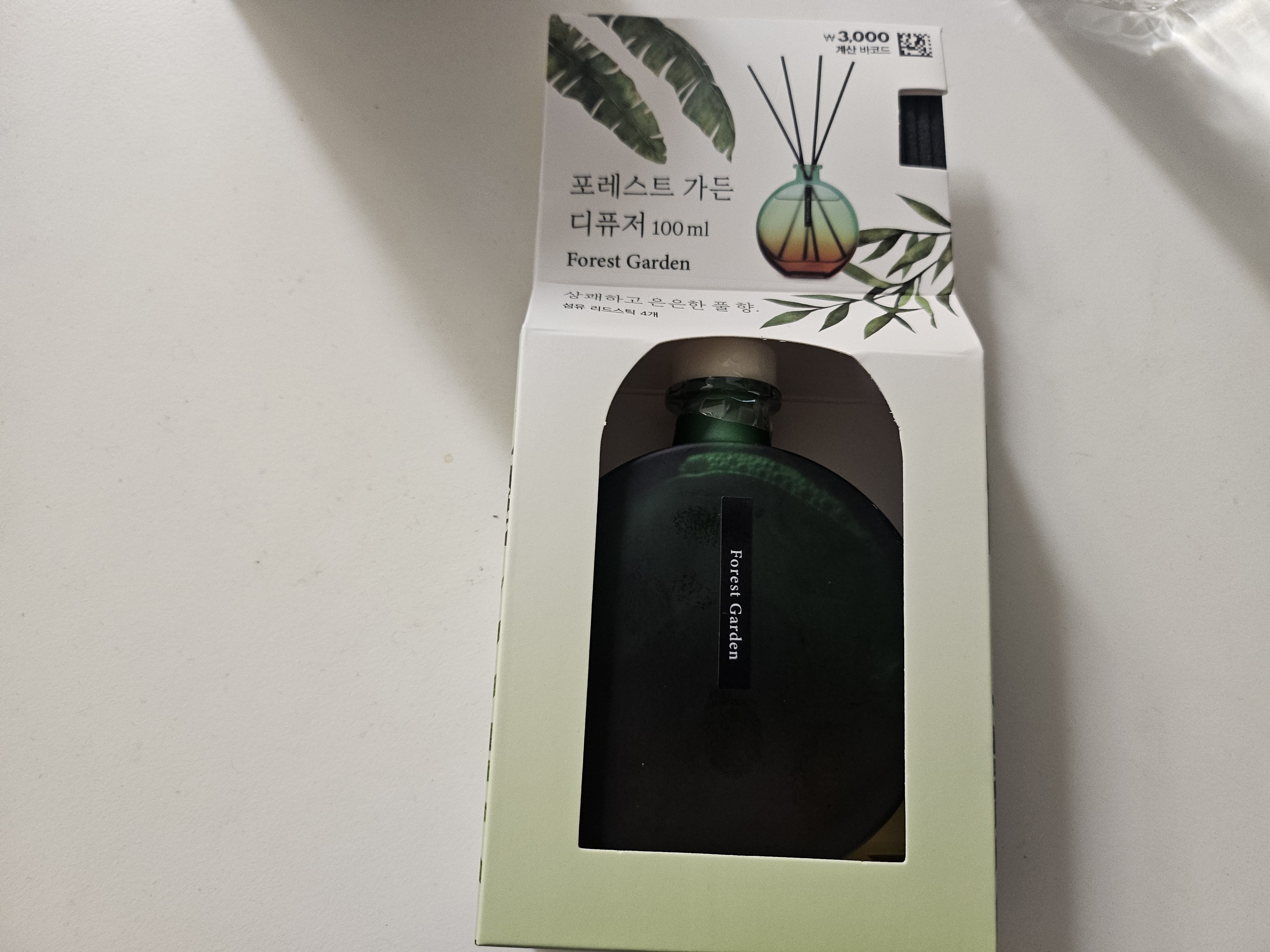 다이소에 디퓨저를 사러 갔다가 포레스트 가든 디퓨저 100ml 라고 하는 3000원짜리 제품이 있길래 한 번 사보았다. 풀 그림과 포레스트 가든이라고 하는 이름이 좋아서 뭔가 풀숲 향기가 날 것 같은 느낌이었다. 미리 시향해볼 수 없는건 아쉬운 부분이라서 디퓨저 박스에 적혀있는 "상쾌하고 은은한 풀 향"이라는 글자만 보고 향을 어느정도 유추해보고 사야하는 측면이 있다.