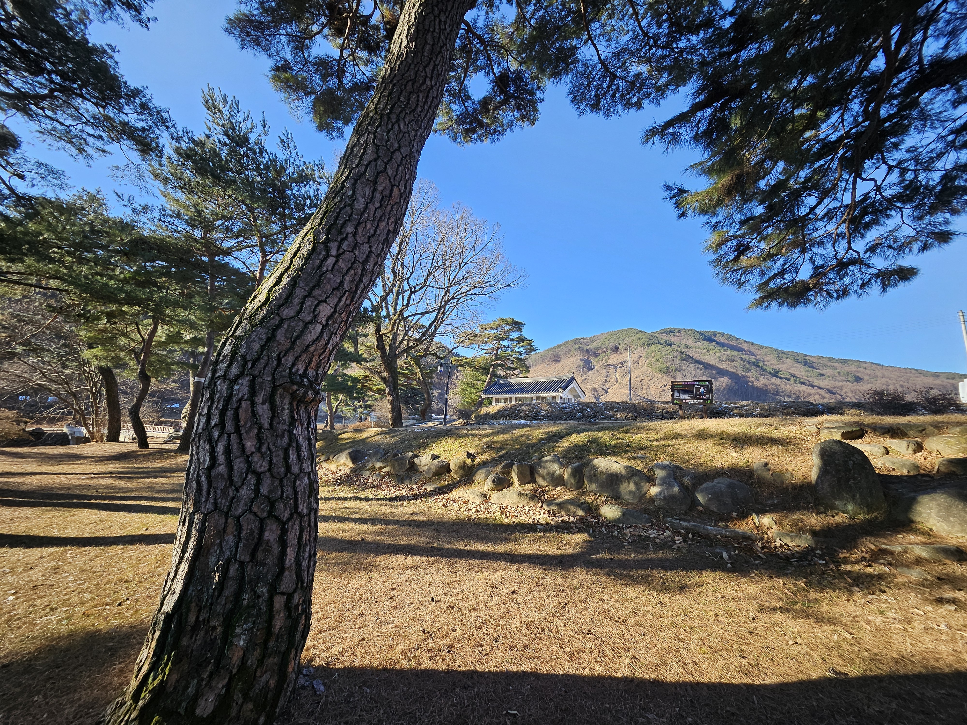 초간정 정면에 있는 소나무 숲에서 바라본 초간정입니다. 이쪽에서 많은 관광객들이 초간정을 배경으로 두고 기념사진을 많이 찍곤 합니다. 여름부터 가을까지는 푸르른 잔디밭을 볼 수 있어서 더욱 예쁜데 지금은 겨울이라서 푸른 느낌보다는 고즈넉한 갈색 느낌으로 겨울 풍경을 느끼게 해주고 있습니다.