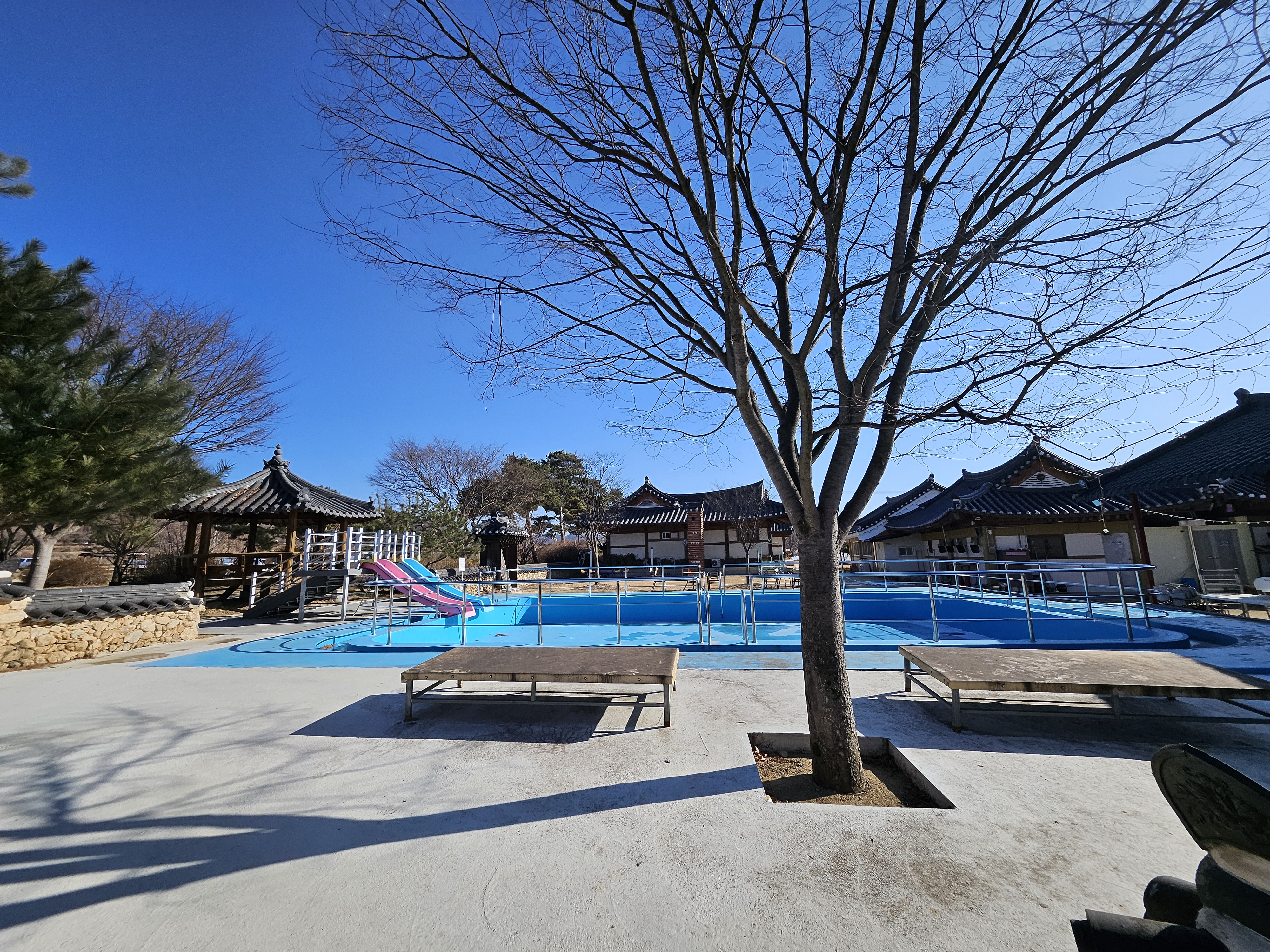 그리고 여기는 저도 이번에 처음 알게된 공간인데 한옥체험관 뒷쪽에 어린이용 수영장이 마련돼 있었습니다. 여기는 살펴보니까 이쪽에서 숙박을 하는 가족단위 관광객분들이 이용하는 그런 공간 같더라고요. 보통 한옥체험관 앞쪽만 둘러보고 뒤로 가보질 않았어서 이런게 생겼다는걸 전혀 몰랐었네요. 한여름에 예천 금당실마을에서 숙박하며 전통문화도 배워보고 수영장 시설도 이용해보면 참 즐거운 추억이 될 것 같습니다.
