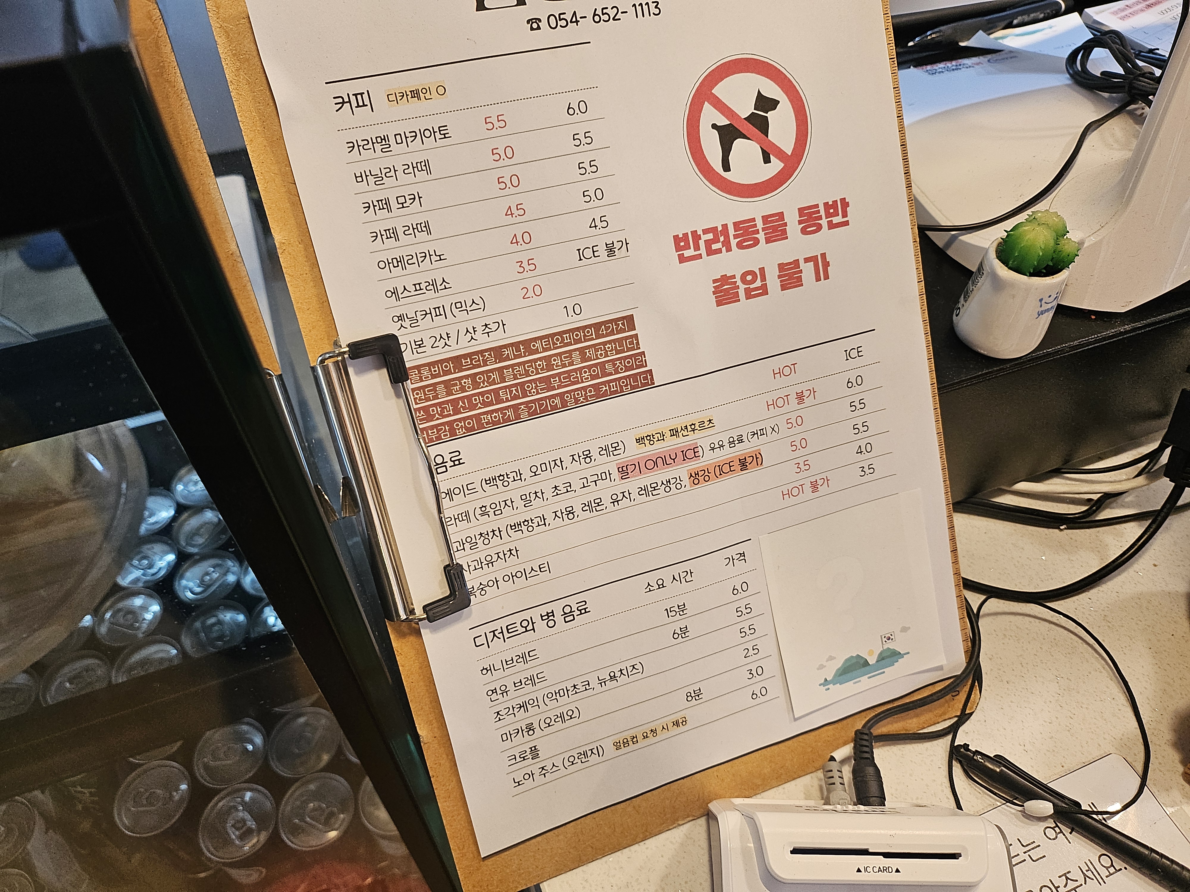 메뉴판 살펴보고 주문하면 되는데요. 다양한 커피류와 음료, 디저트도 있고 병 음료도 판매 중입니다.