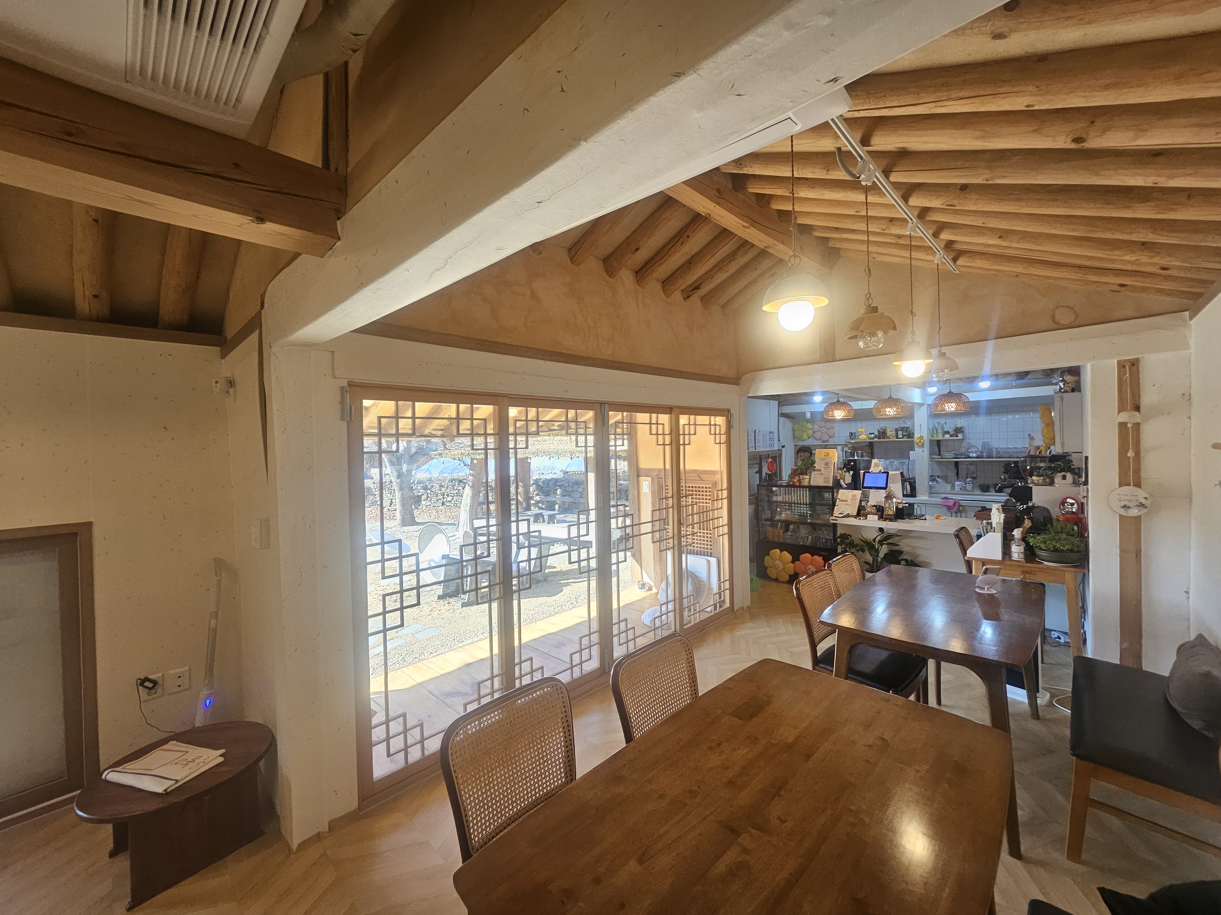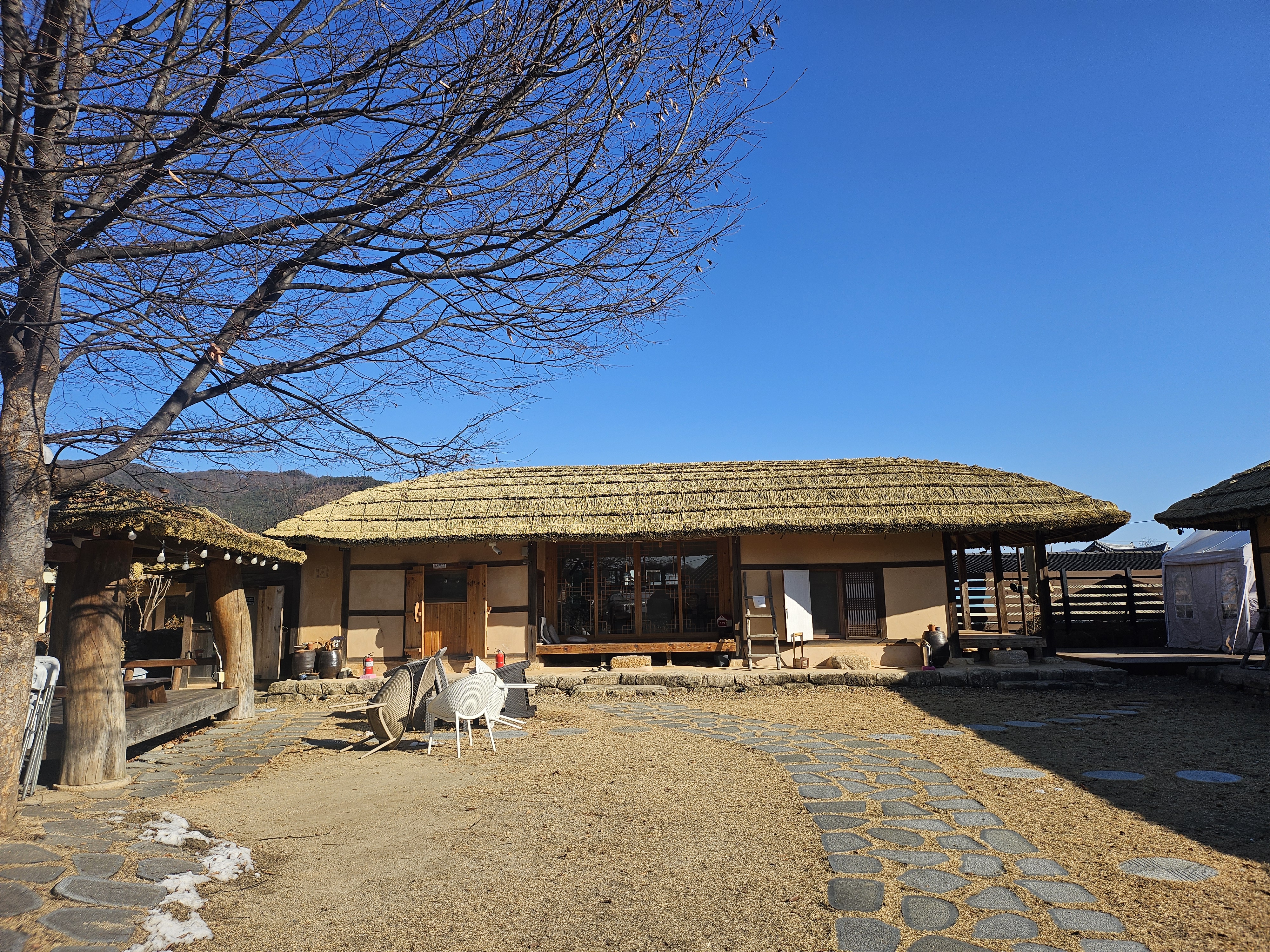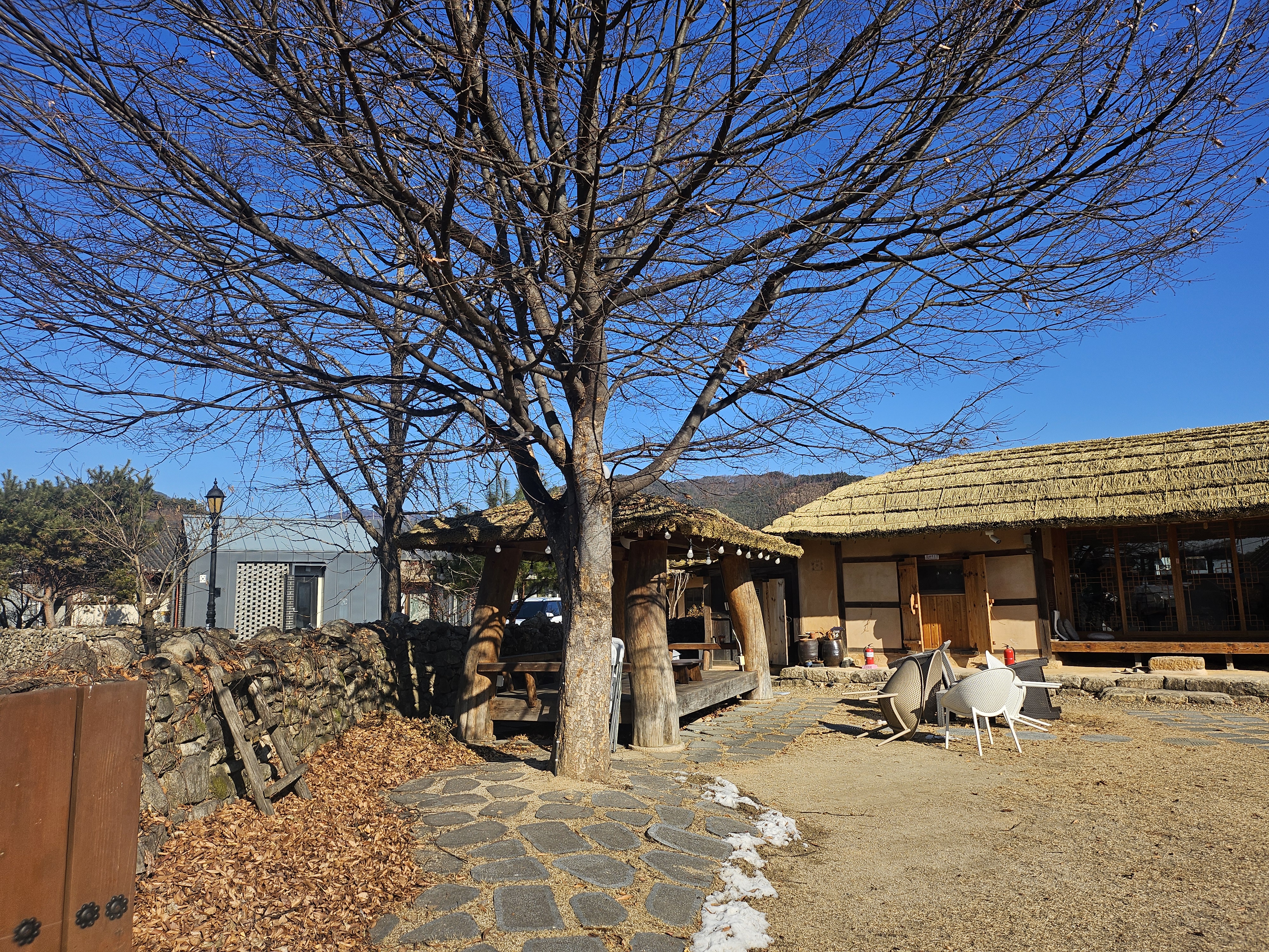 금당마루 카페는 크게 왼쪽 공간과 오른쪽 공간으로 나눌 수 있고 카운터와 테이블이 있는 가운데 본 건물로 구분해서 볼 수 있습니다. 봄여름가을에는 마당에 테이블들도 설치되곤 하는데 이땐 겨울이라서 야외 테이블은 정리된 상태였습니다.