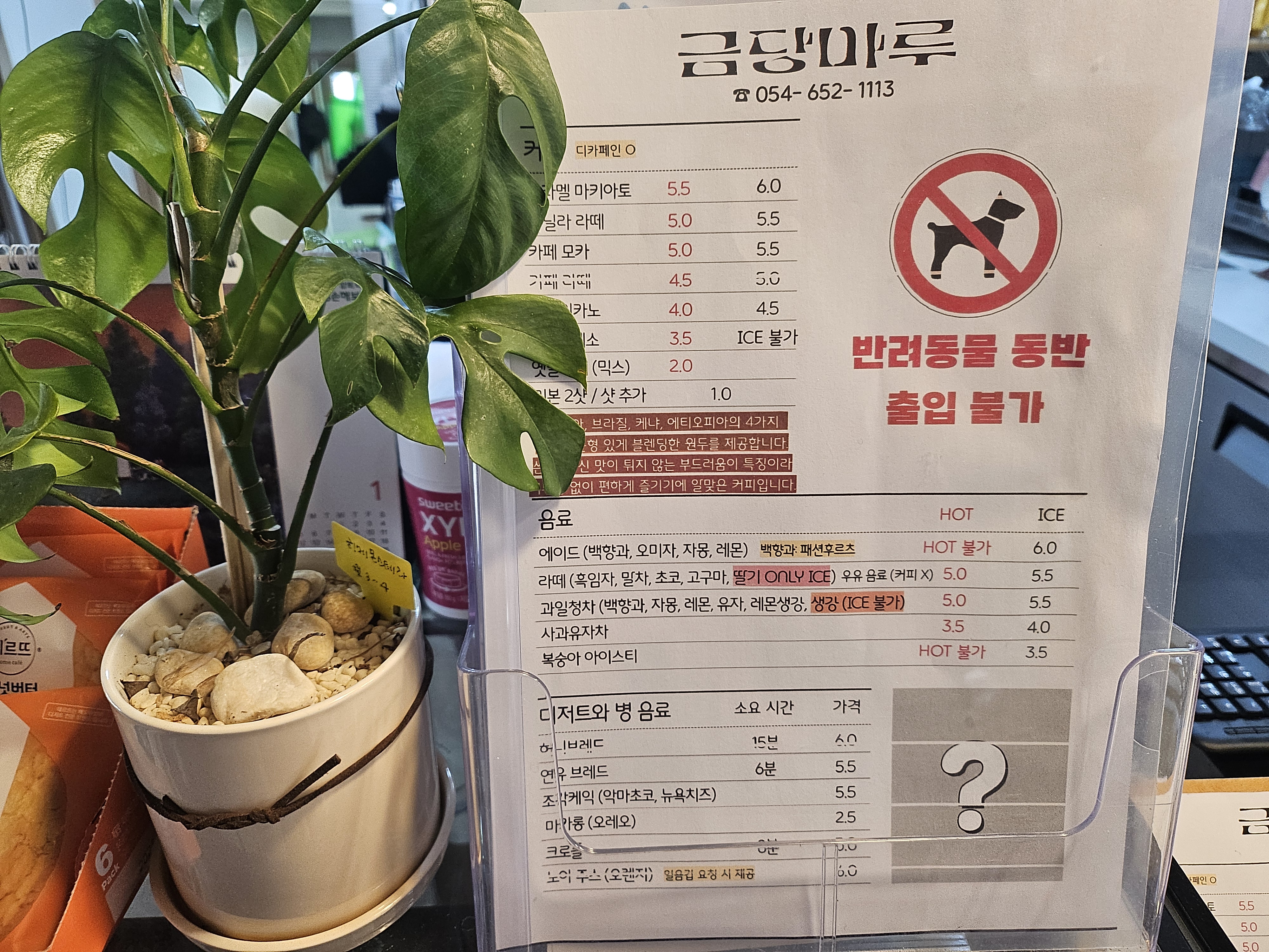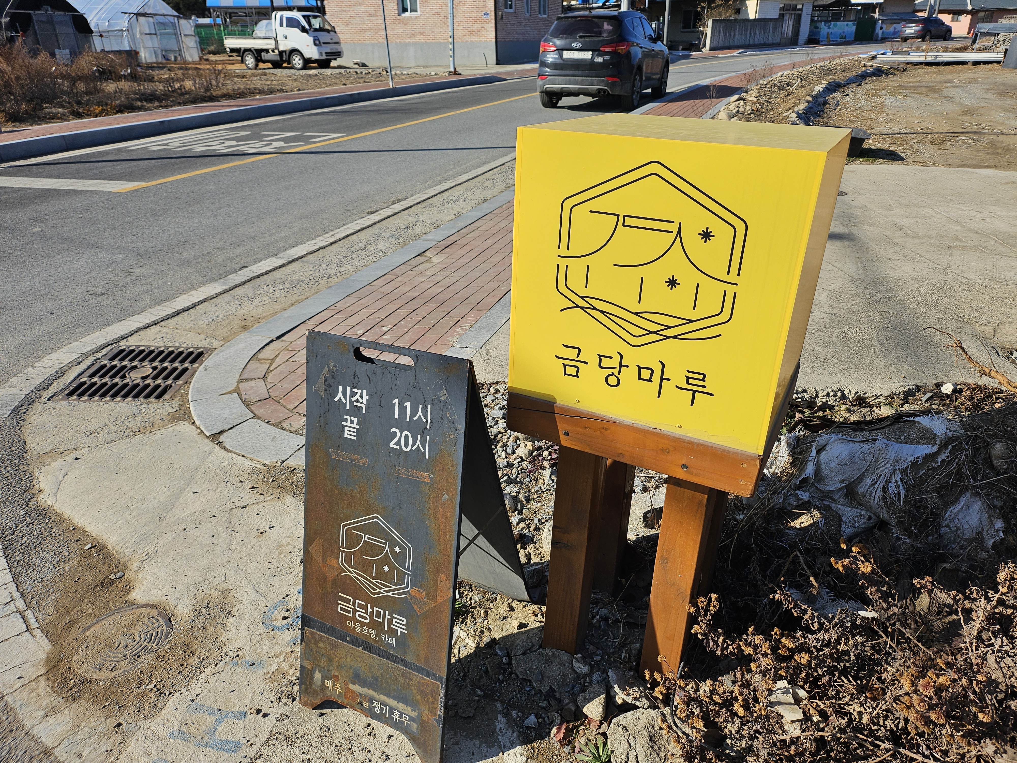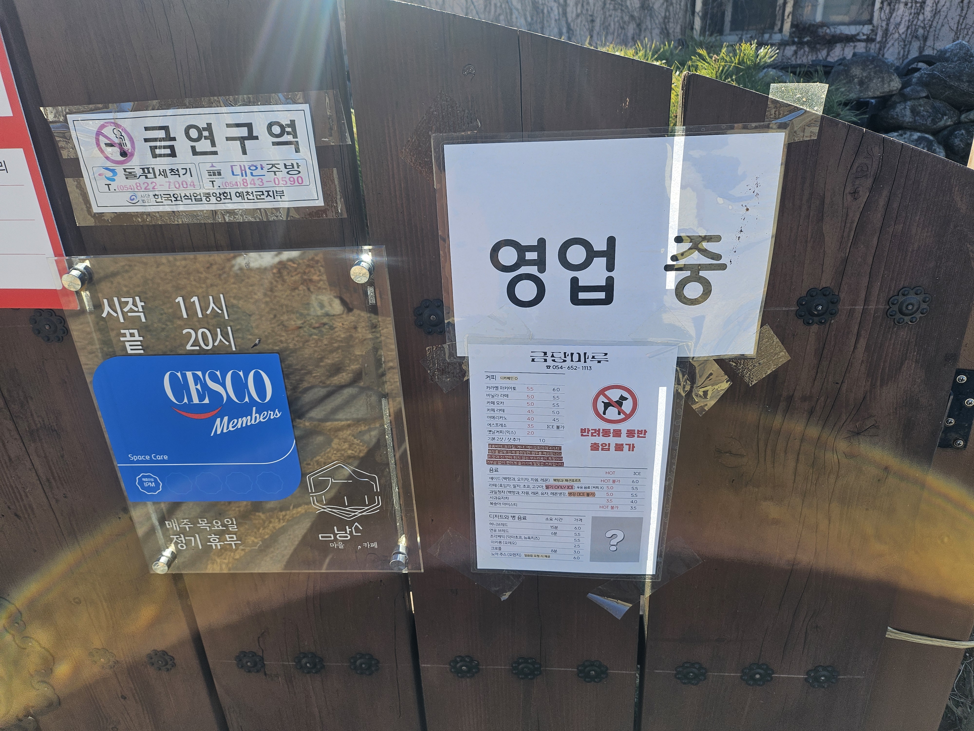 영업시간은 오전 11시부터 오후 20시까지이며 매주 목요일은 휴무입니다. 입구쪽에 금당마루 메뉴판이 있어서 미리 확인하고 들어가볼 수 있어서 좋습니다. 반려동물 동반은 출입이 불가하다고 합니다.