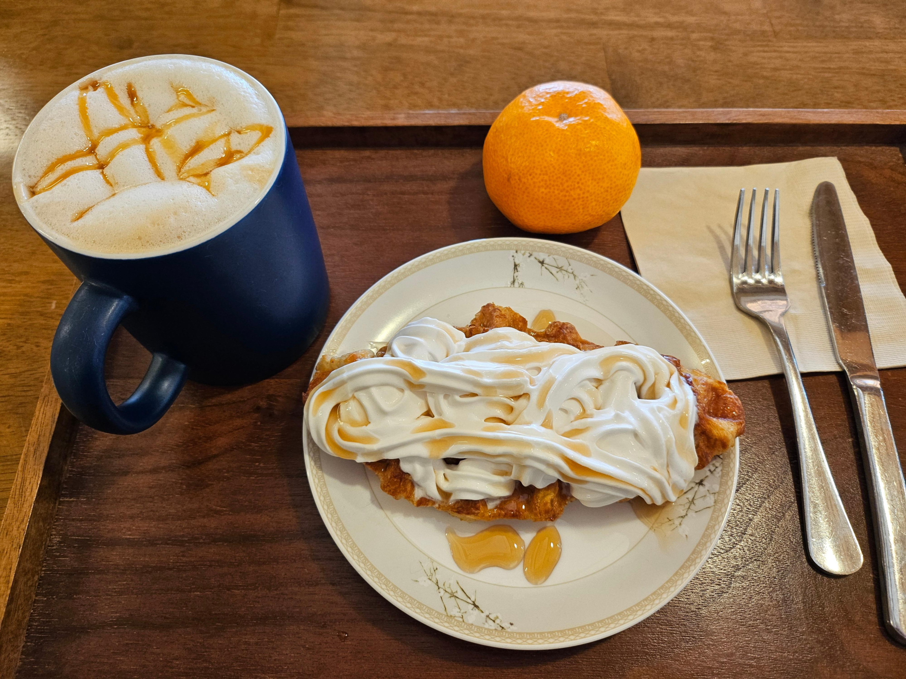 잠시 기다리니 제가 주문했던 커피와 크로플이 나왔습니다. 저기에 있는 귤은 사장님께서 먹어보라며 하나 주셨어요.