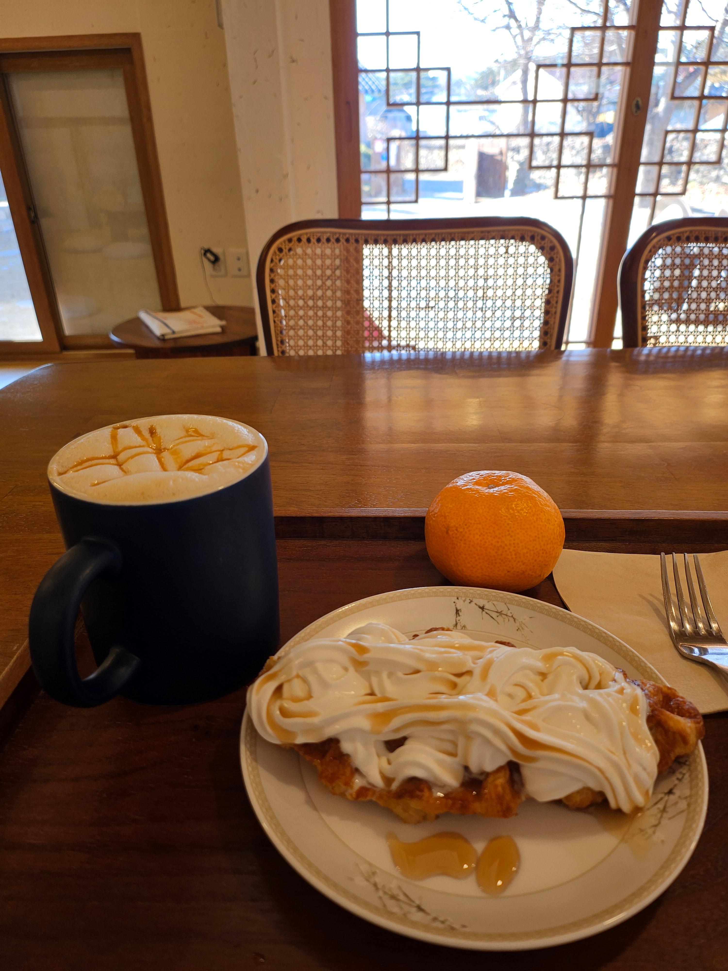 햇살이 따스하게 들어오는 큰 창과 낮은 천장, 그리고 곳곳에 놓인 소품들이 편안하고 아늑한 분위기를 자아내는 예천 금당마루 카페에 방문해봤습니다. 이 곳은 제가 예천 여행할 때 예전에 금당마루 카페에 처음 갔었다가 음료와 디저트가 맛있고 풍경이 예뻐서 그 이후로도 종종 찾는 카페가 된 곳인데요. 추운 겨울날, 따뜻한 차 한 잔은 행복을 가져다 주더라고요. 금당마루에서는 다양한 종류의 커피를 맛볼 수 있었습니다. 이번에는 카라멜 마끼아또랑 디저트로는 크로플을 골라보았습니다.