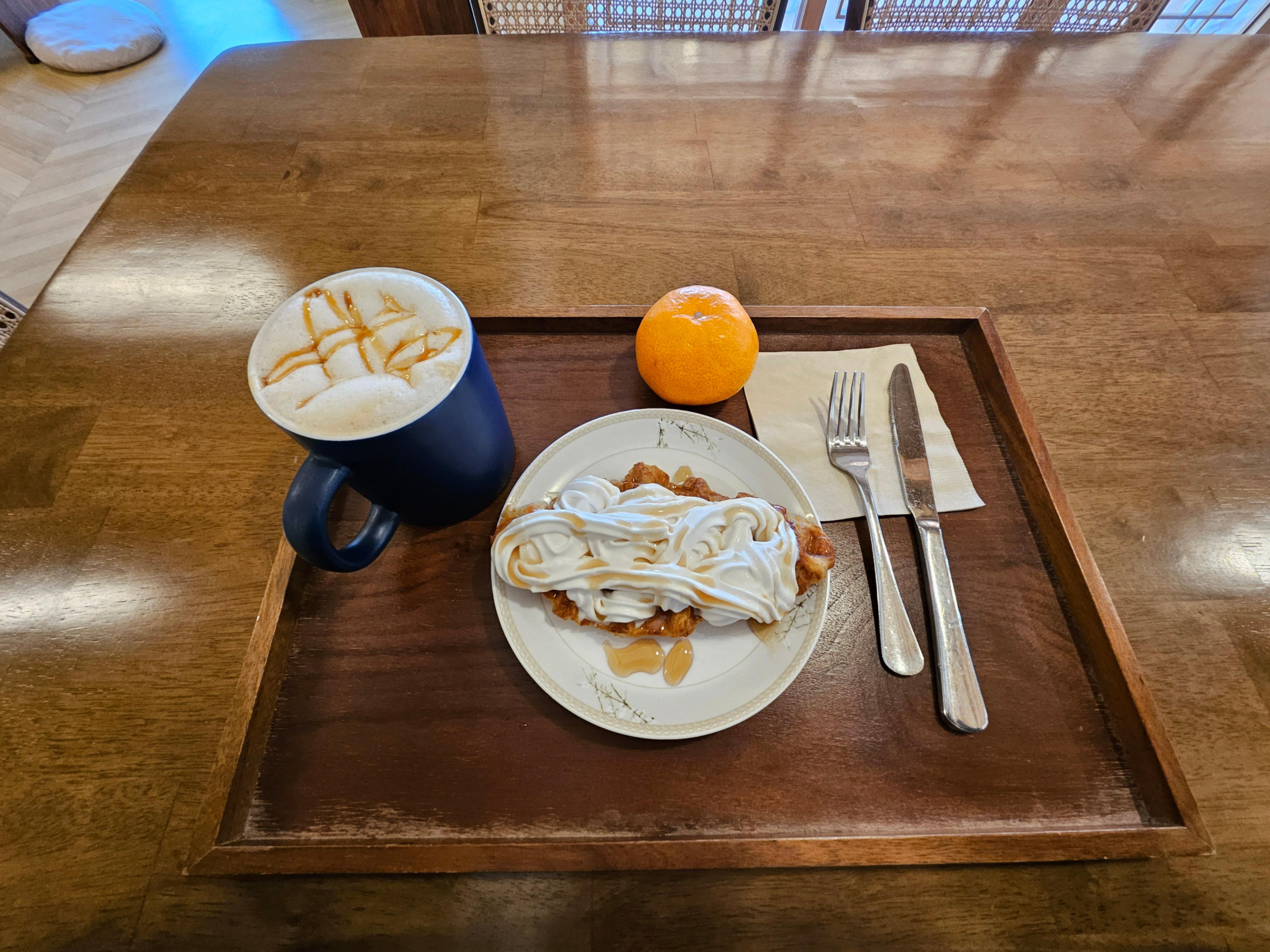잠시 기다리니 제가 주문했던 커피와 크로플이 나왔습니다. 저기에 있는 귤은 사장님께서 먹어보라며 하나 주셨어요.