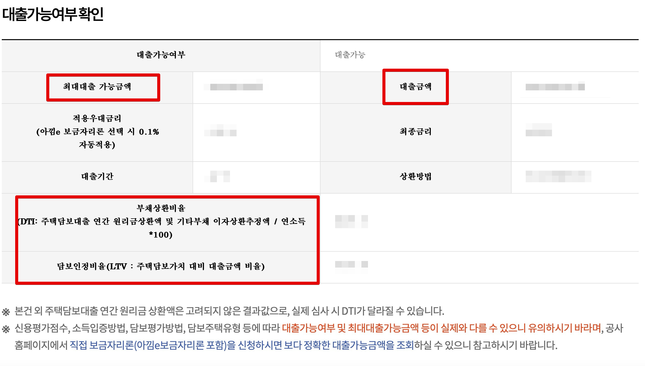 예를들어 한국주택금융공사 홈페이지에서 보금자리론 예상대출조회를 해보게 되면, 위 이미지에서와 같이 대출가능여부, 최대대출 가능금액, 부채상환비율(DTI) 담보인정비율(LTV) 등을 확인할 수 있다.