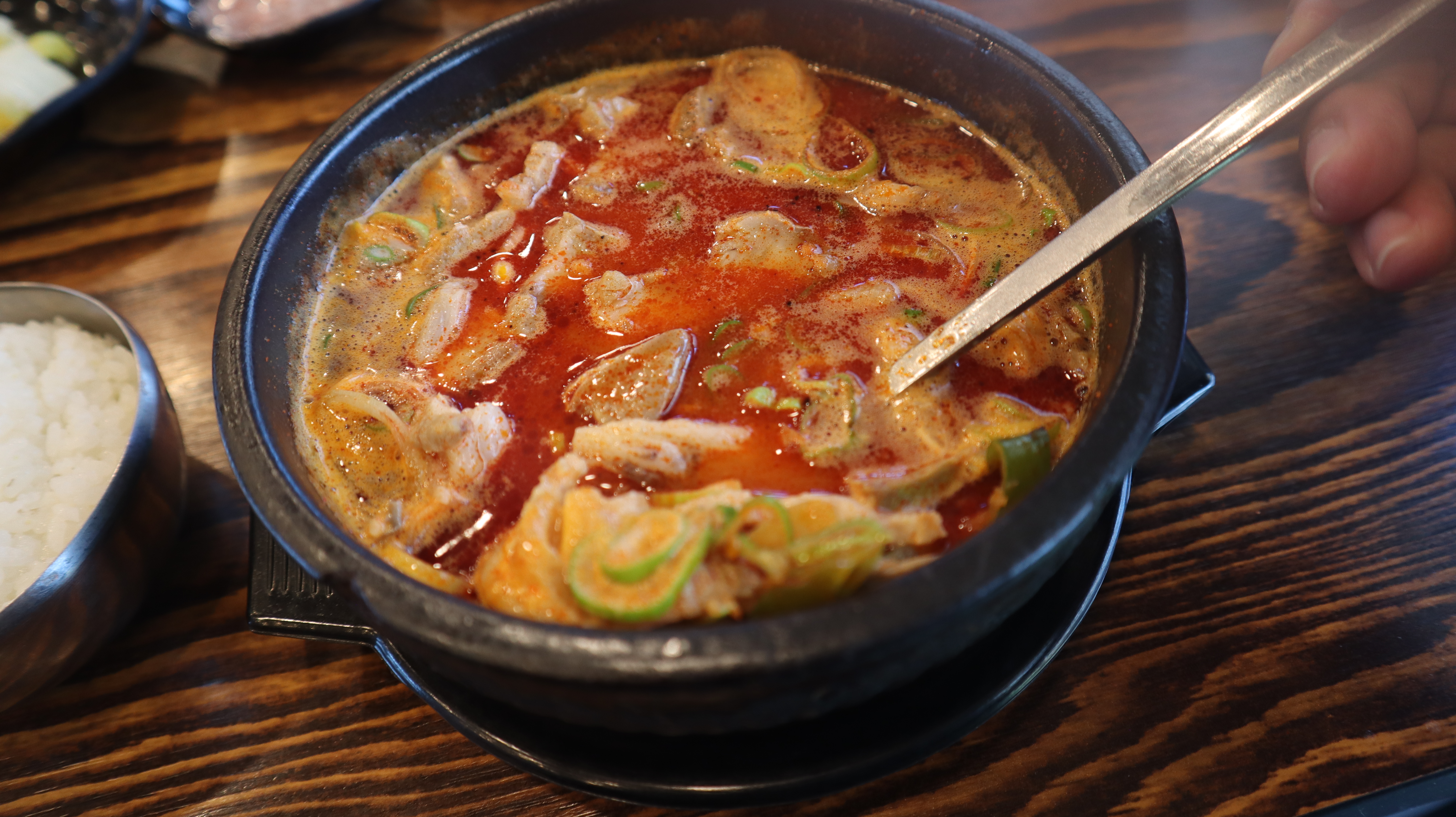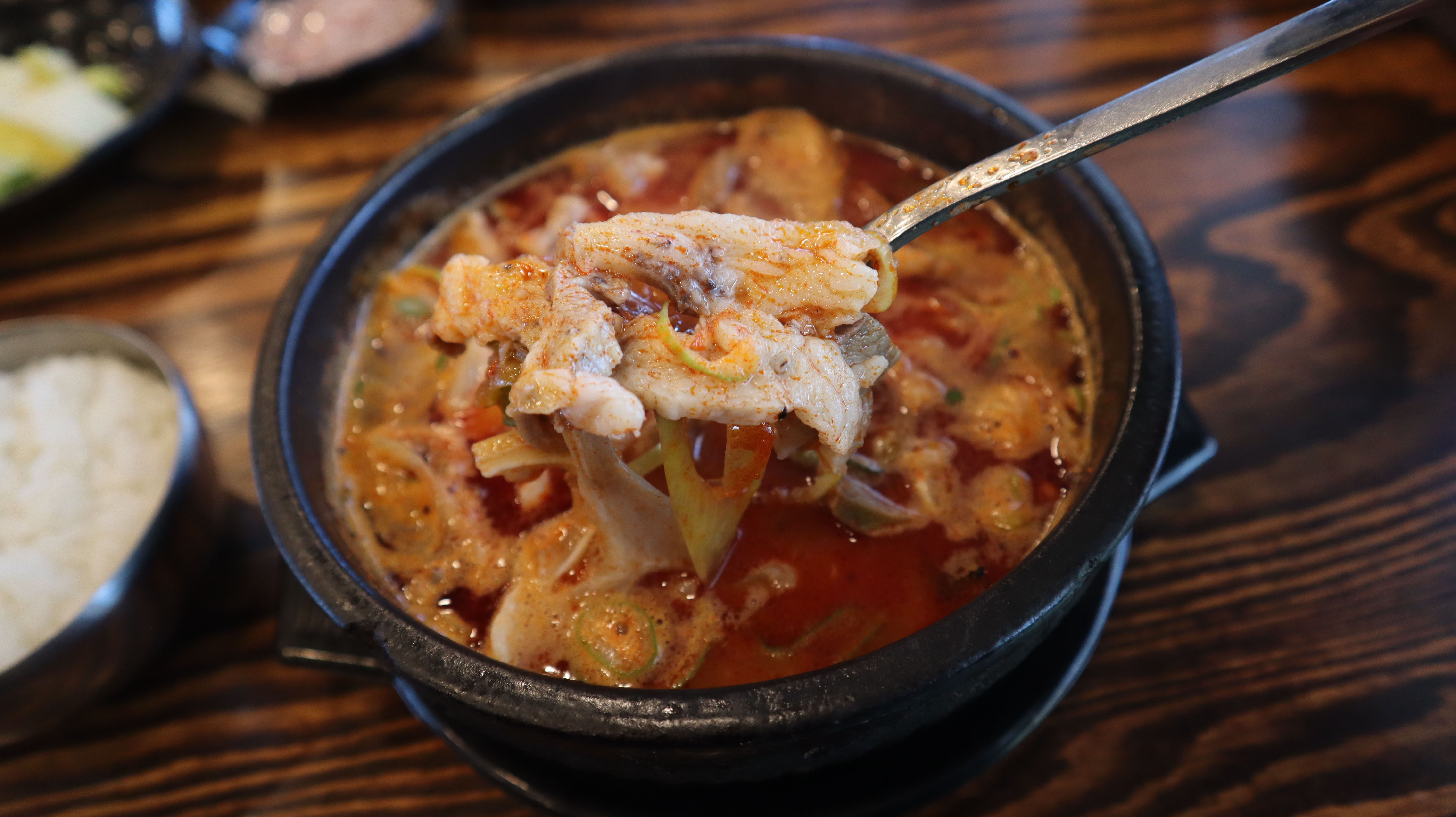 건더기가 굉장히 푸짐하게 들어가 있어서 양이 많은 편입니다. 쫄깃한 고기들과 오징어 건더기들이 어우러져 환상적인 맛을 선사합니다. 잡내 없고 얼큰하면서도 자극적이지 않은 맛이 입안 가득 퍼지는 느낌이었어요. 기본적으로 얼큰한 편이라서 해장용으로도 좋을 것 같습니다.