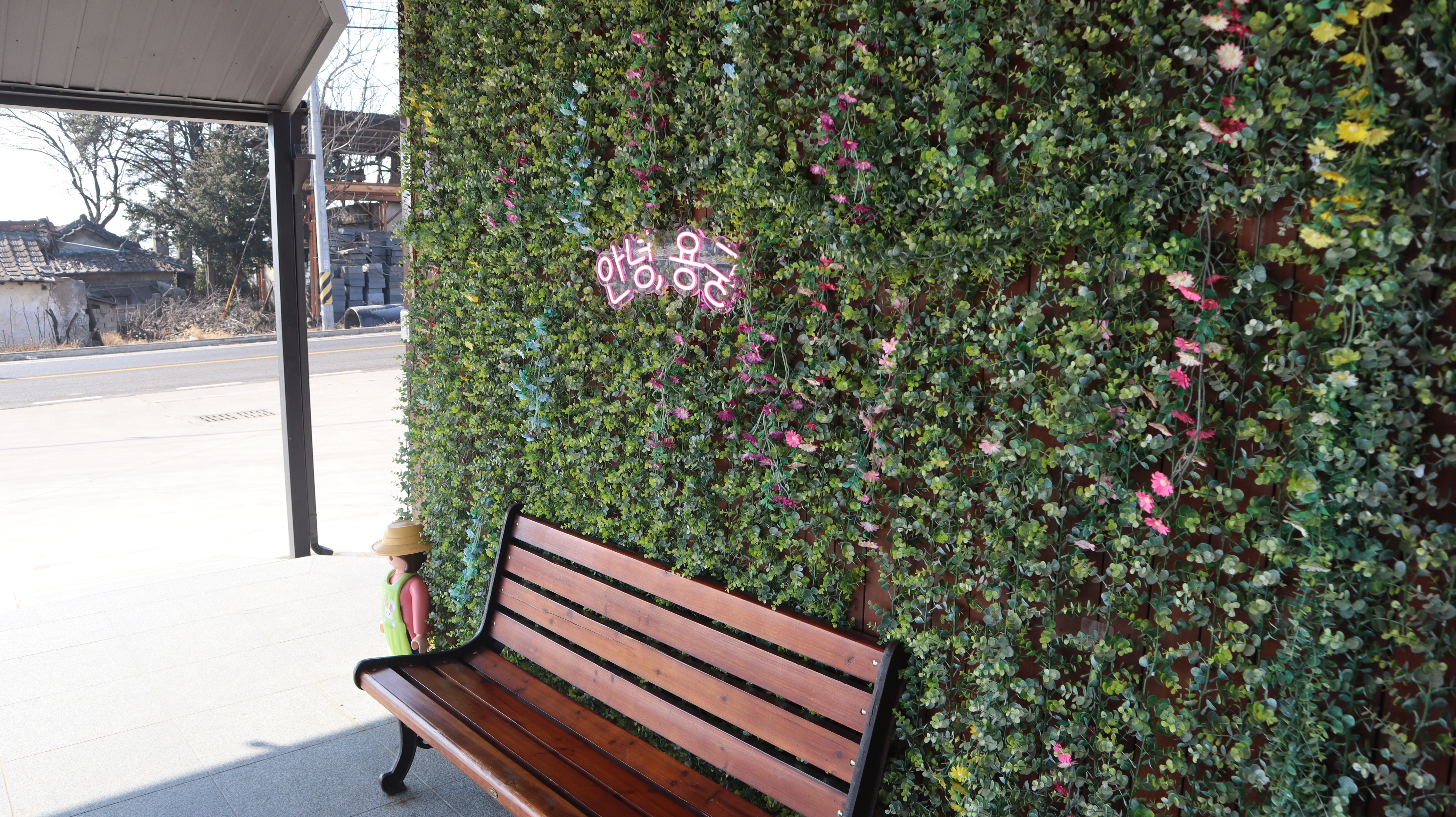 입구쪽에 "안녕, 용궁"이라는 LED 텍스트가 보이는 트렌드에 어울리는 포토존겸 쉼터 벤치도 있습니다.