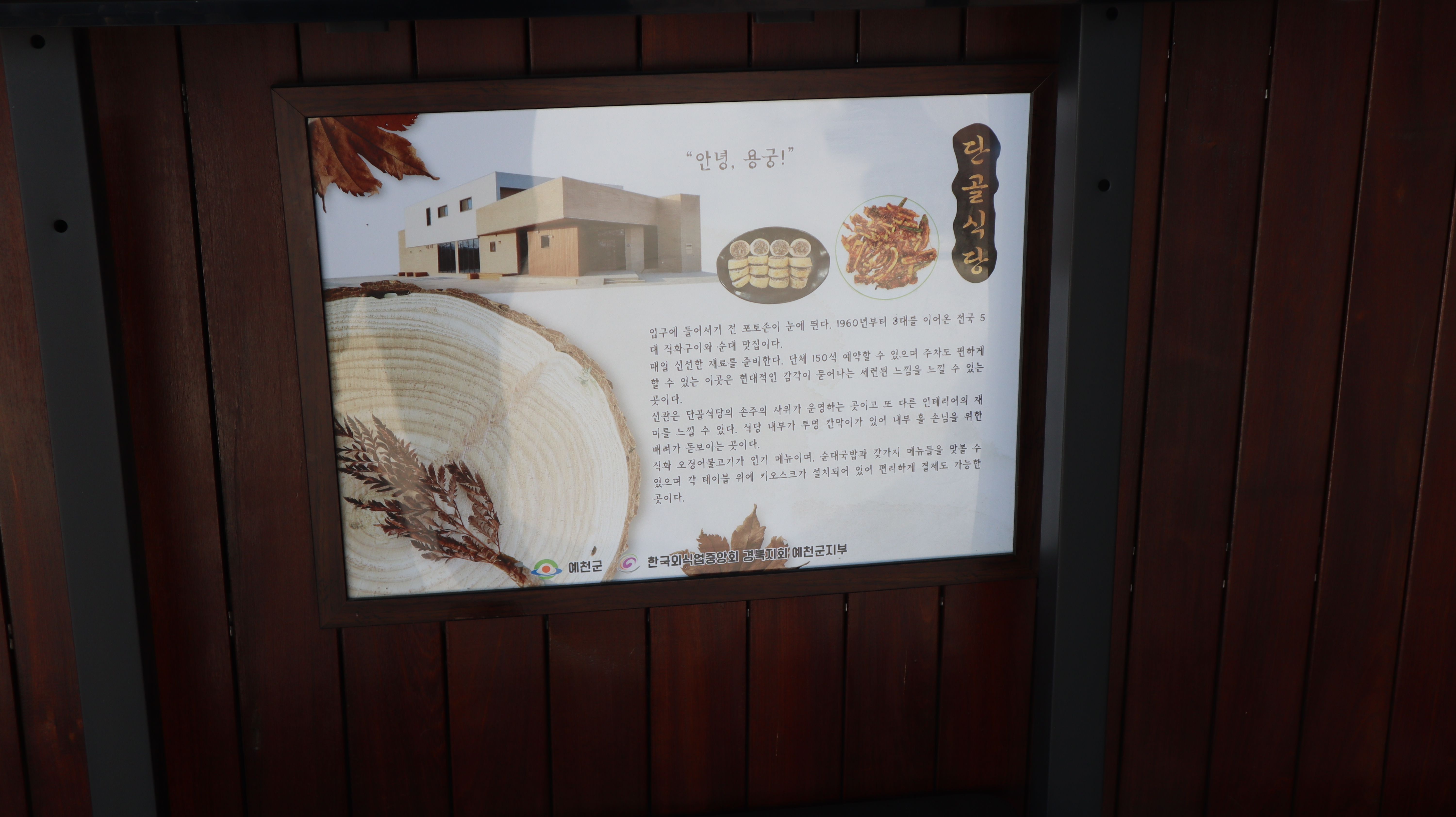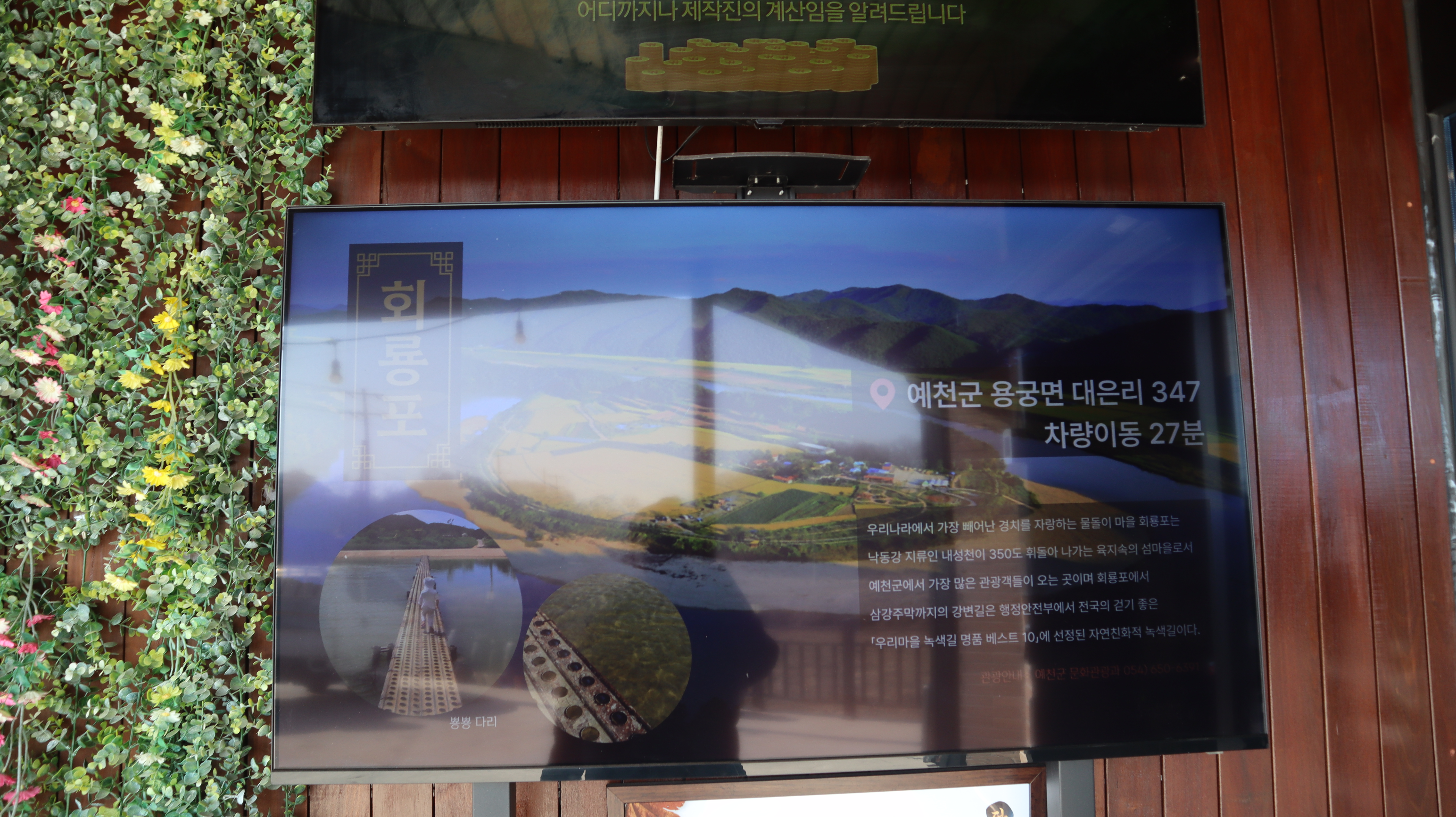 입구쪽에 TV같은걸로해서 모니터에서 다양한 것들이 나오고 있더라고요. 용궁순대와 단골식당에 대한 내용과 예천 여행지에 대한 내용도 있어서 흥미롭게 잠깐 살펴봤습니다. 예천 용궁 단골식당 신관은 9시 30분부터 22시까지 영업한다고하며 매주 수요일은 휴무라고 합니다.