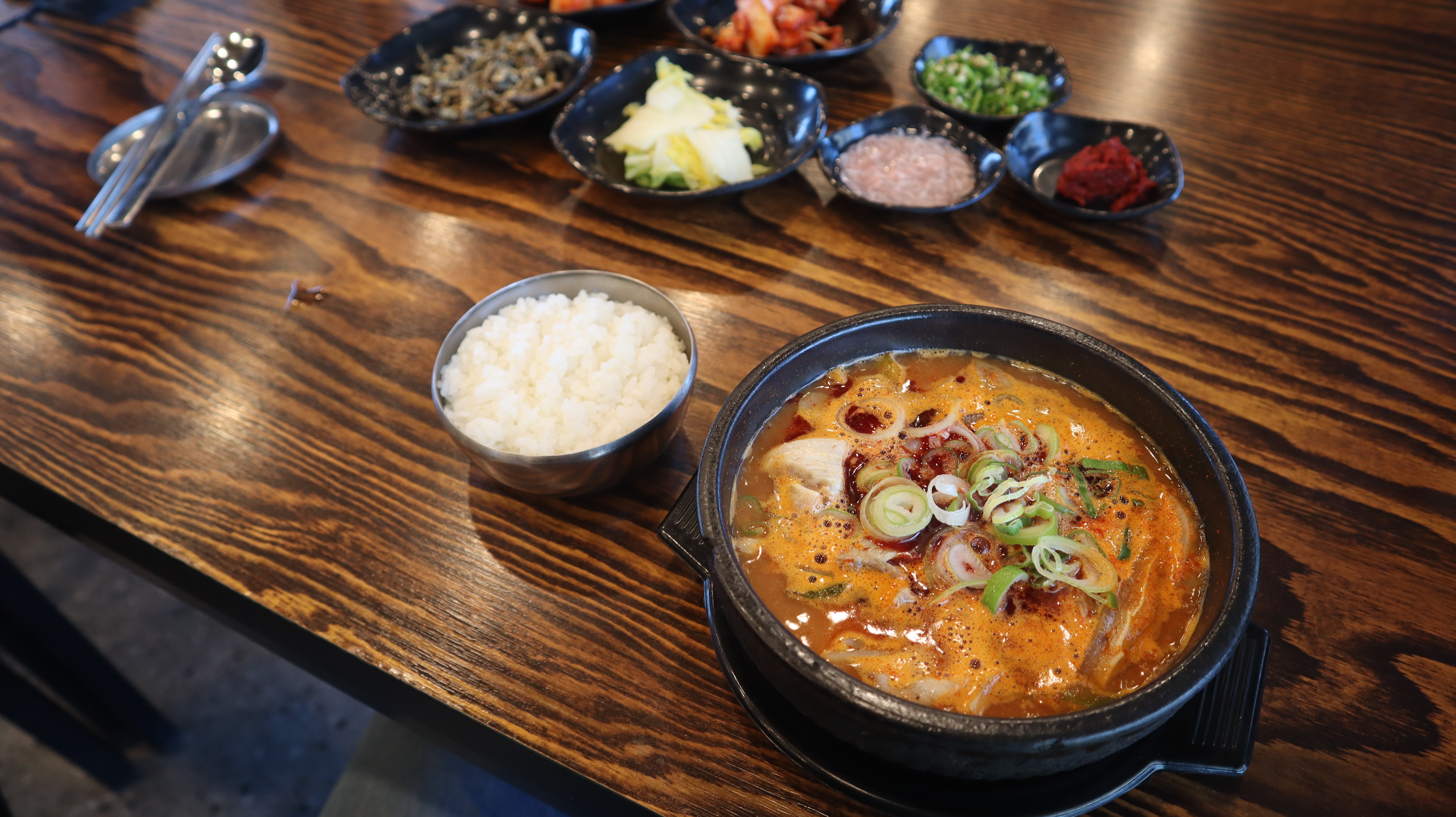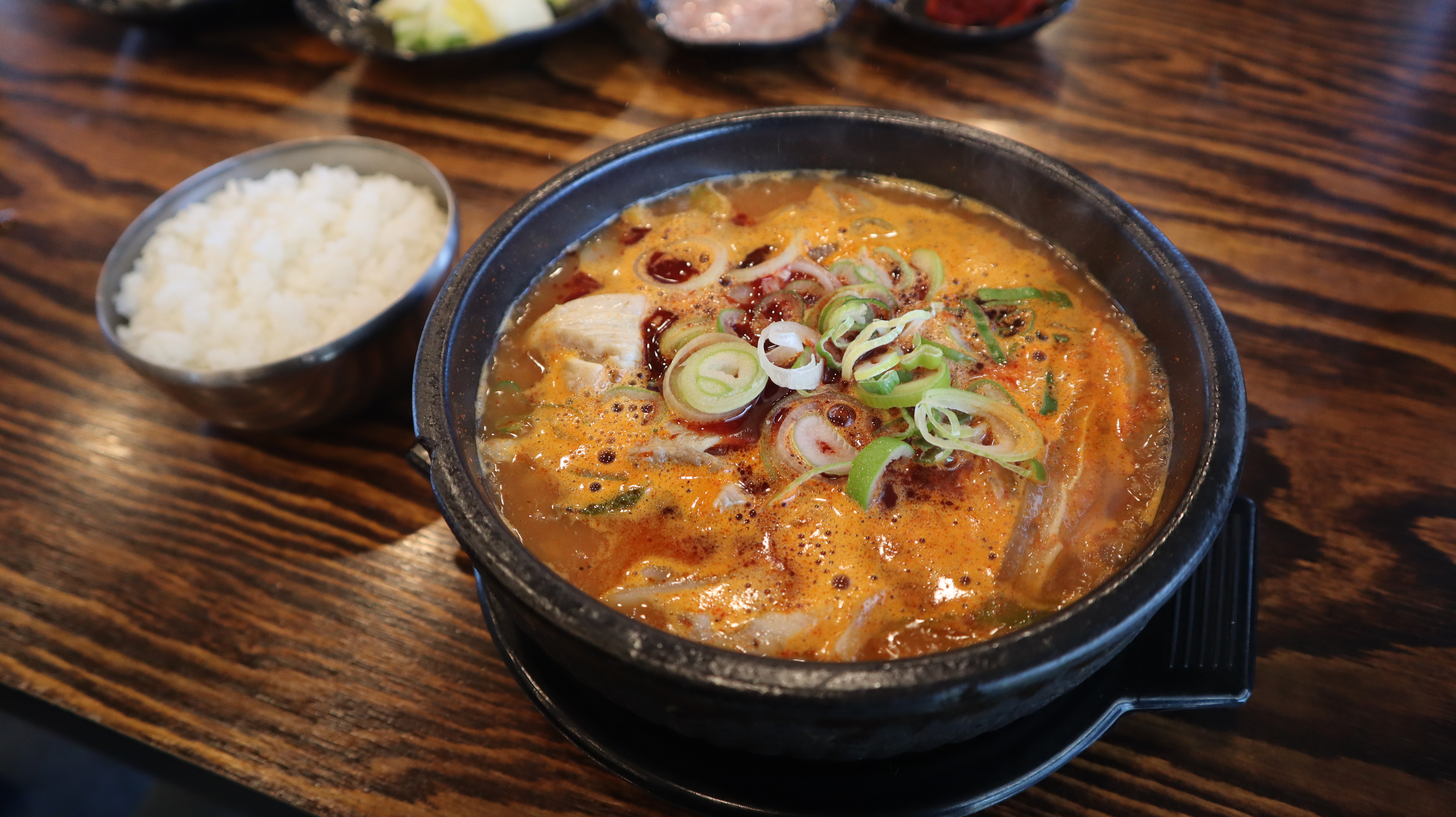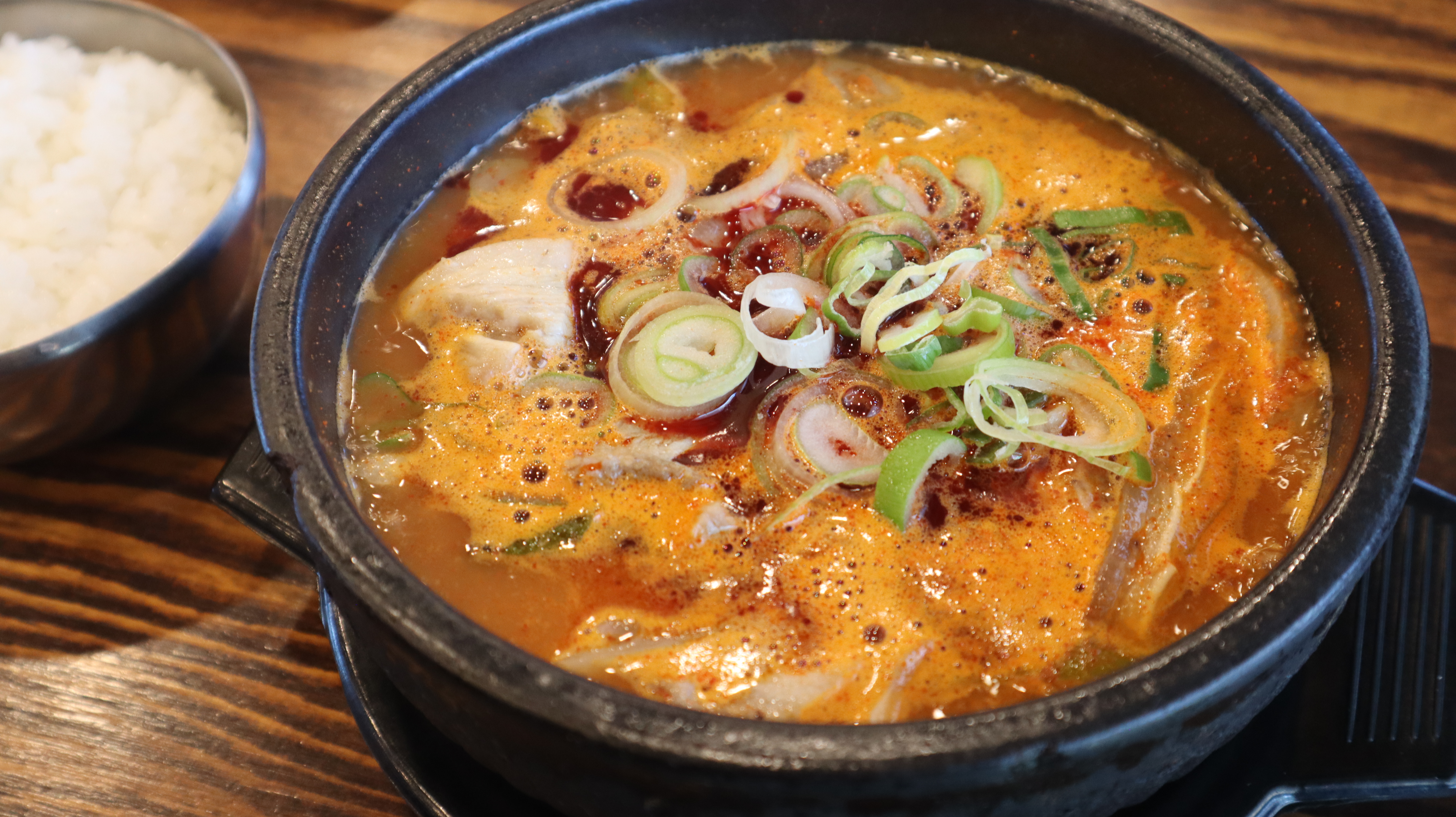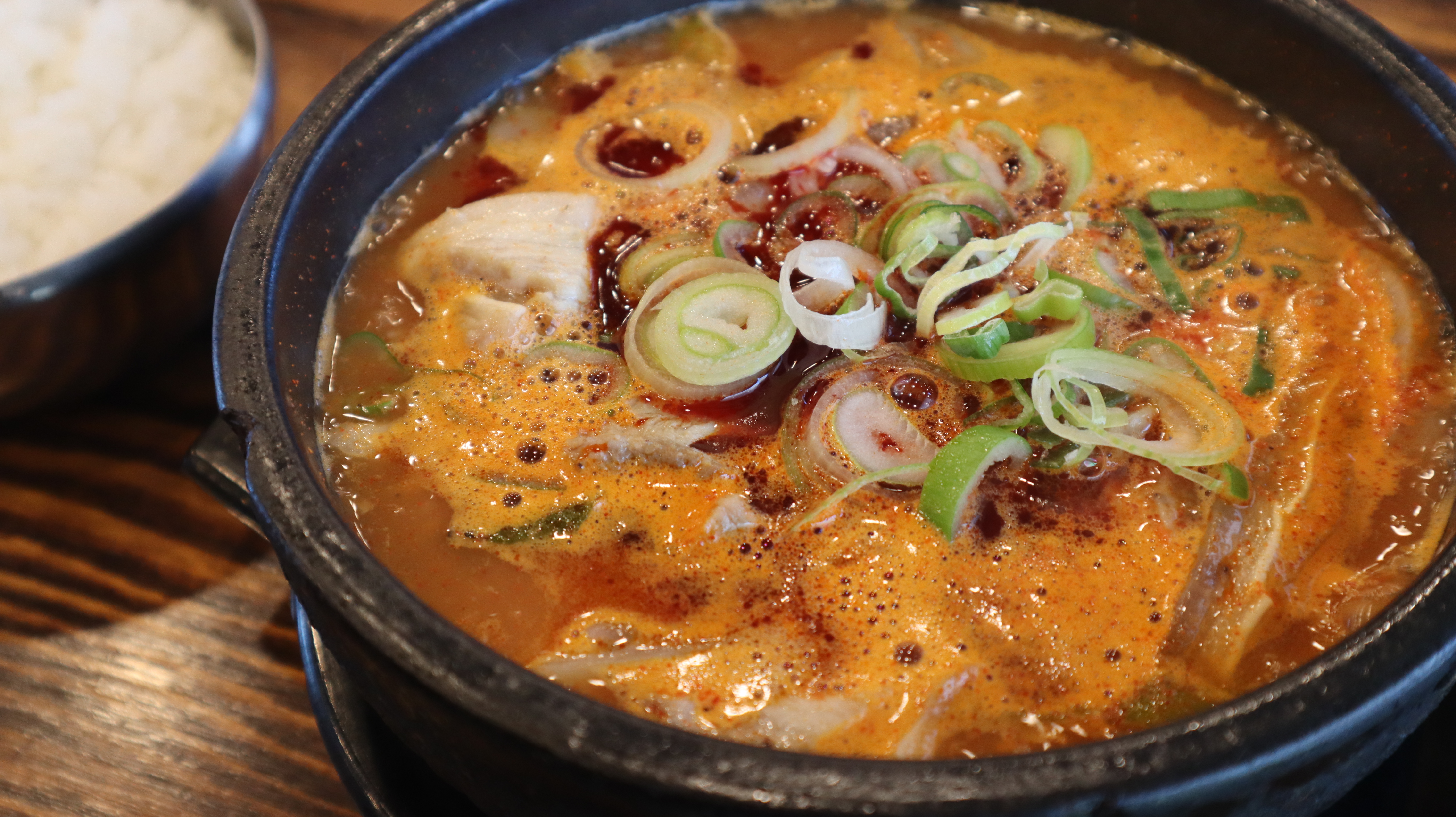 얼큰한 국물에 건더기가 듬뿍 들어간 직화돼지국밥은 보기만 해도 군침이 돌았는데요. 건더기들도 큼지막한 크기로 썰어져 있었고, 윤기가 좌르르 흐르는 모습이었습니다.