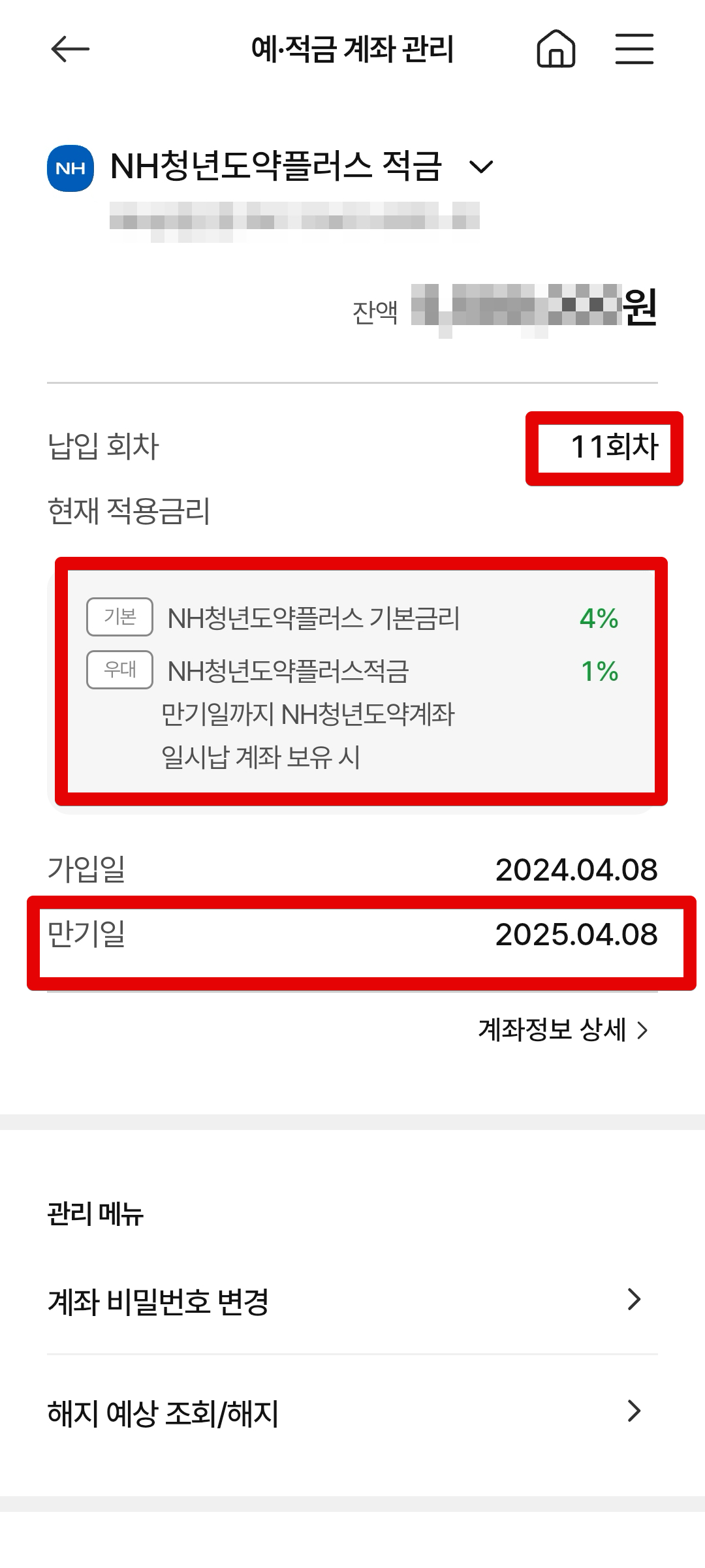 일단 계좌를 살펴보게 되면, NH청년도약플러스적금 상품이고 이 상품은 예전에 청년도약계좌 가입 이후 일시납을 했을 경우 중간에 저축이 비어있는걸 방지하기 위해 추가로 만들어진 상품으로 1년짜리 한시 상품이다. 현재 11회차까지 넣었고, 금리 5%대로 나름 괜찮은 상품이었고 만기일이 4월 8일이었는데 아쉽게도 2개월도 안되는 기간을 남겨두고 해지하게 되었다.