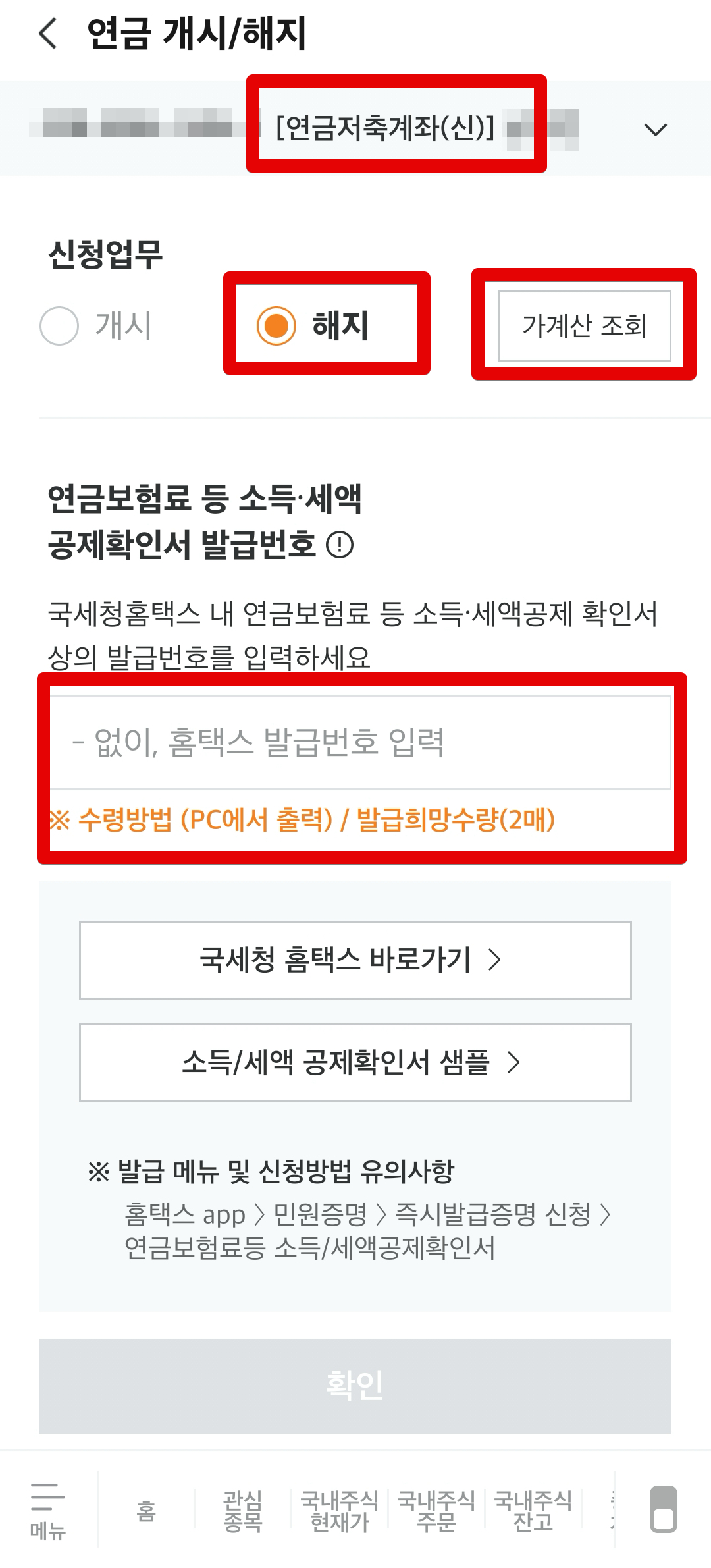 미래에셋증권 앱에서 [연금] - [연금관리] - [연금 개시/해지]를 클릭한다. 연금 개시/해지 창이 나타나면 신청 업무에는 [해지]를 선택한다. 이때 [가계산 조회] 기능을 이용해볼 수 있는데 말 그대로 가계산이라서 100% 정확하진 않을 수 있고 내용이 자세히 나와있지 않은 느낌이었다. 다음으로 연금보혐료 등 소득 세액 공제확인서 발급번호를 입력해서 나중에 전화상으로 직원분께서 내용을 볼 수 있도록 하는 과정이 필요하다.