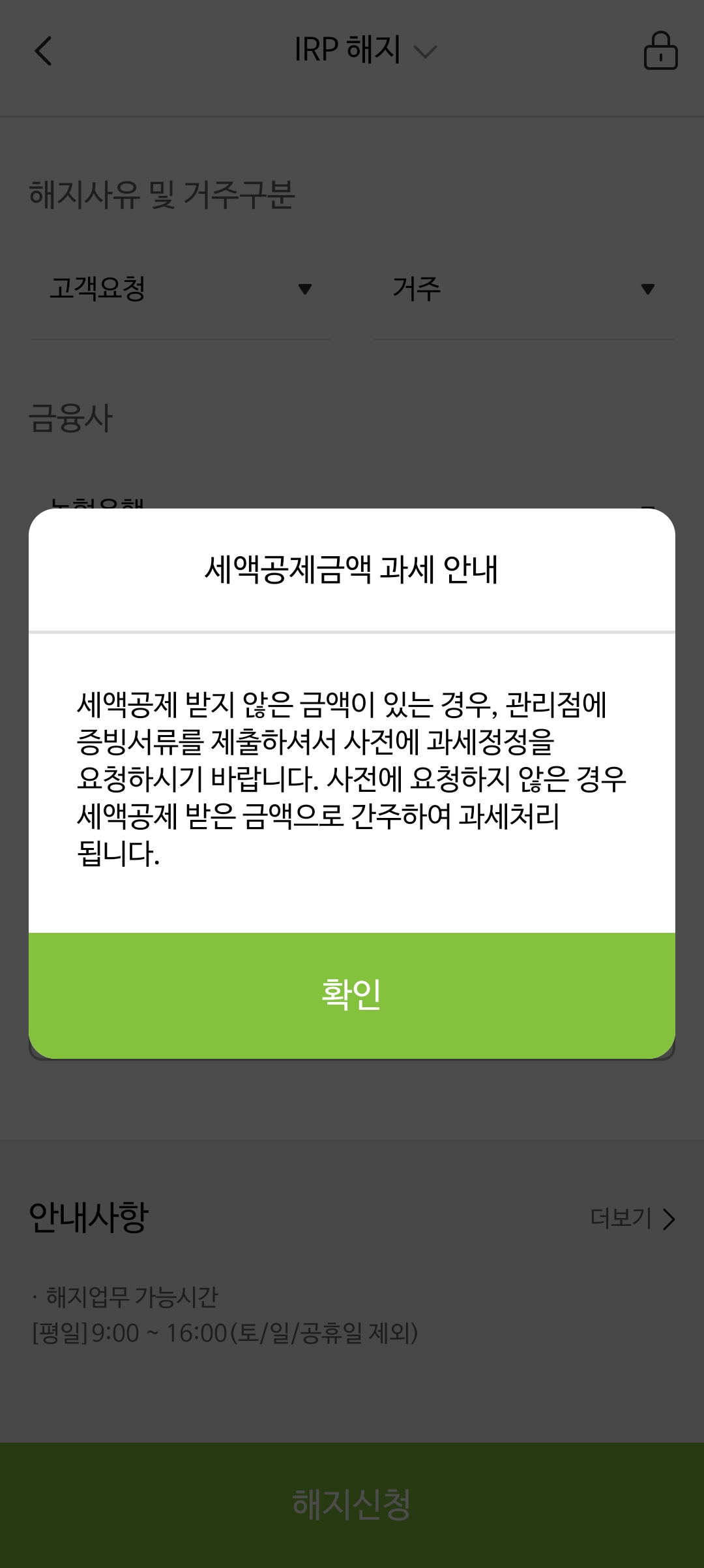 IRP 해지 사유와 거주지 구분, 입금받을 계좌번호 등의 정보를 기입하고 [해지신청]을 클릭한다. 다음으로 세액공제금액 과세 안내가 나타나는데 일단 세액공제받았다고 간주하고 처리한 후 나중에 자료 제출해서 환급받아야할 것 같다.(7월 이후)